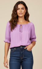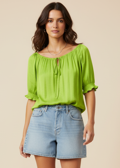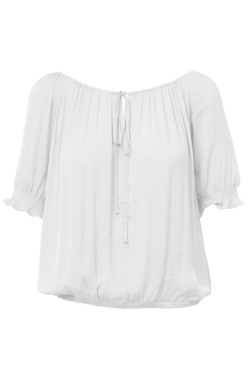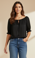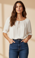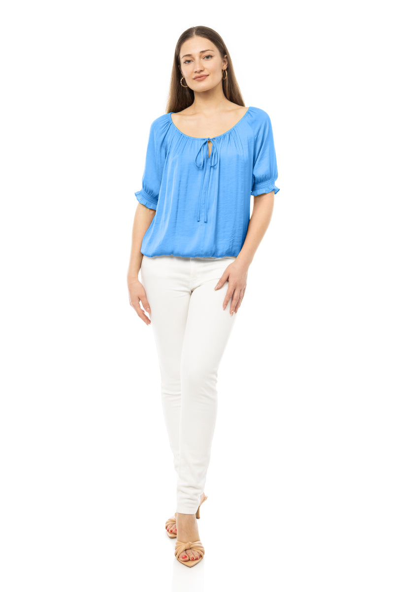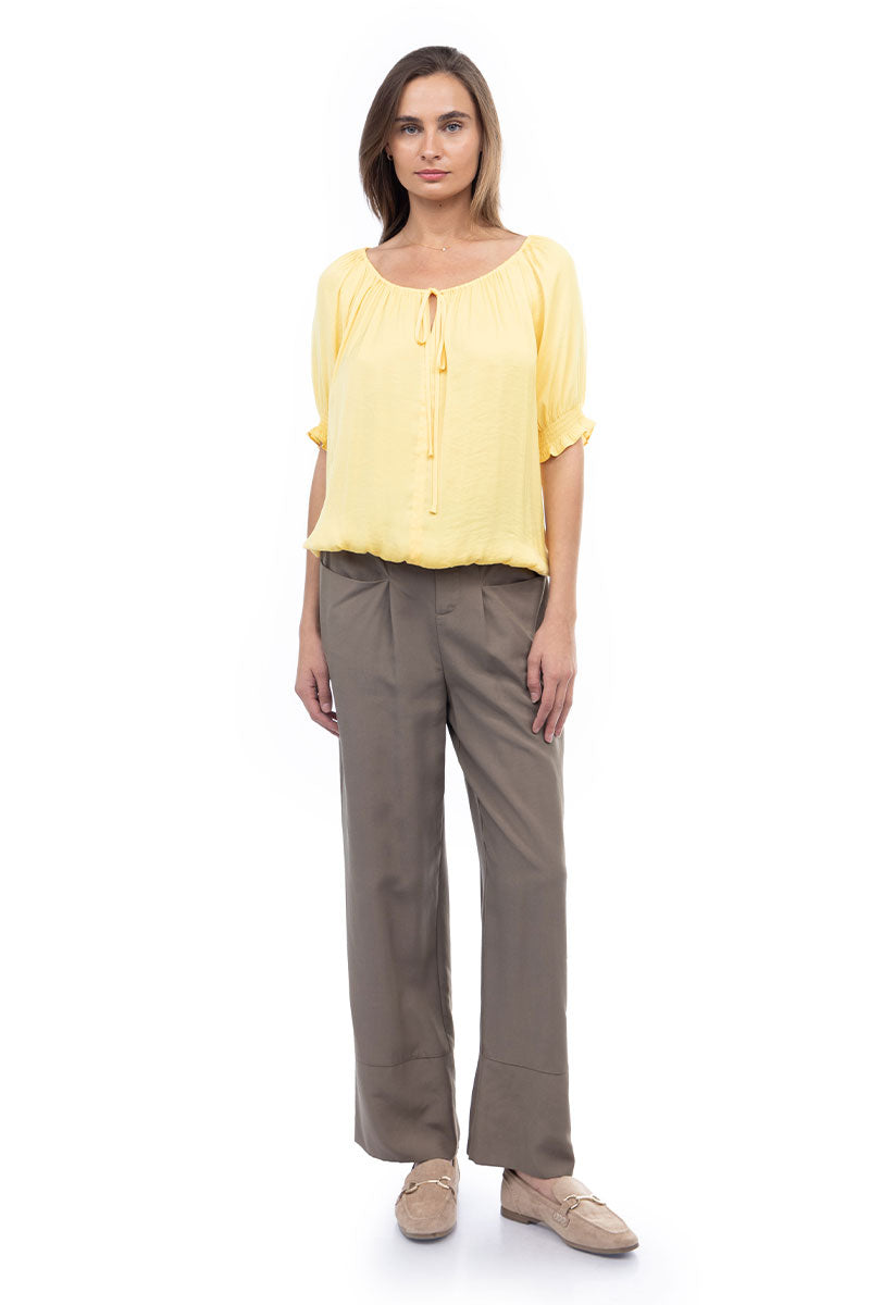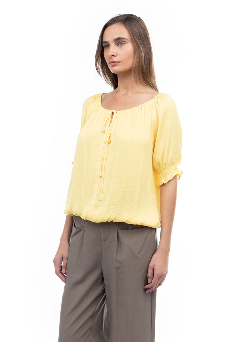 Elevate your ensemble with our Blouse featuring an elasticized waist and sleeves, complemented by a tie at the neckline. Perfect for effortlessly chic looks, this blouse is a versatile choice for various occasions, offering a blend of fashion and ease.