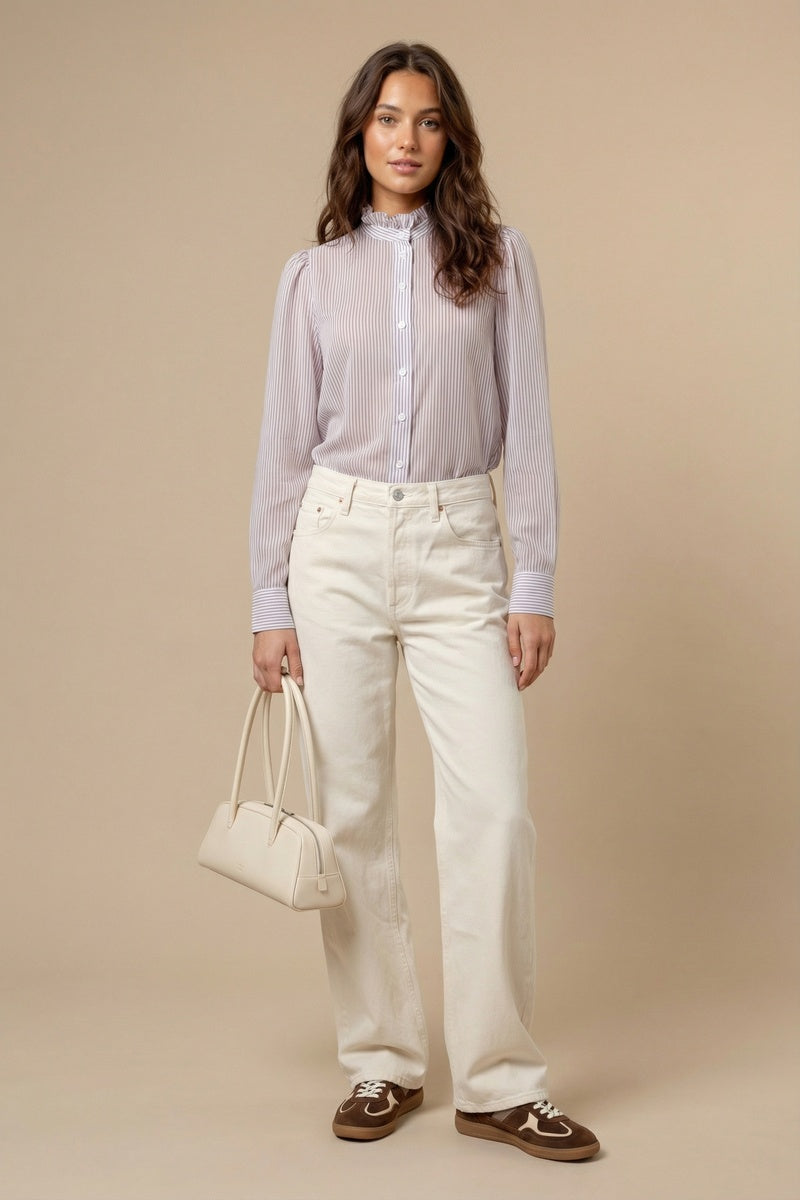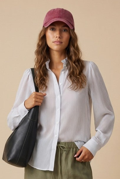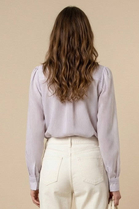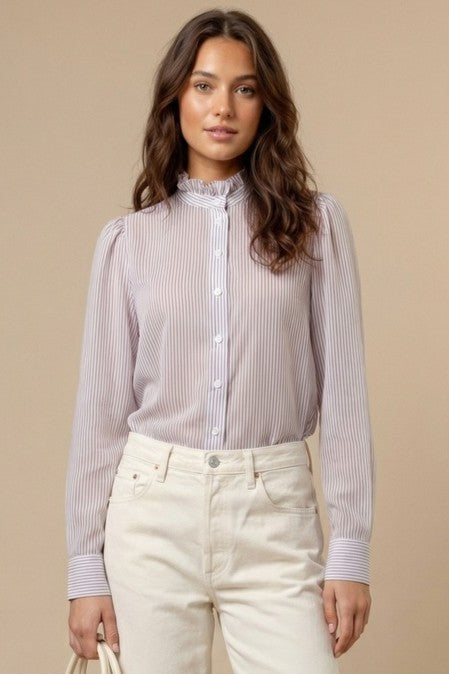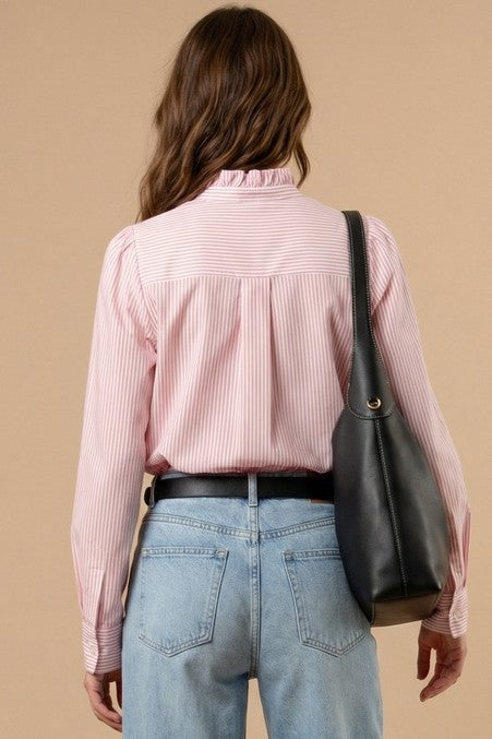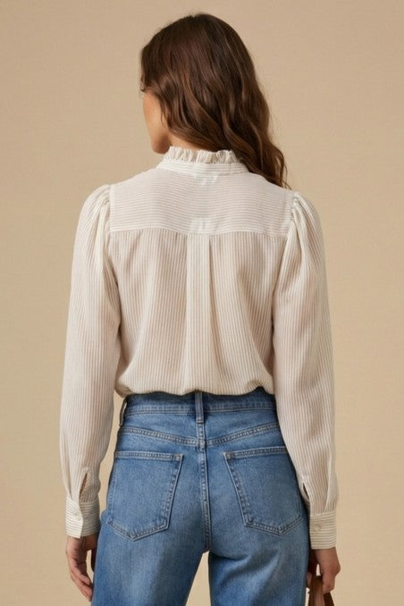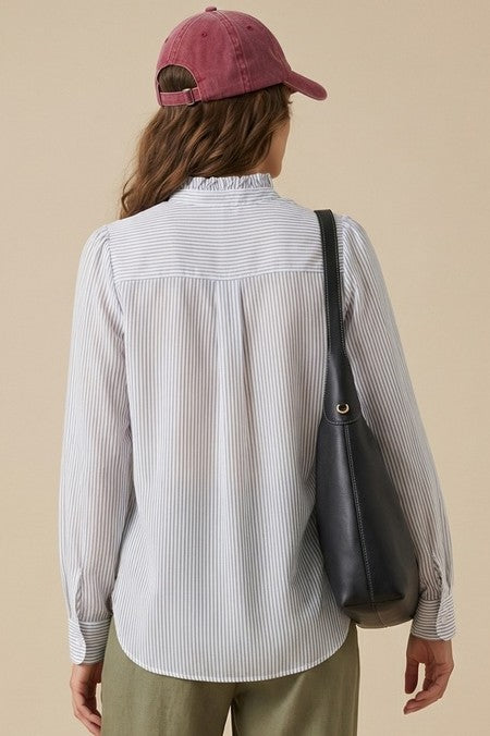 Ruffle Neck Striped Long Sleeve Blouse