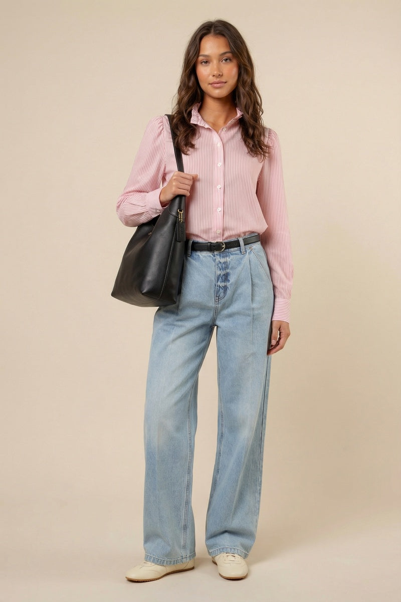 Long Sleeve Button-up Blouse With Round Neckline