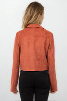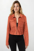 Elevate your wardrobe with this sleek zip-front collar faux suede jacket, striking the perfect balance between style and functionality. Designed to hit at the waist, this jacket offers a contemporary silhouette that effortlessly complements your look. The thoughtful addition of pockets on the chest not only enhances the visual appeal but also adds a practical element for storing your essentials.