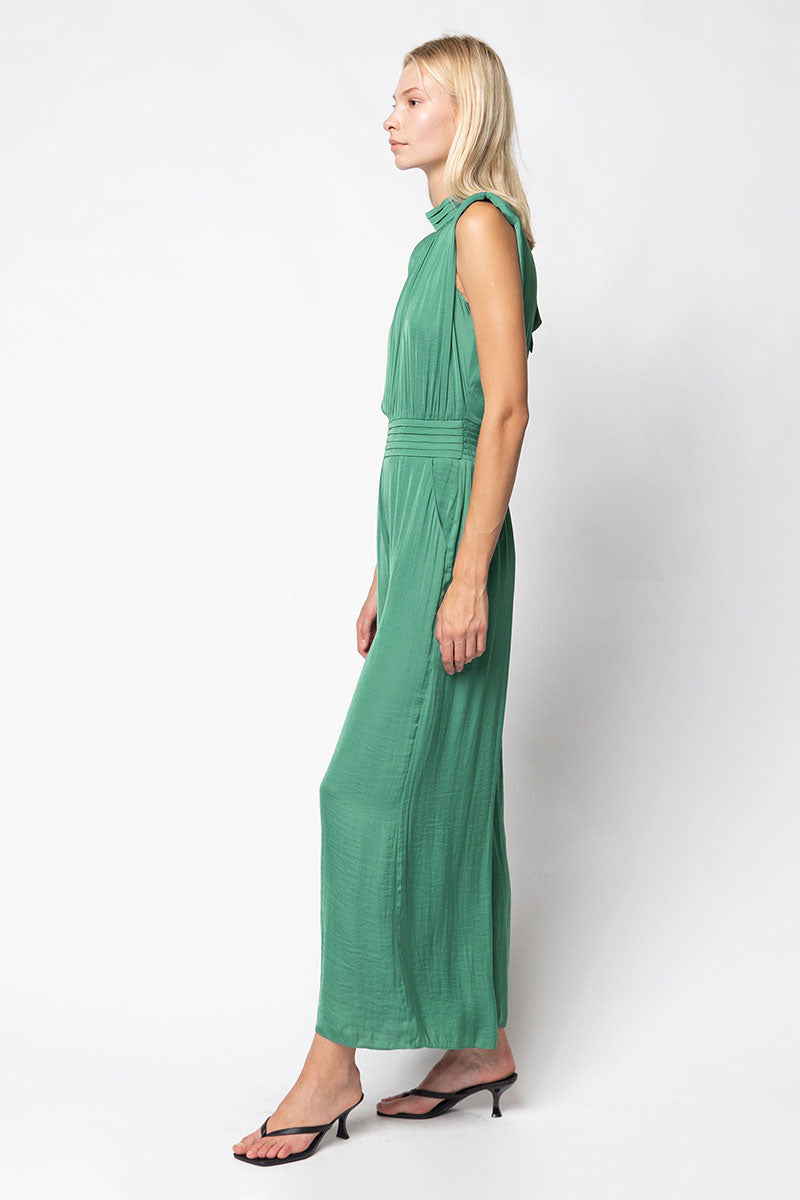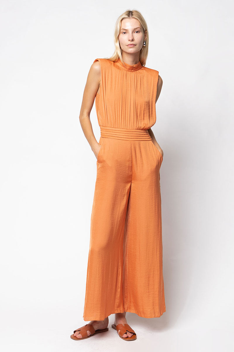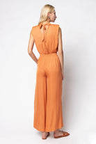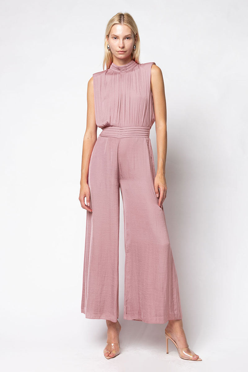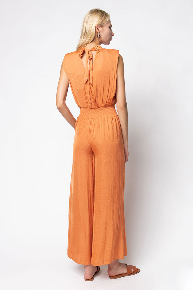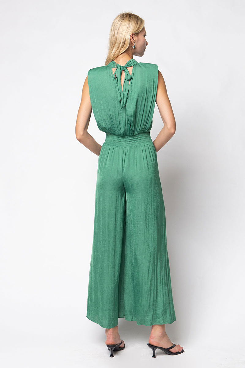 Wide Leg Jumpsuit With Tie Neck Detail And Shoulder Pads