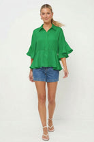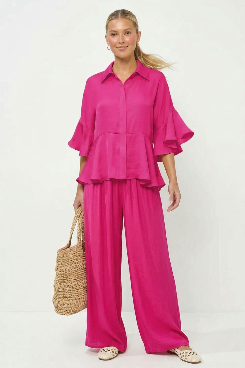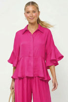 Elevate your wardrobe with this oversized 3/4 flutter sleeve peplum blouse. Crafted from silky smooth woven fabric, it delivers a flirty, feminine silhouette with playful flutter sleeves and a flattering peplum hem. Perfect for layering or wearing solo, this versatile piece transitions effortlessly from casual to polished.