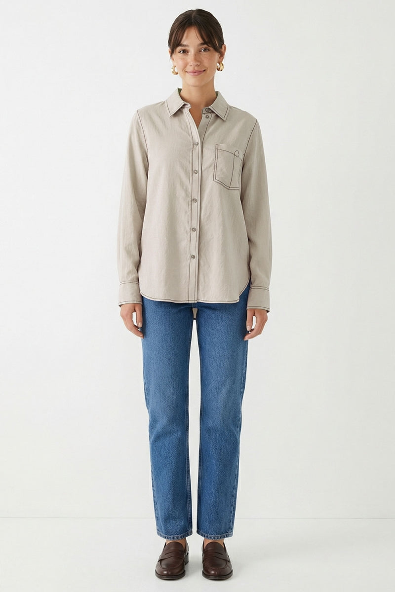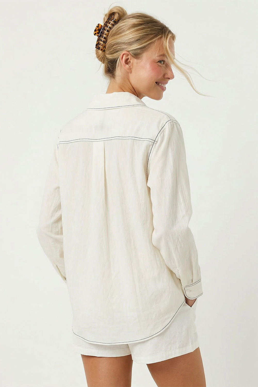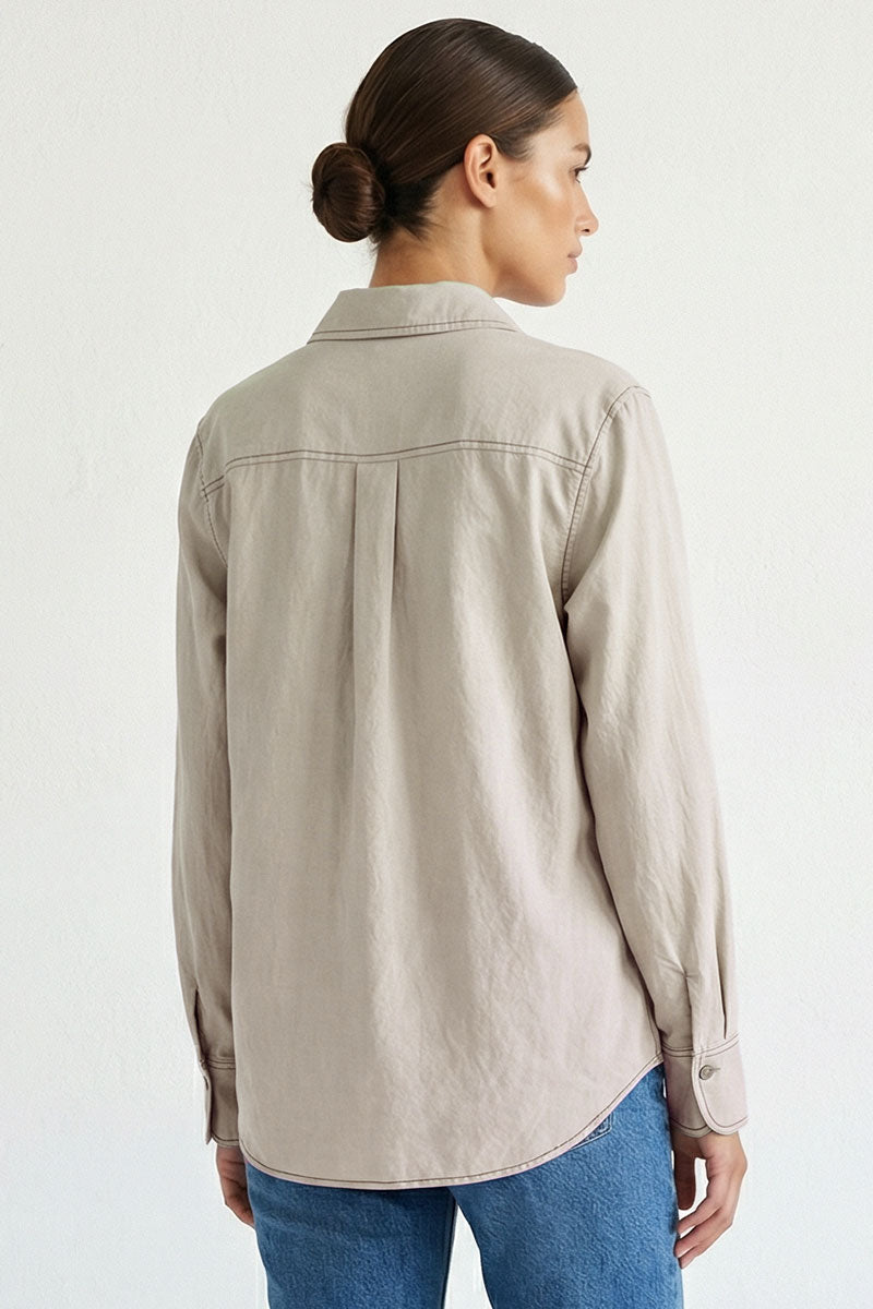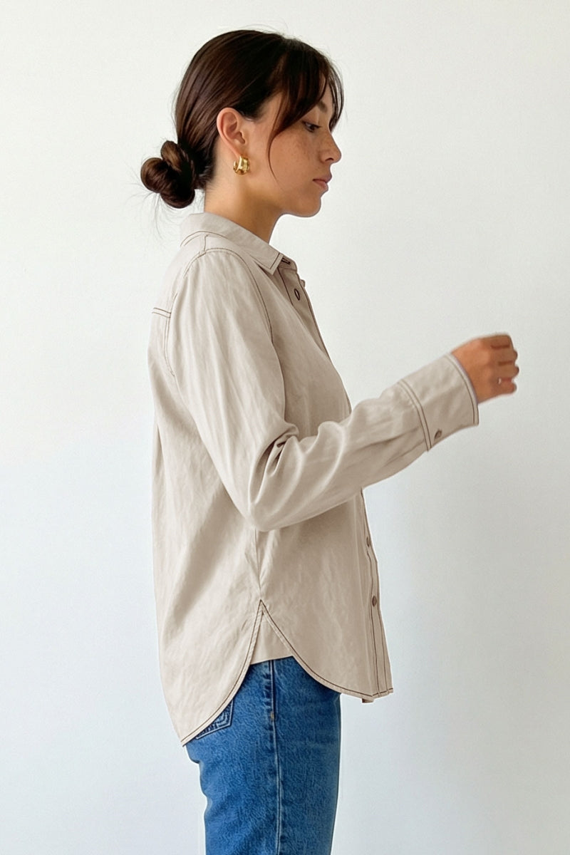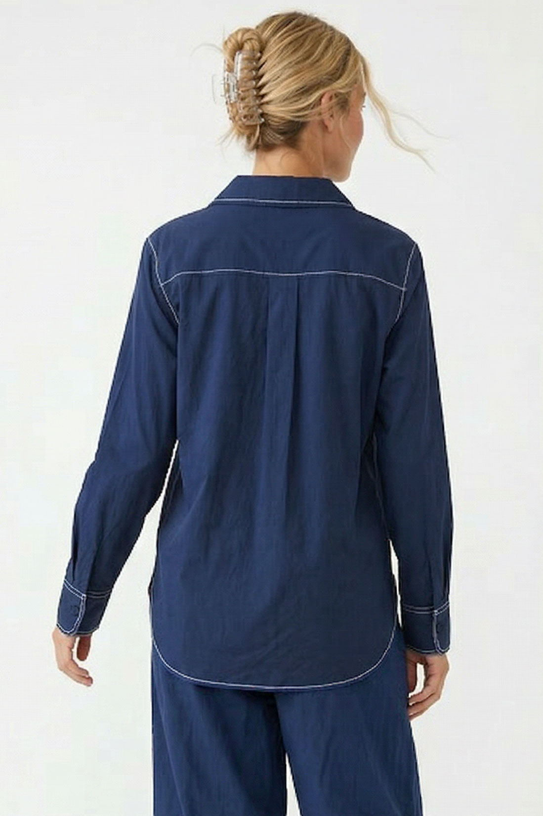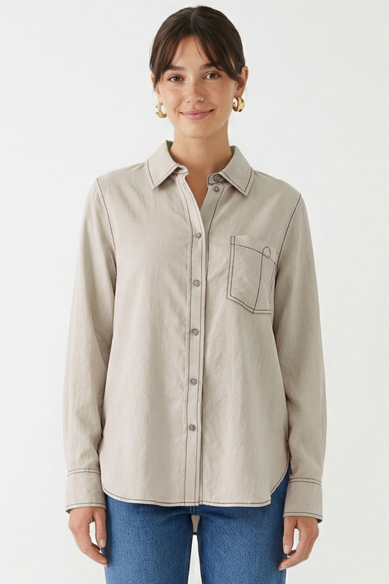 Elevate your wardrobe with this sophisticated long sleeve button down featuring subtle crinkle texture and contrast stitching. The unique design on the front pocket adds distinctive style detail.