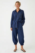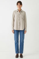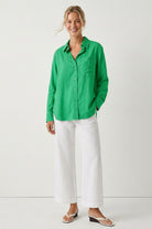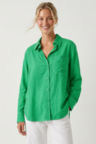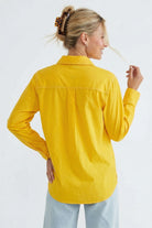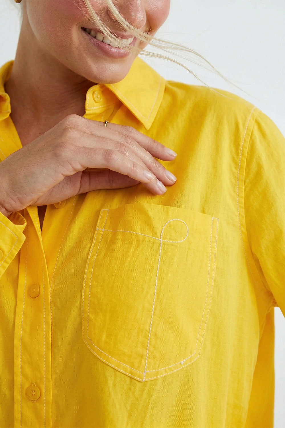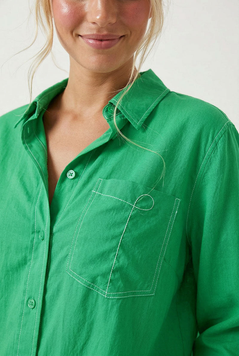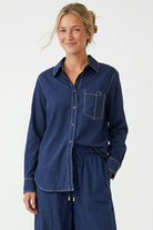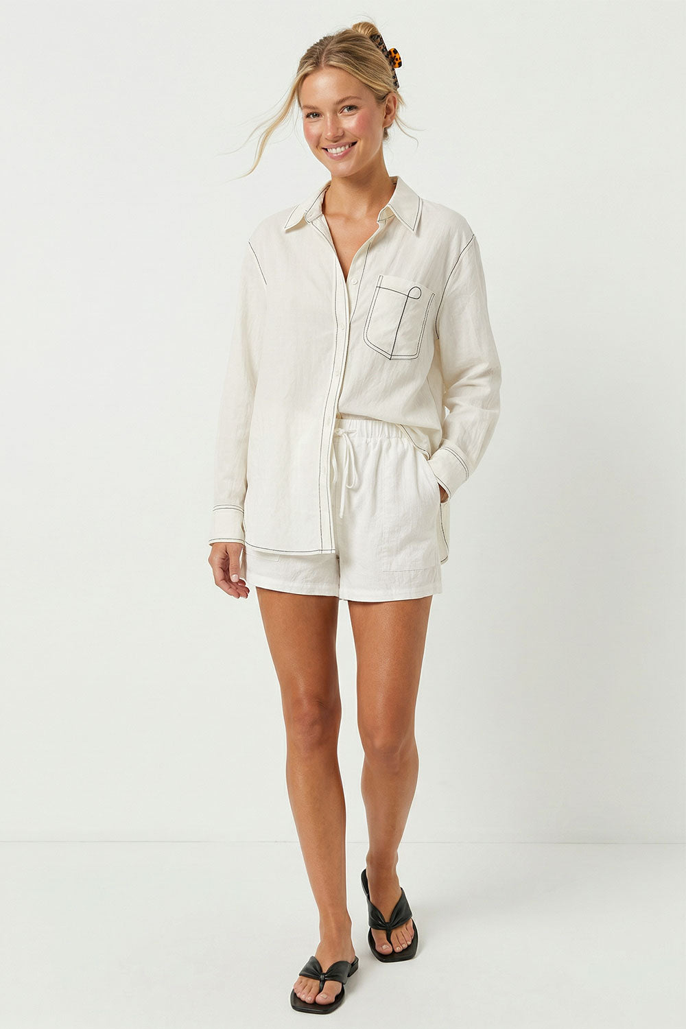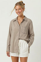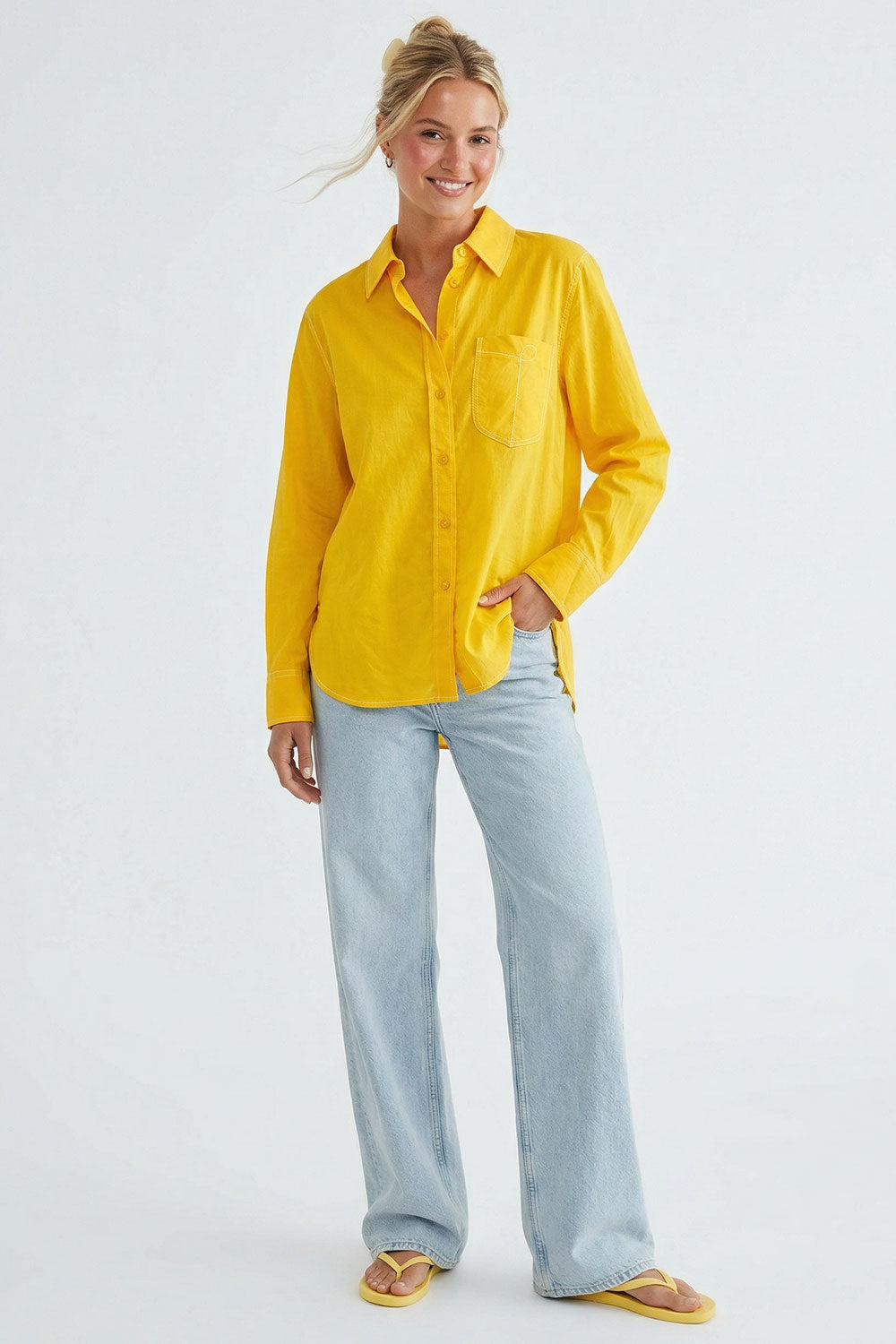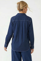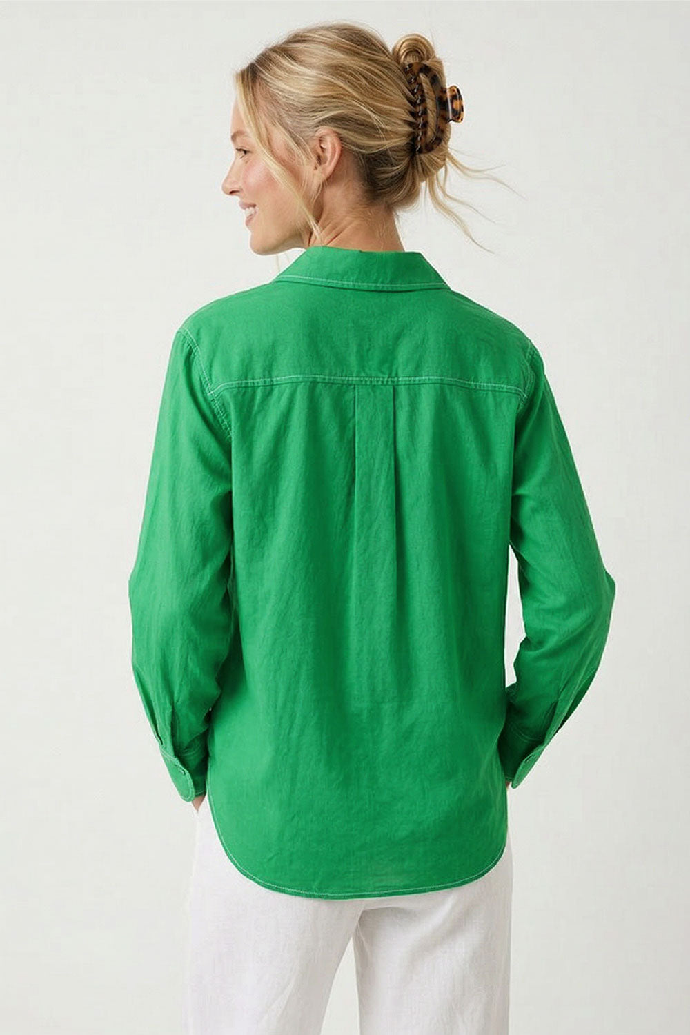 Elevate your wardrobe with this sophisticated long sleeve button down featuring subtle crinkle texture and contrast stitching. The unique design on the front pocket adds distinctive style detail.