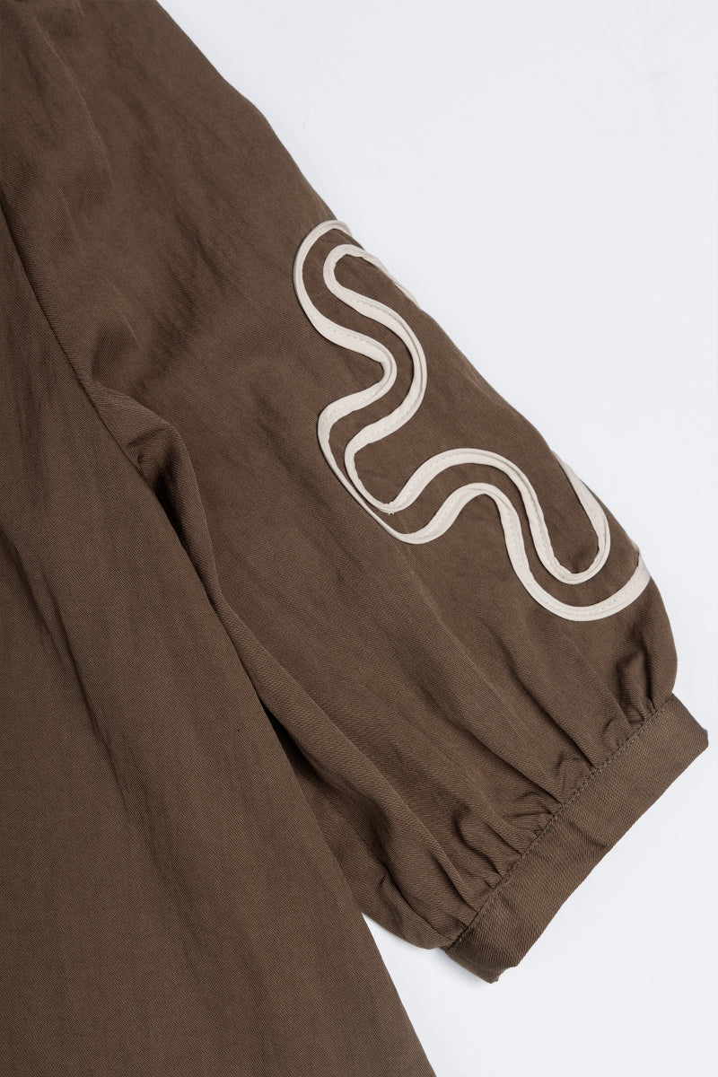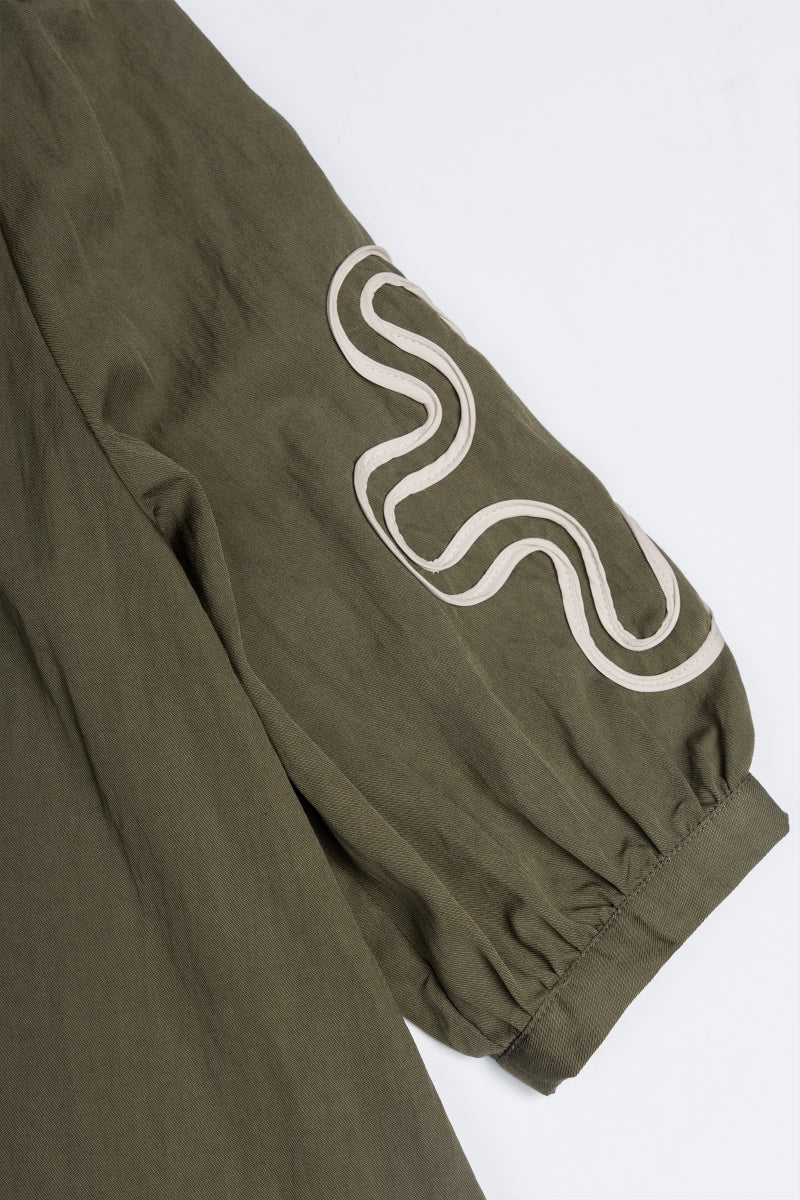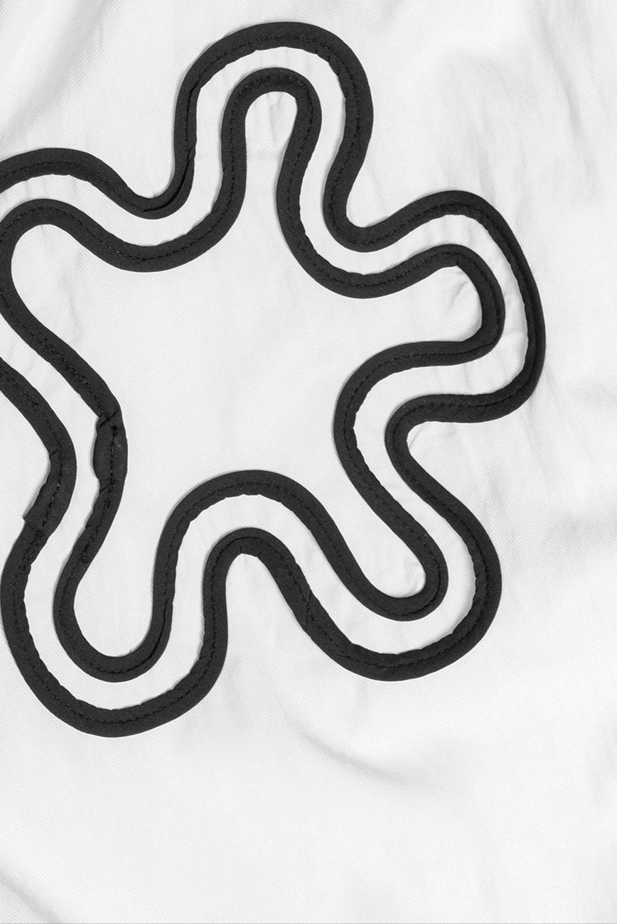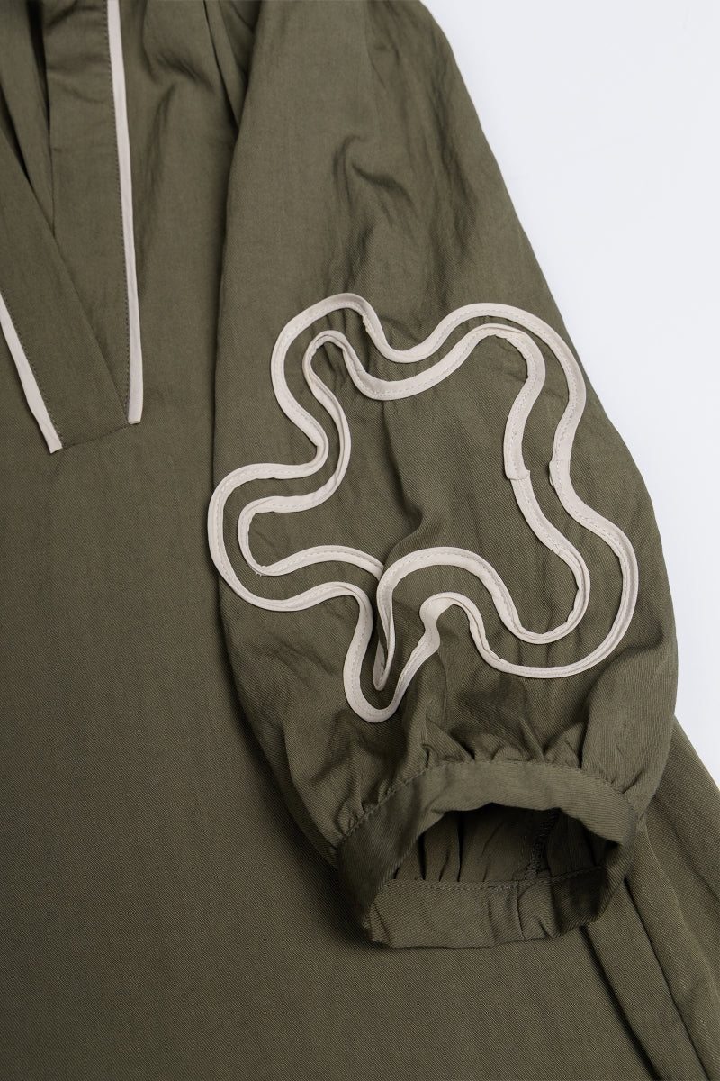 ╴Abstract flower appliqué on the sleeves in contrast colors for an artistic touch.