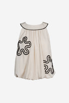 ╴Abstract flower appliqué in contrast colors for an artistic touch.
