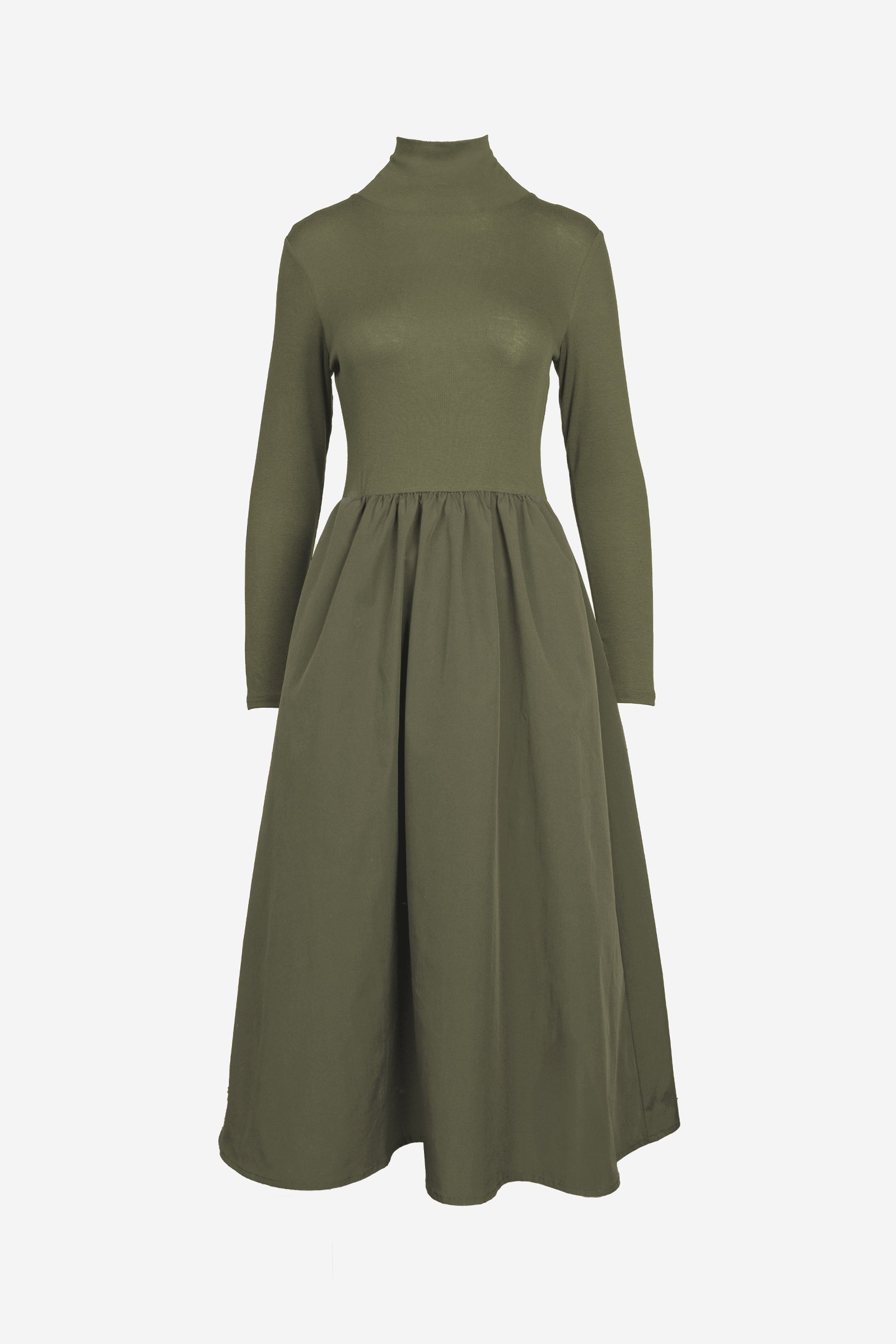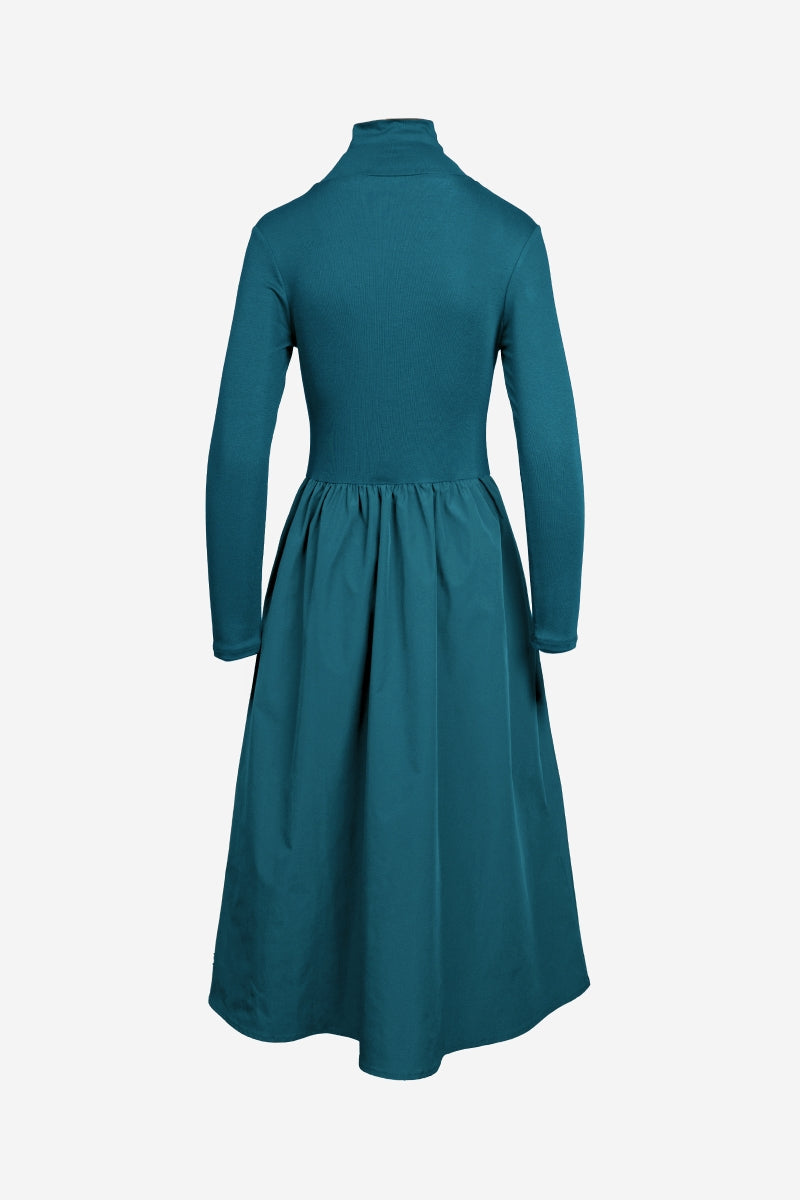 ╴Mock neckline and long sleeves balance the feminine midi silhouette.