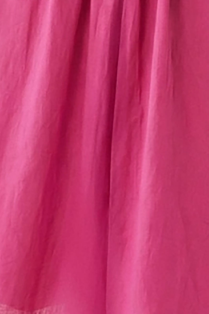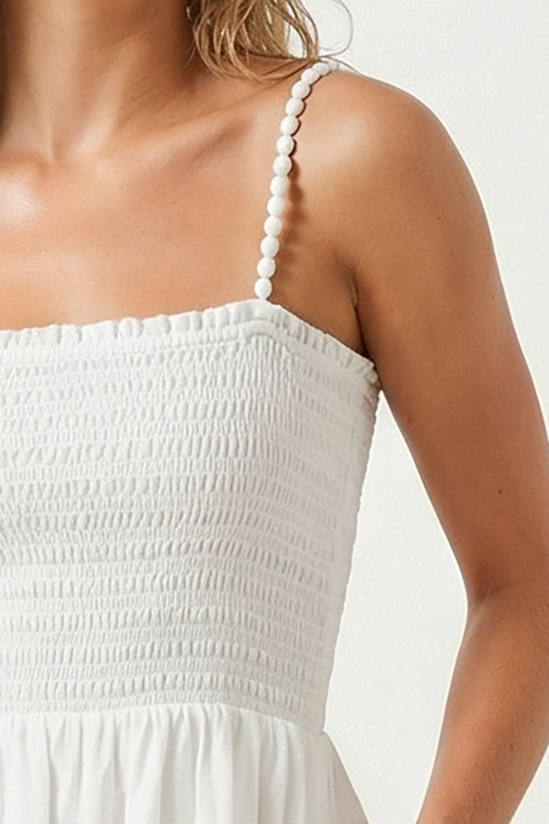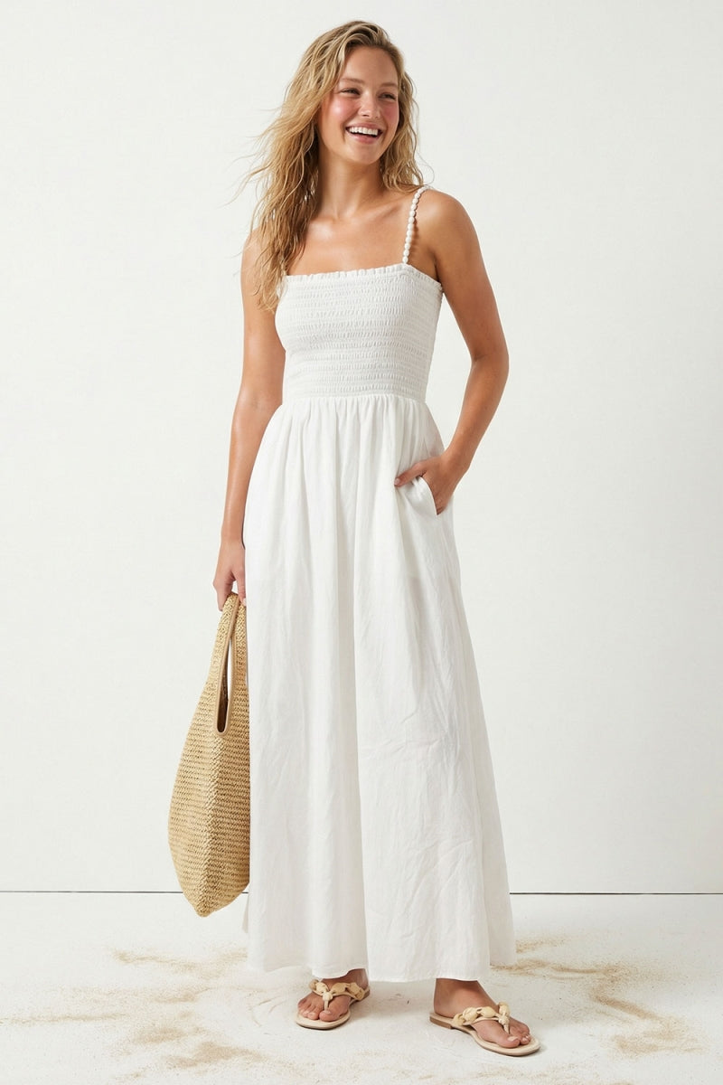 Featuring a fitted smocking bodice that flatters the silhouette, adjustable straps adorned with plush pom poms add a charming touch. The lightweight crinkle fabric drapes beautifully while maintaining breathability—ideal for warm weather. Practical side pockets and a lined interior enhance functionality, while the flowing maxi length creates a refined, versatile piece perfect for beach getaways and summer occasions.