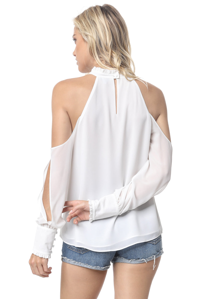 Ruffle Mock Neck Cold Shoulder Blouse