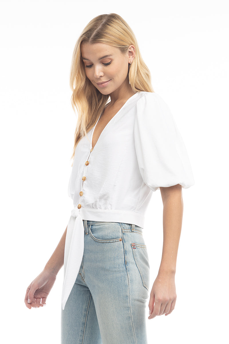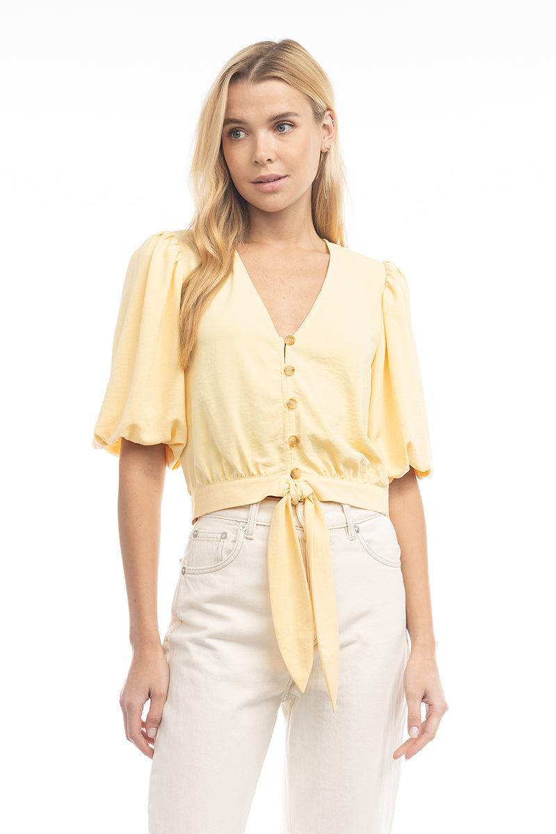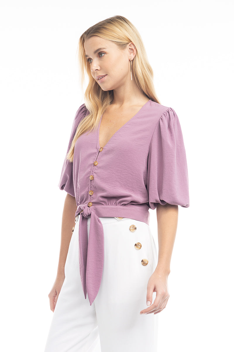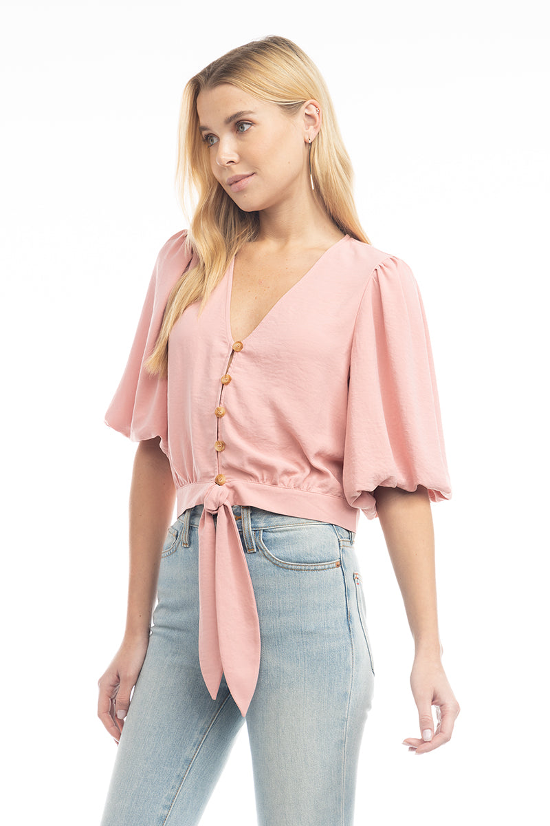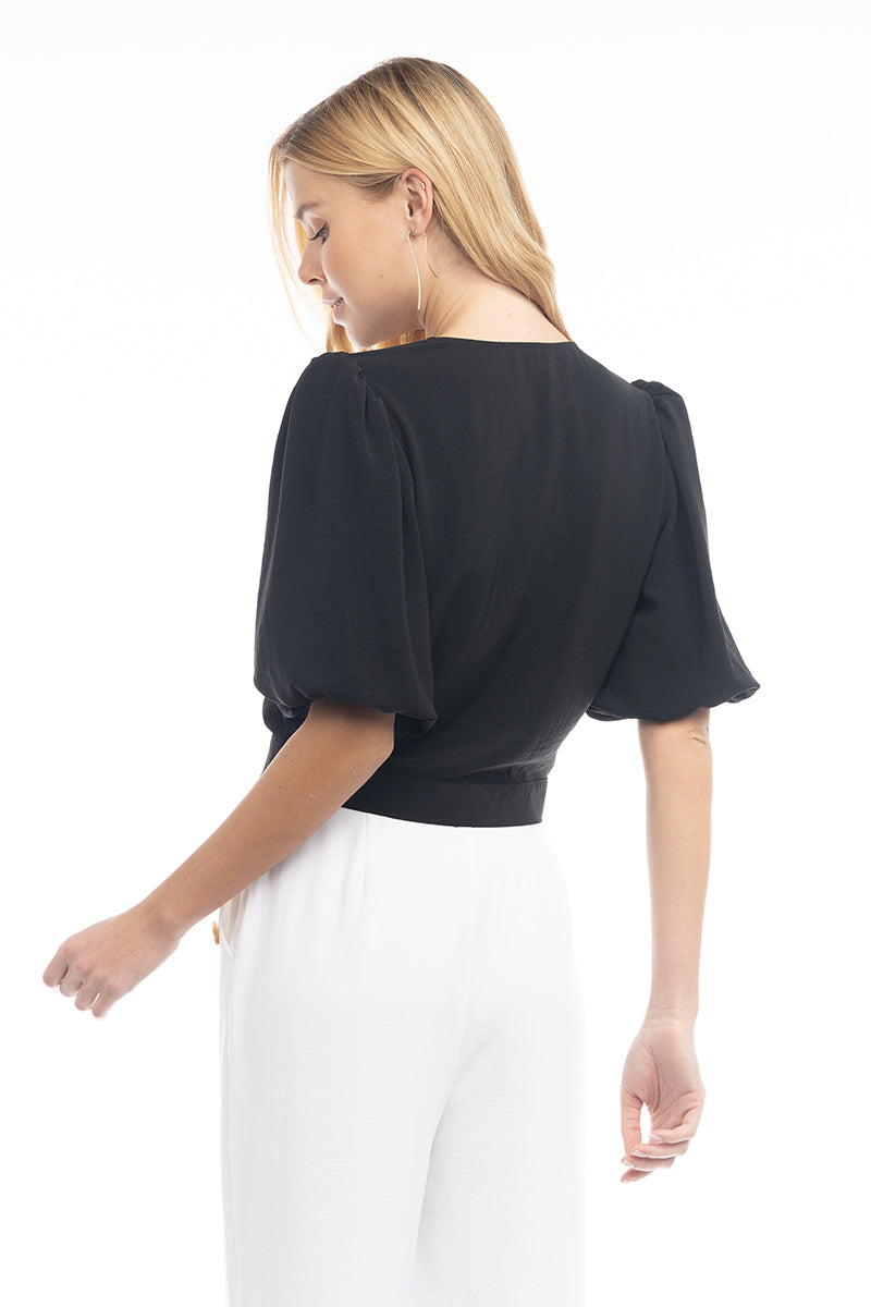 3/4 Balloon Sleeve Cropped Tie Waist Blouse