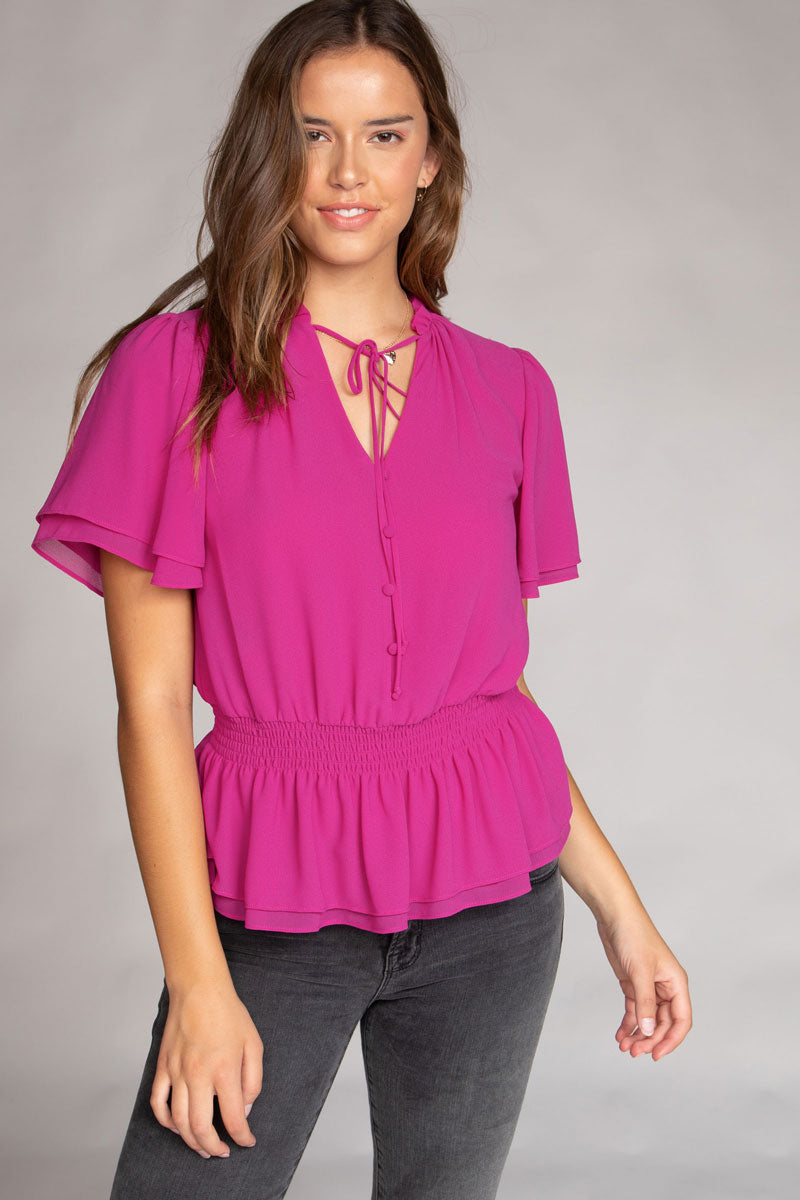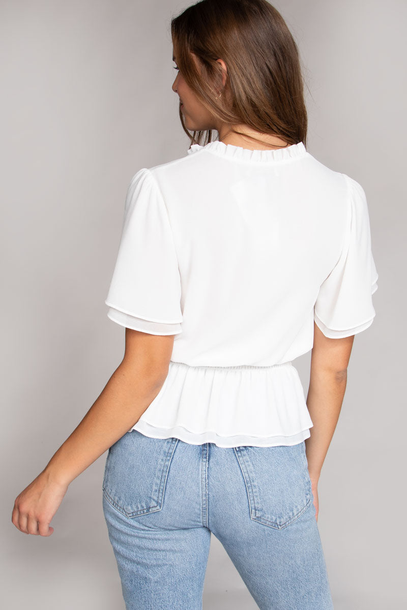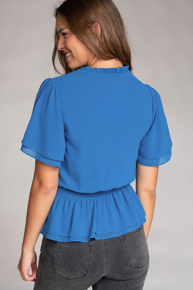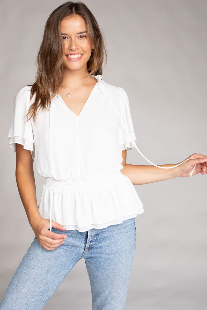╴Flowy bell sleeves and cropped length add a breezy, feminine touch
