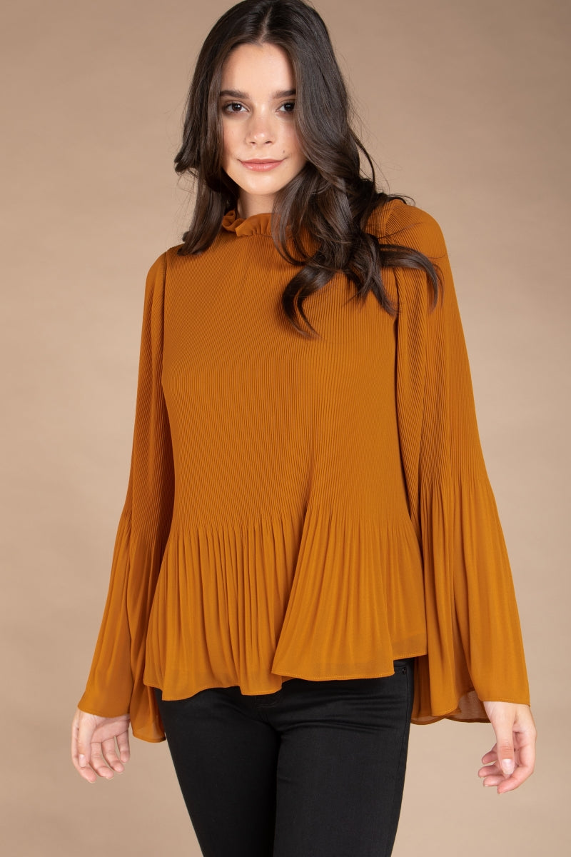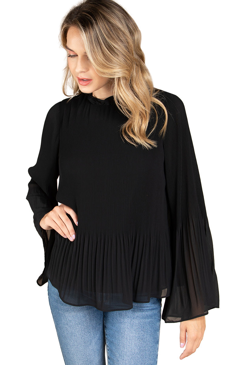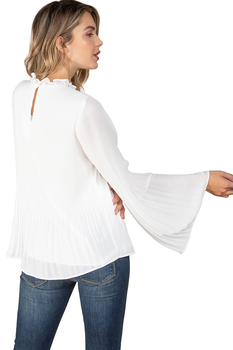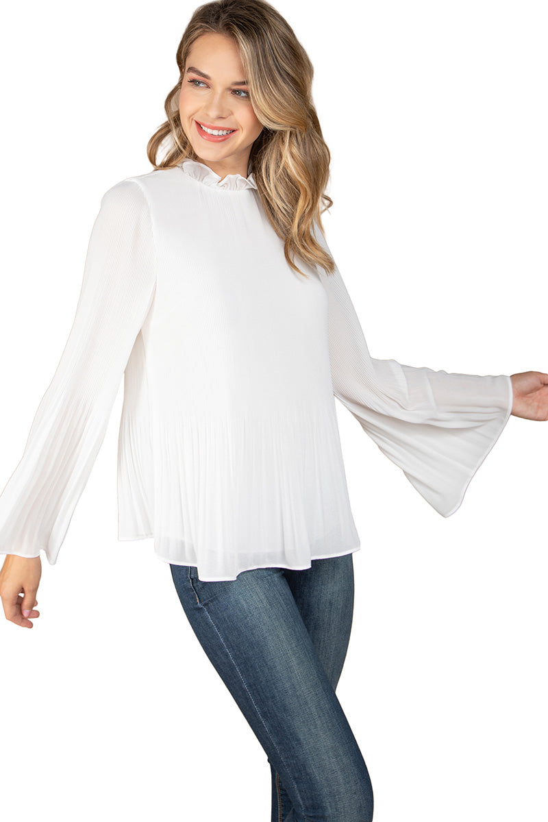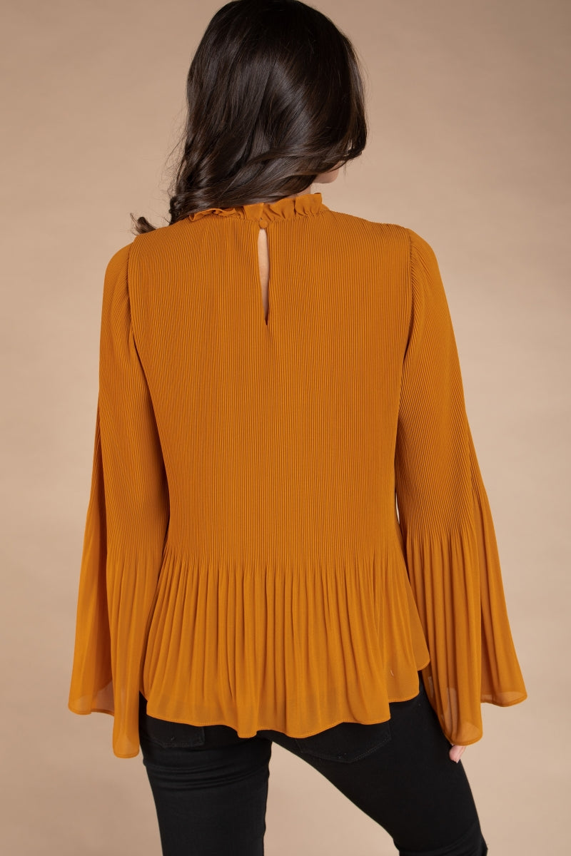 ╴Elegant crystal pleating throughout with graceful long sleeves for added sophistication.
