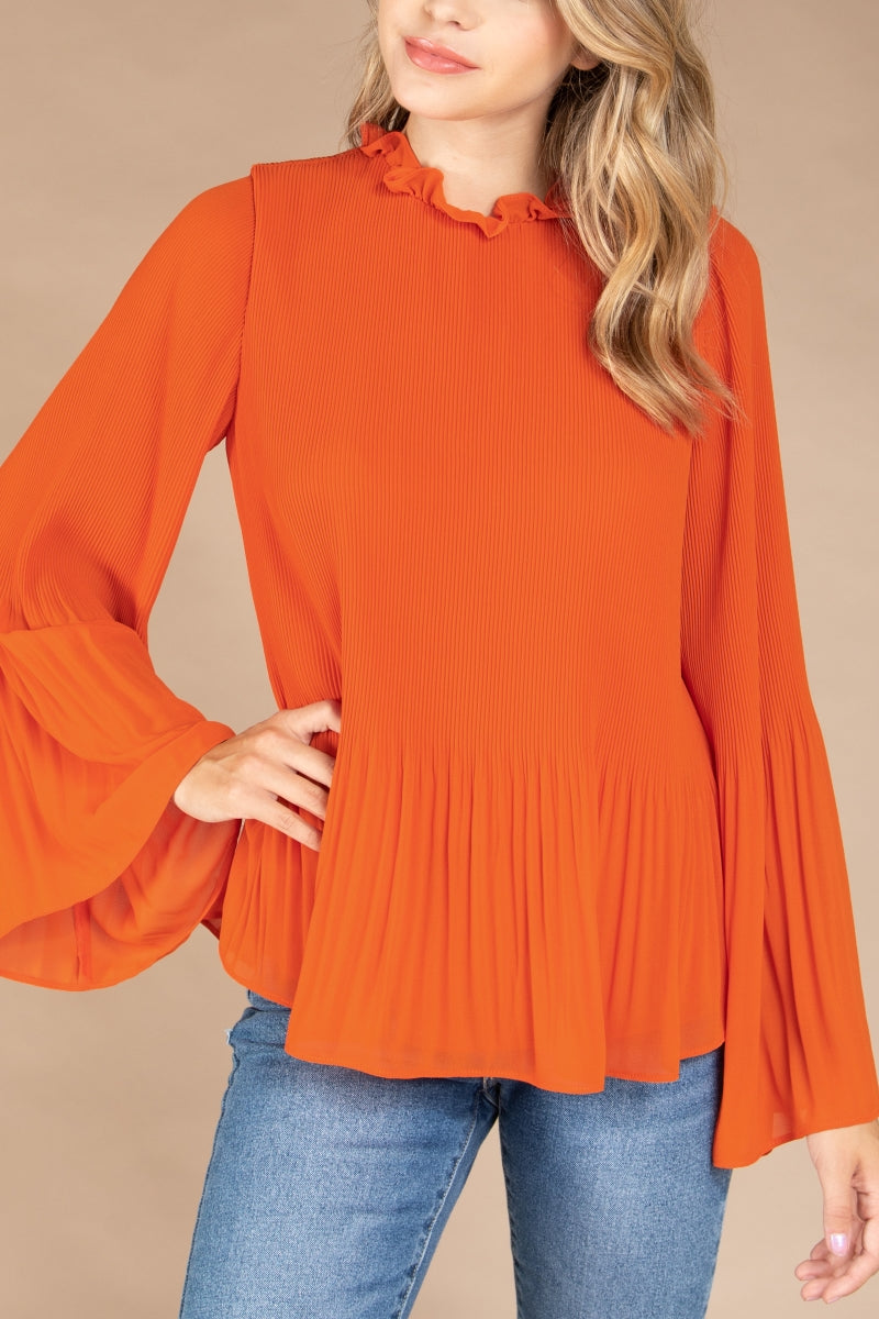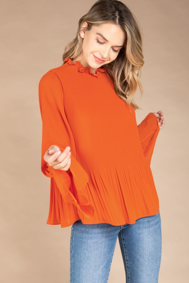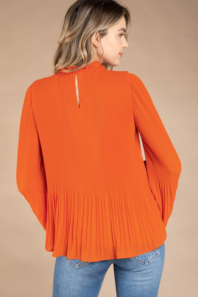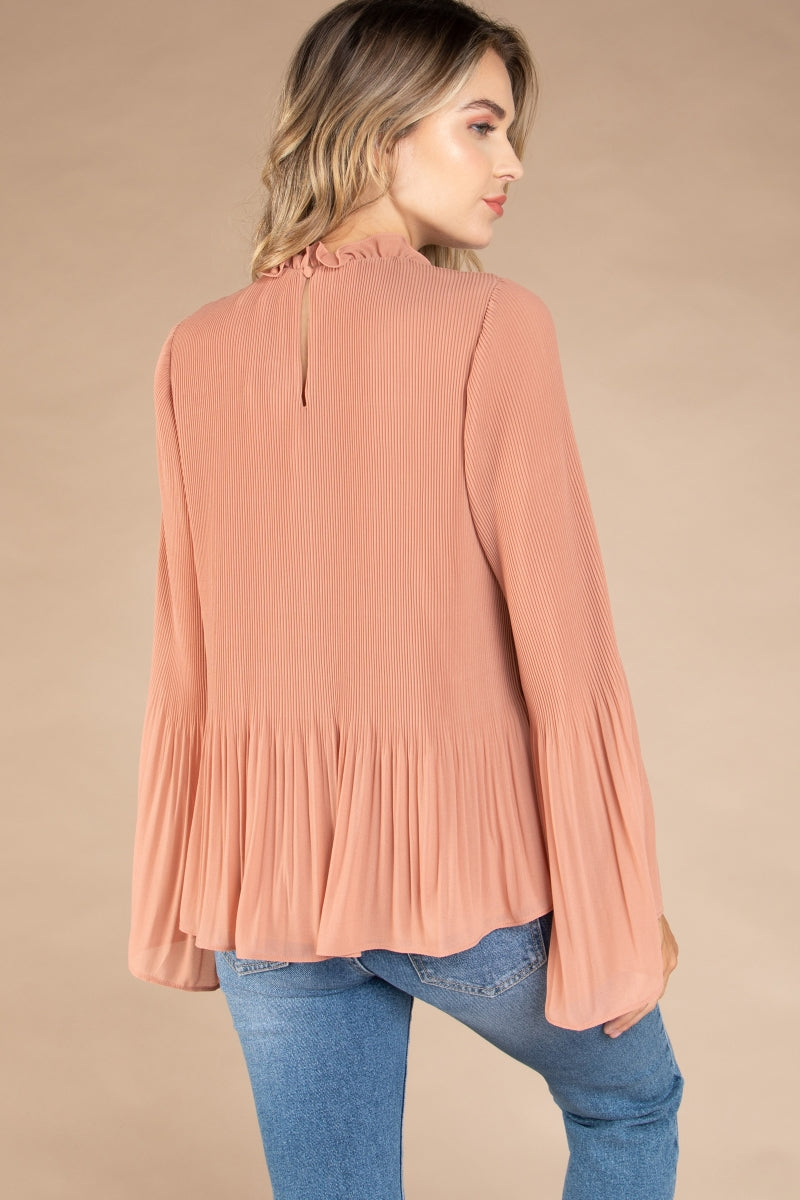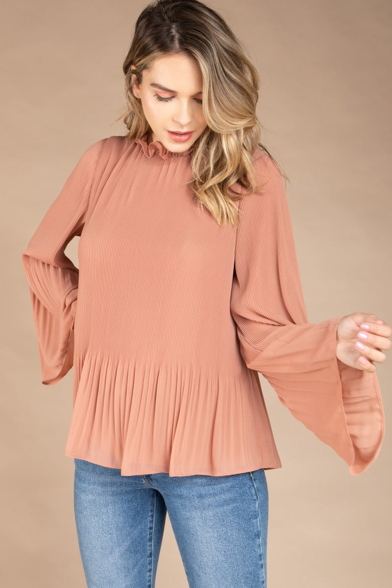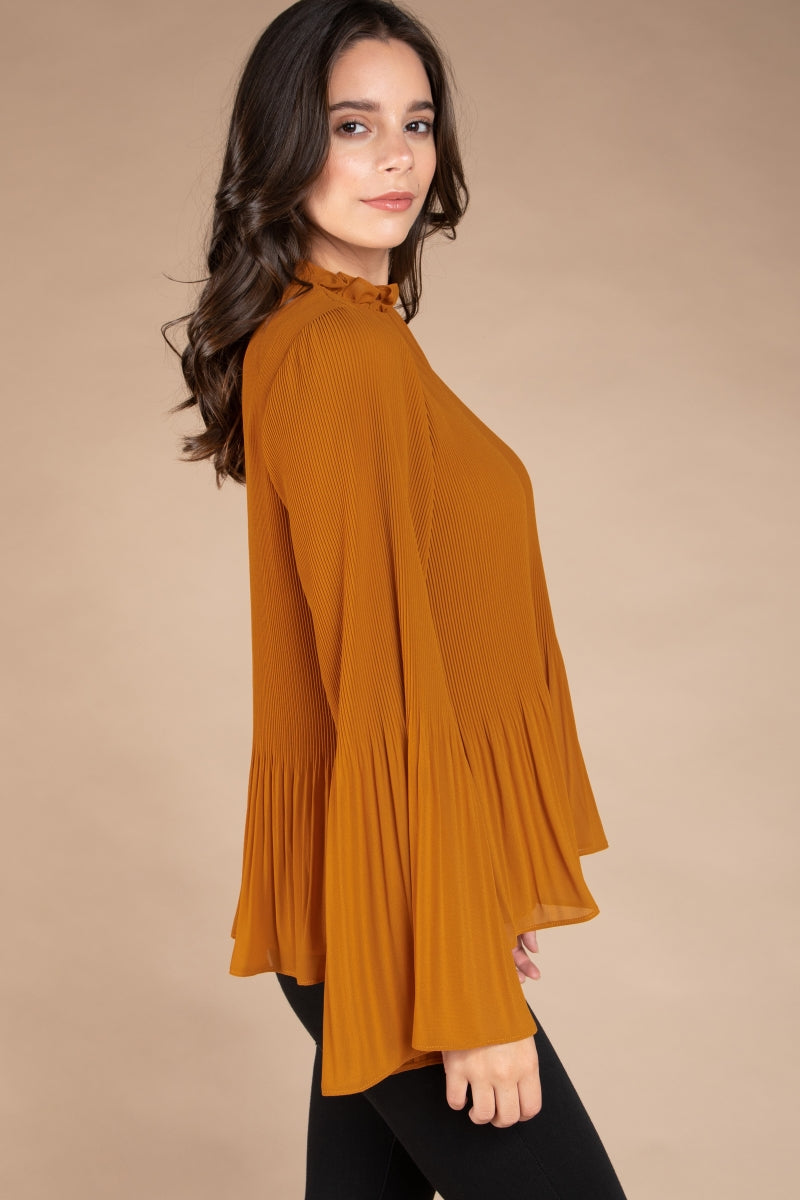 ╴Elegant crystal pleating throughout with graceful long sleeves for added sophistication.