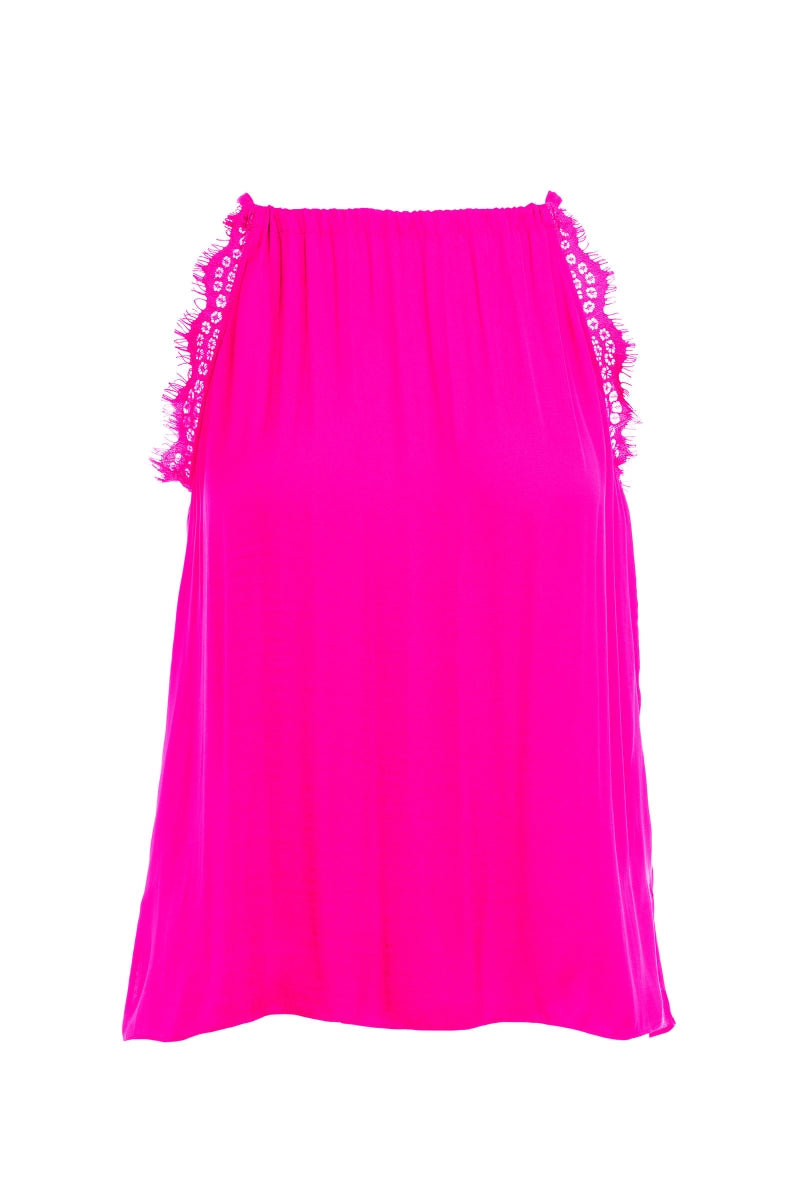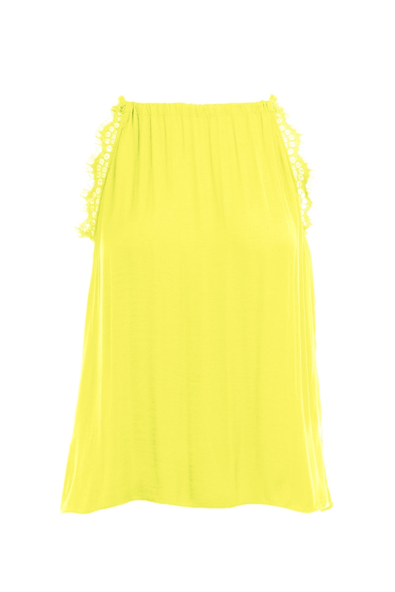 ╴Lightweight woven fabric with delicate eyelash lace trim at the armholes.