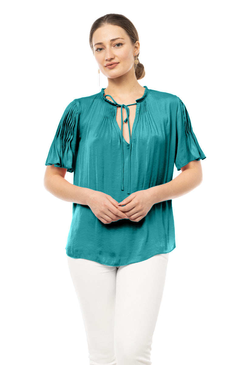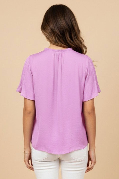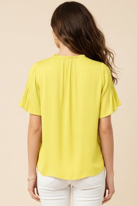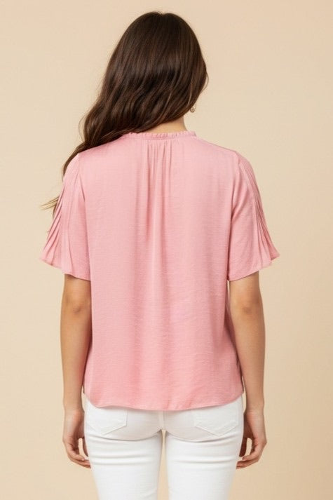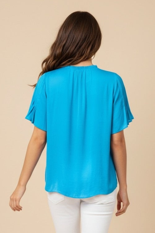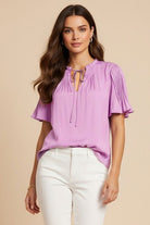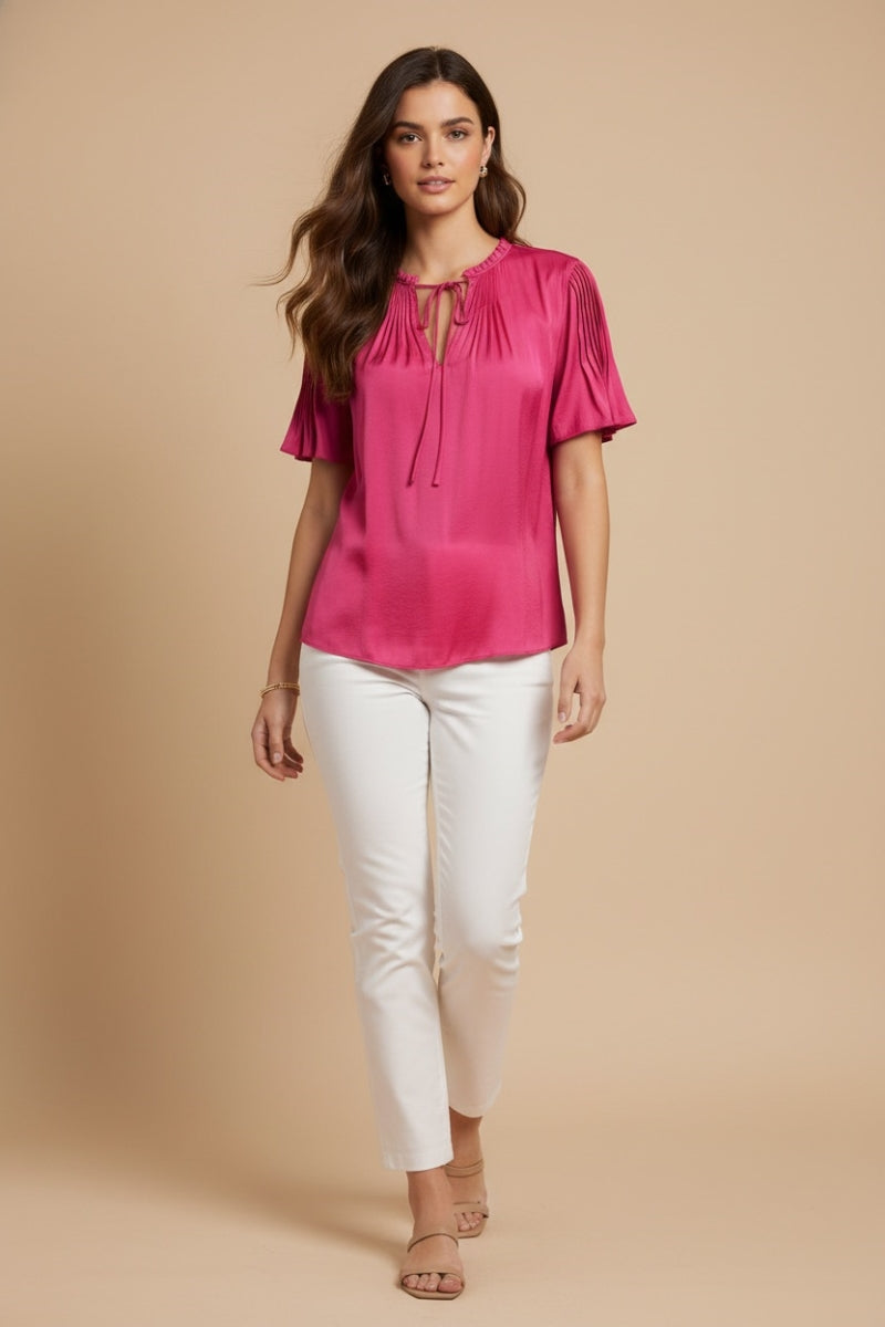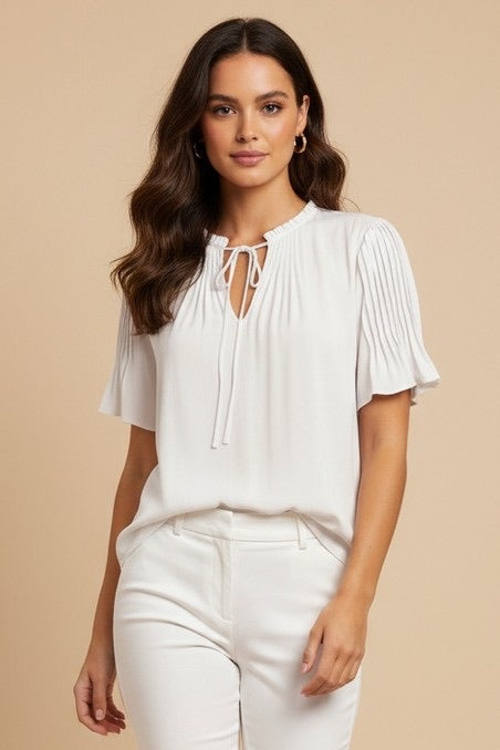 The Flutter Elbow Sleeve Blouse with Pintuck Details brings a touch of delicate elegance to your wardrobe. Featuring soft flutter sleeves and intricate pintuck detailing, this blouse offers a refined, feminine silhouette. Perfect for both casual and dressy occasions, it adds subtle texture and charm to any outfit.