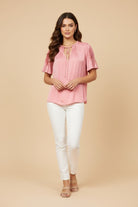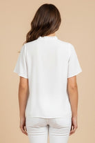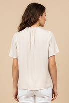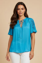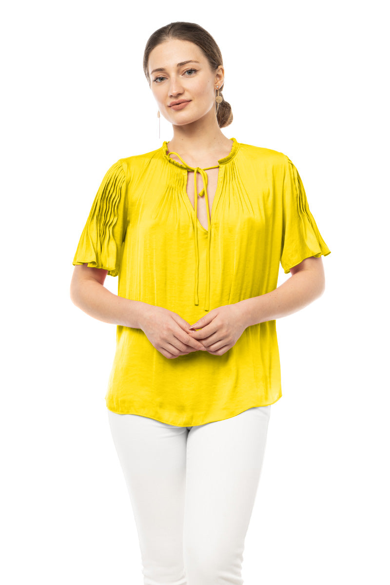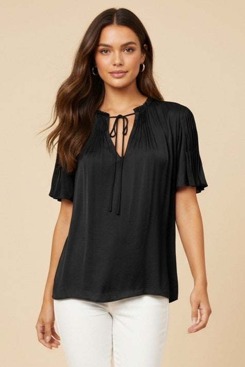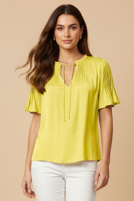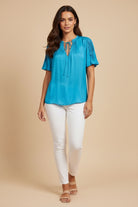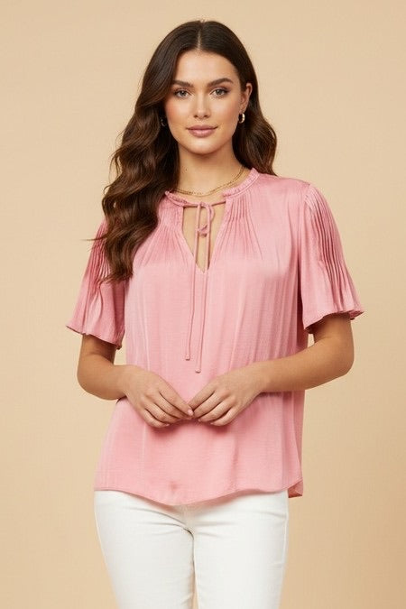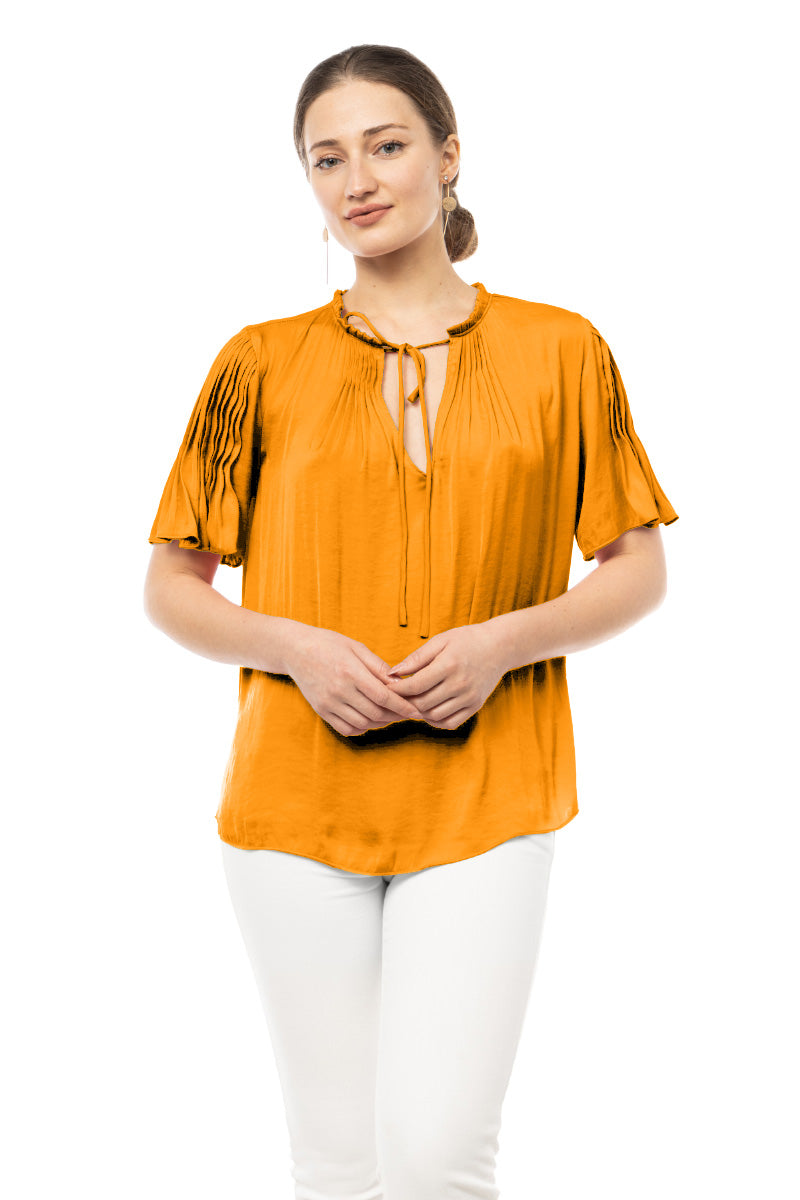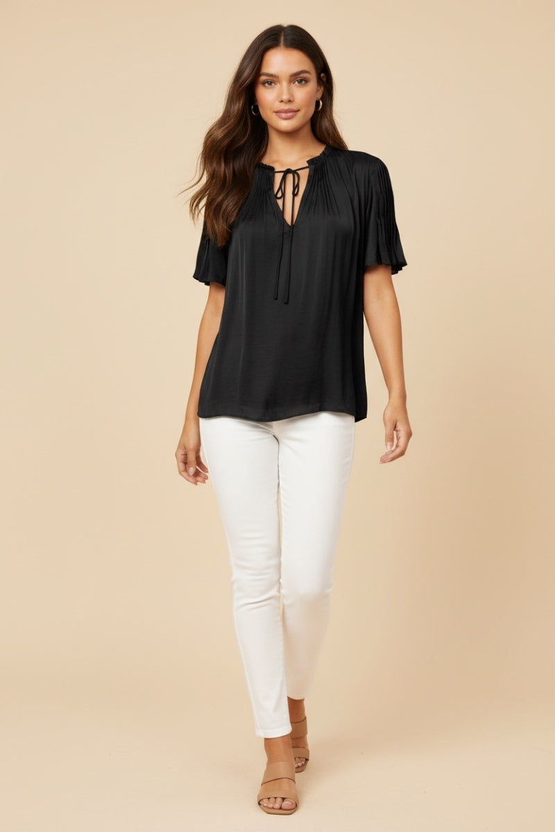 The Flutter Elbow Sleeve Blouse with Pintuck Details brings a touch of delicate elegance to your wardrobe. Featuring soft flutter sleeves and intricate pintuck detailing, this blouse offers a refined, feminine silhouette. Perfect for both casual and dressy occasions, it adds subtle texture and charm to any outfit.