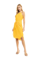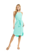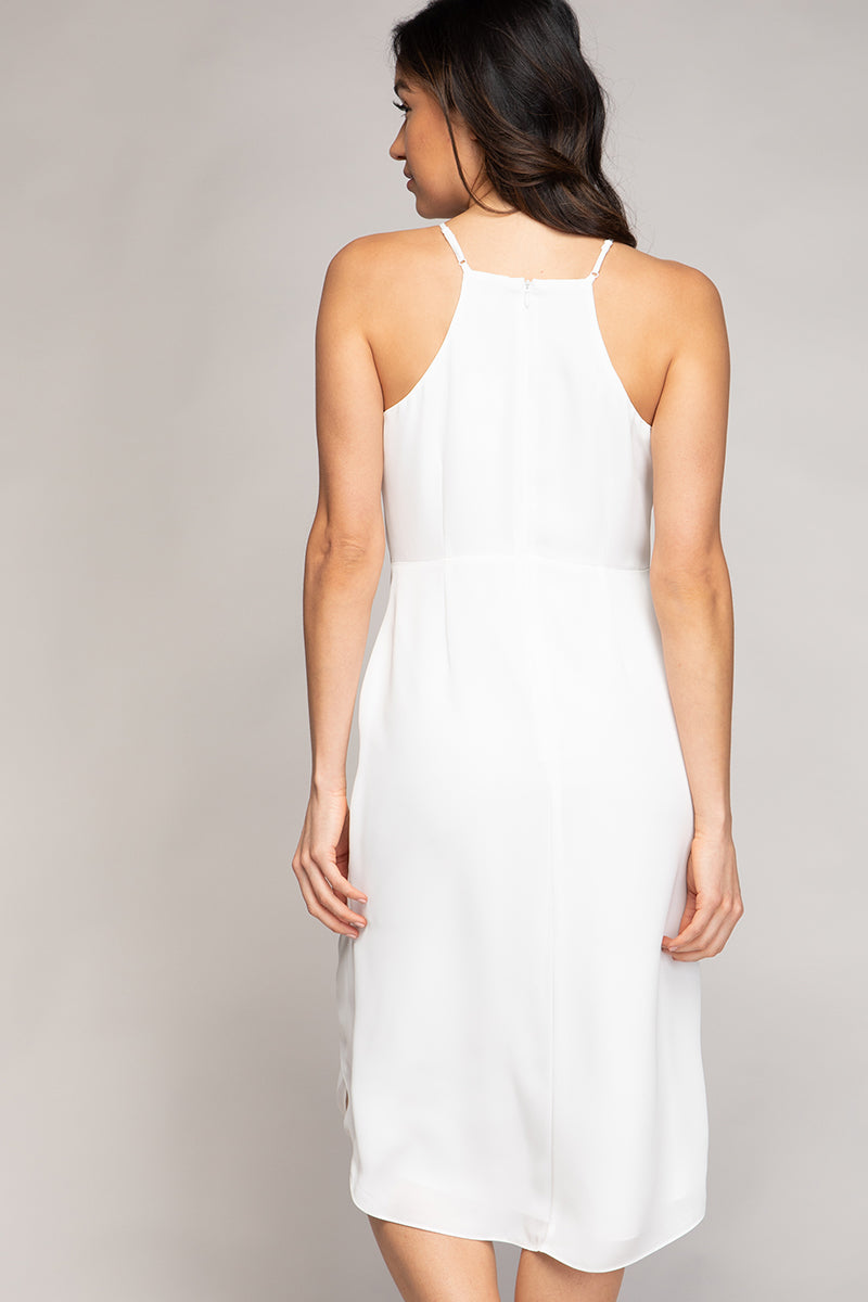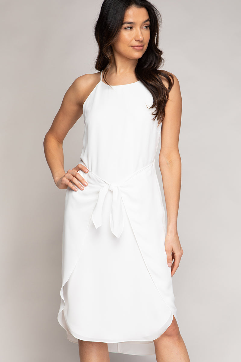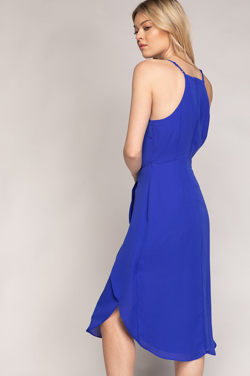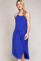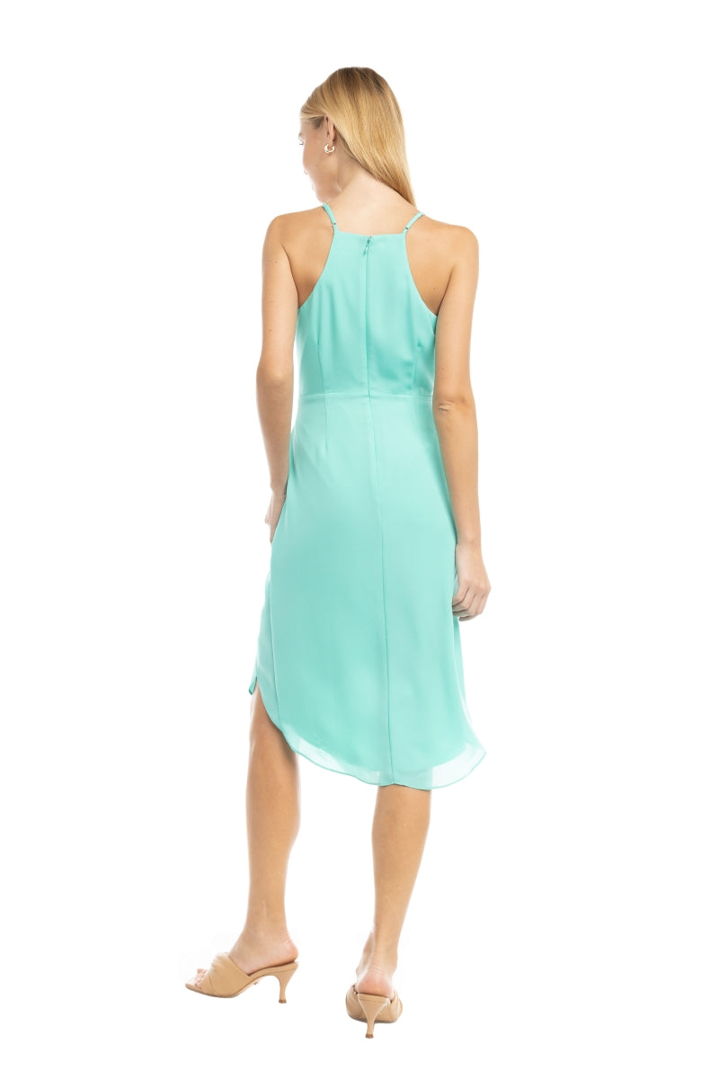 This sleeveless midi dress boasts a high neck and an overwrapped front, striking a perfect balance between sophistication and modern style. The absence of sleeves adds a touch of contemporary flair, making it an ideal choice for warmer seasons or events where a sleeveless look is preferred. The overwrapped front design elevates the dress's visual appeal, creating a polished and refined silhouette that effortlessly transitions from day to night.