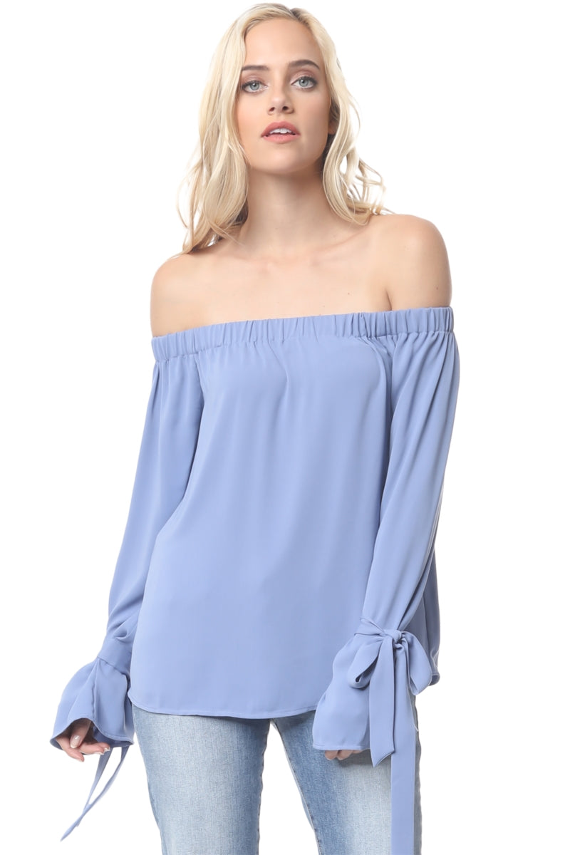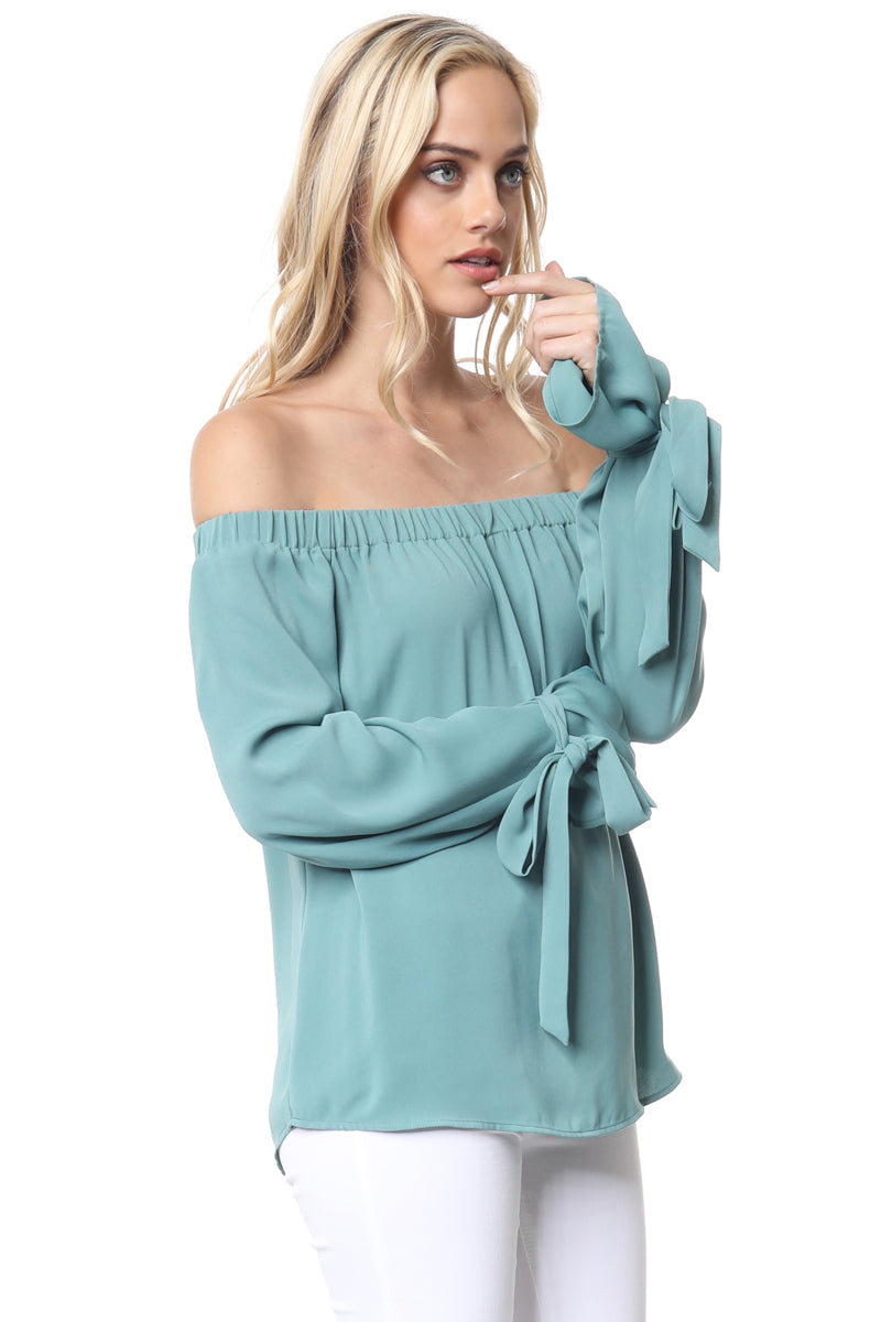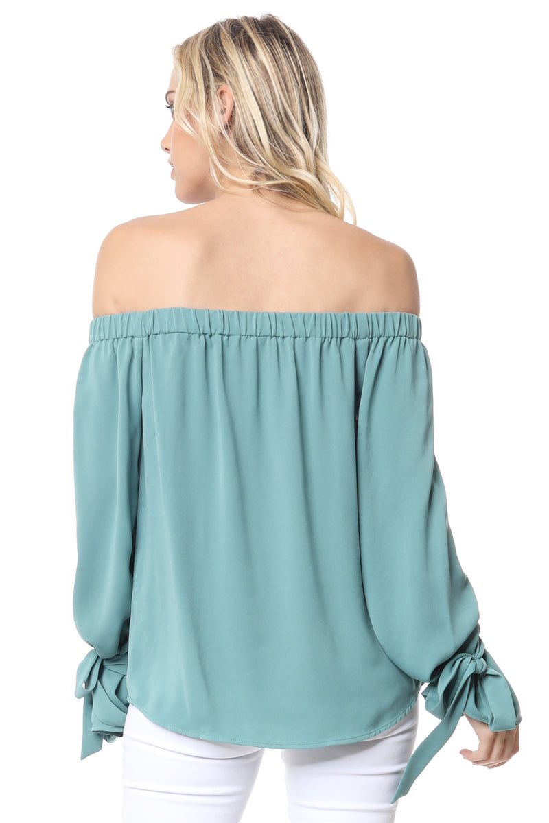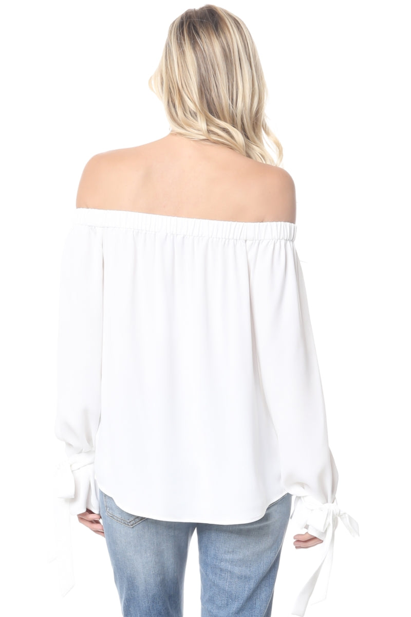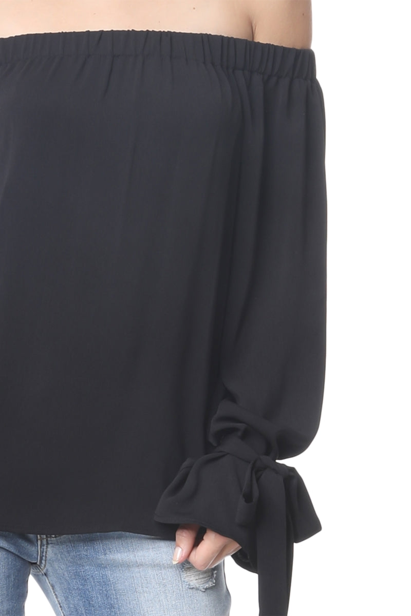 ╴Women's Off Ruffle Shoulder Blouse with Tie Sleeve.