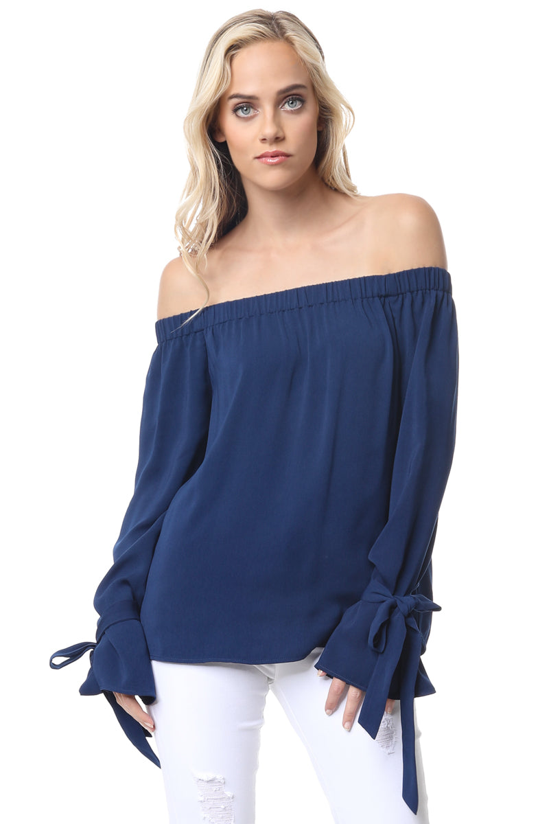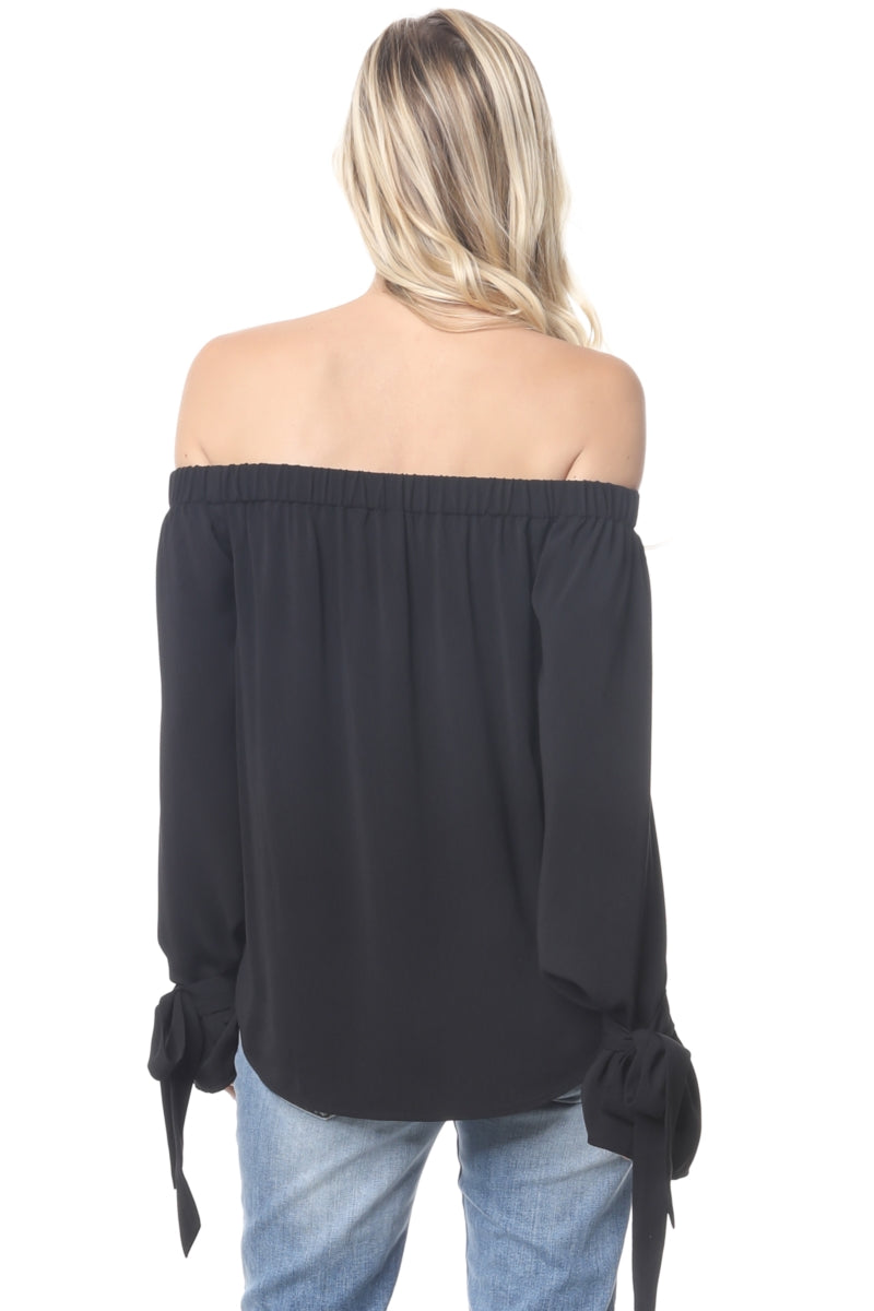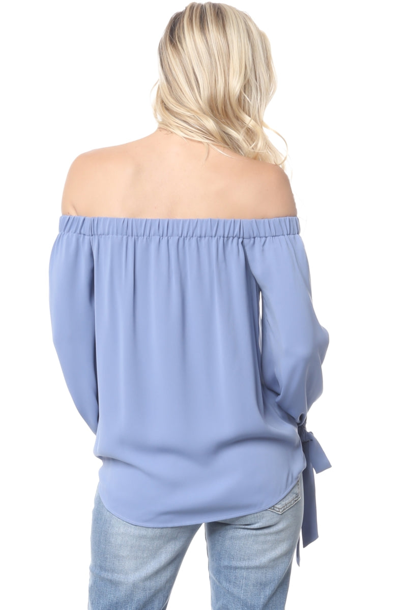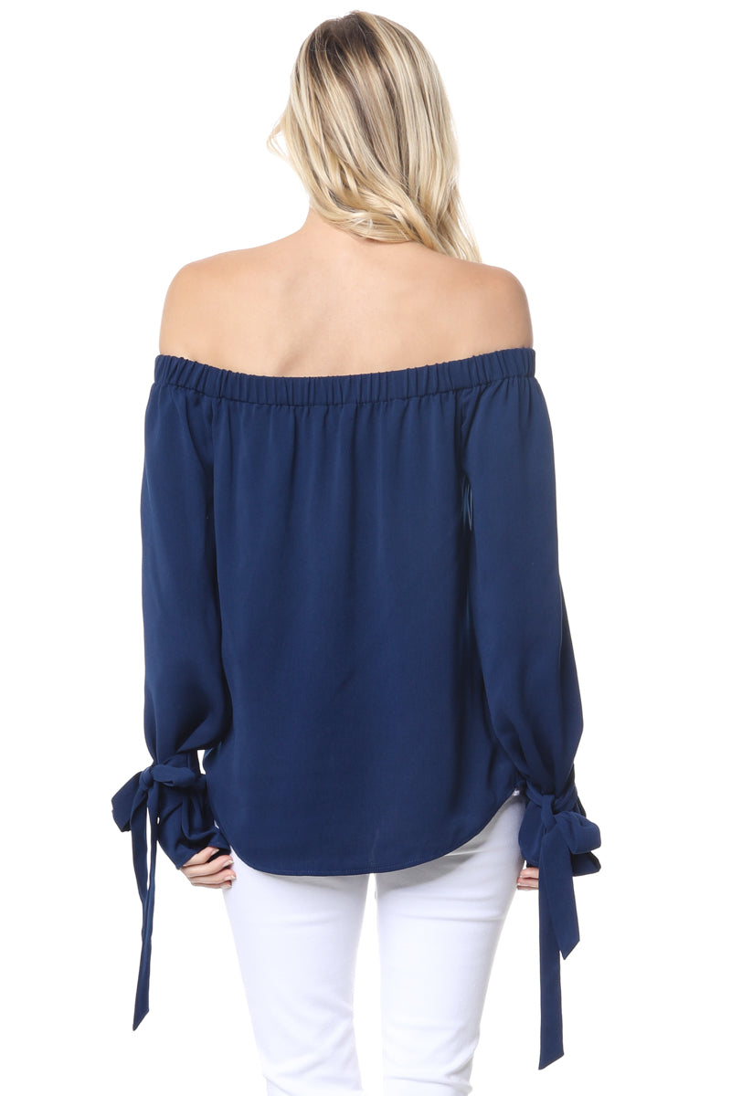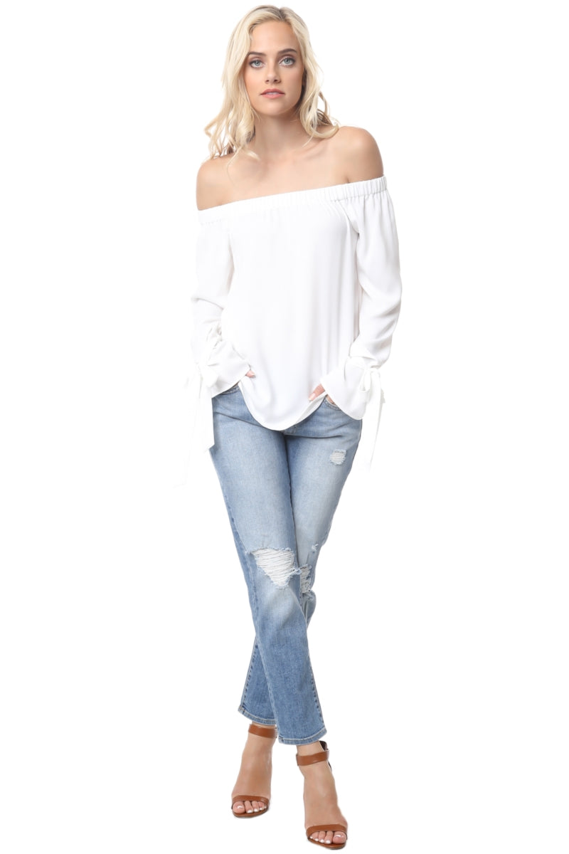 ╴Women's Off Ruffle Shoulder Blouse with Tie Sleeve.