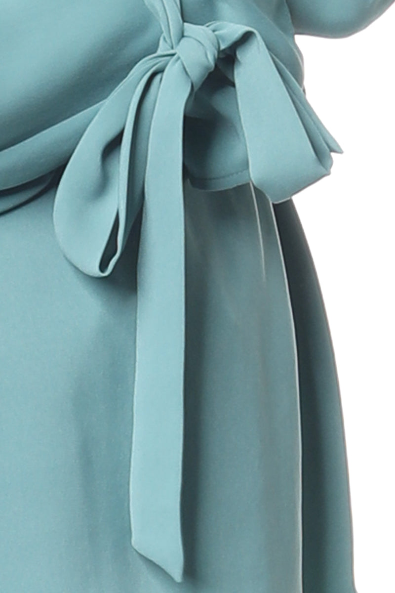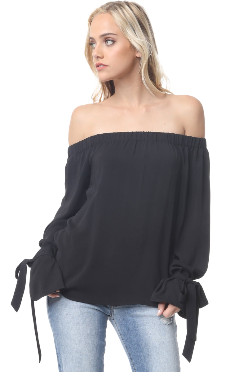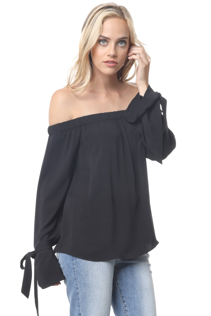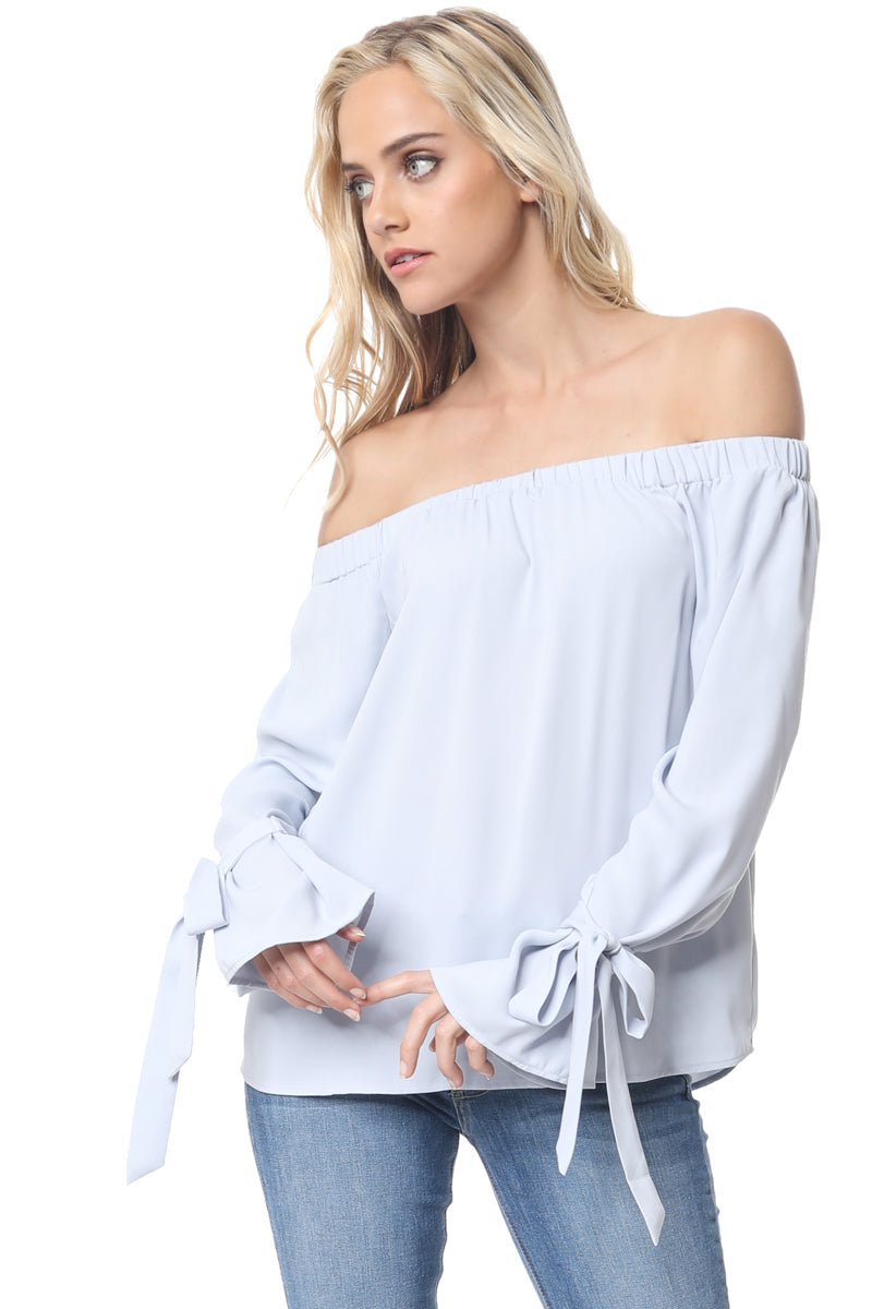 ╴Off-shoulder ruffle neckline with tie-accented sleeves for a romantic, feminine look.