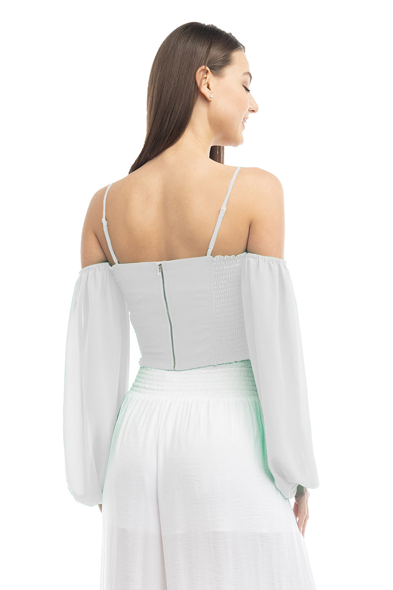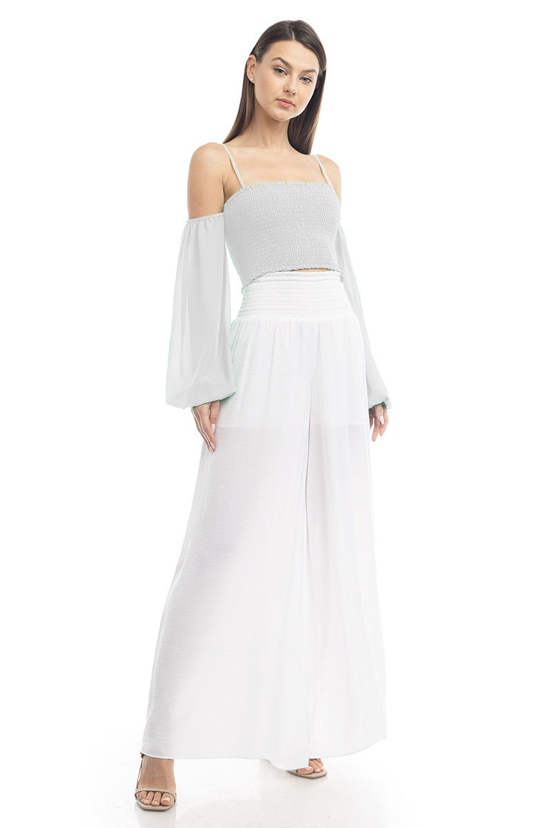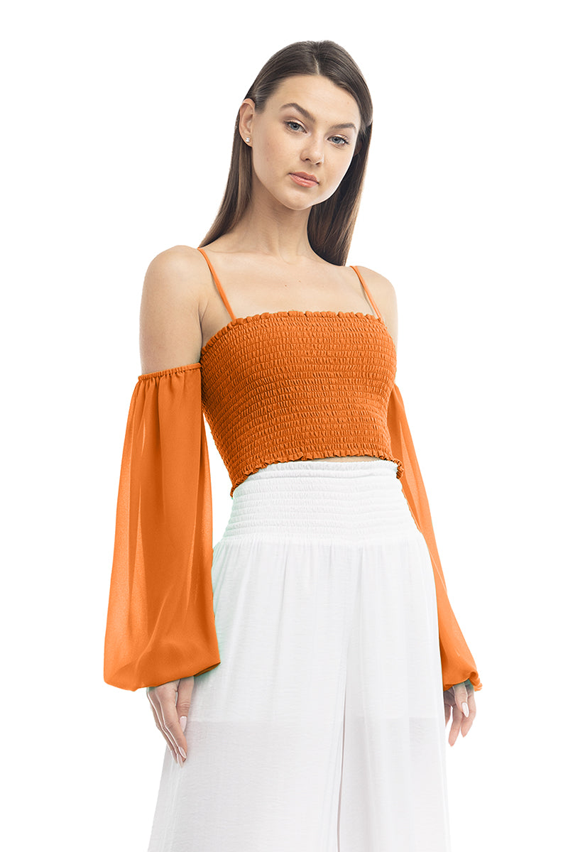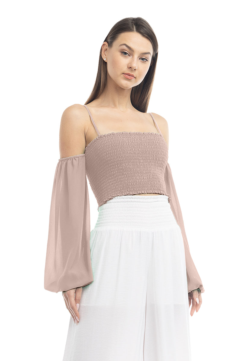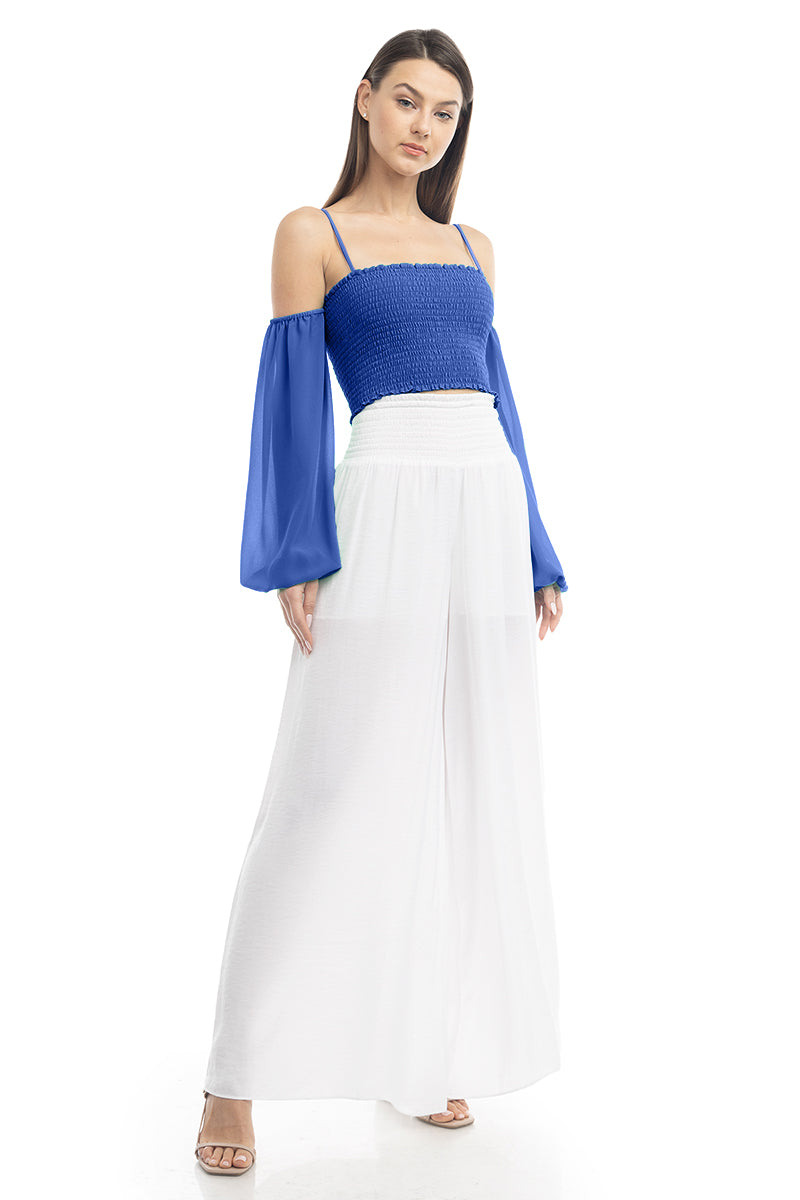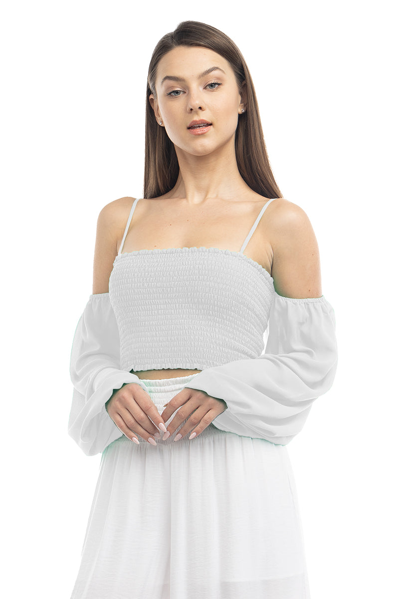 Elegantly crafted off-shoulder blouse featuring distinctive smoking stitch detailing on the body. The refined silhouette offers a graceful neckline that highlights the collarbone while the meticulous stitching provides both visual interest and structural integrity. Perfect for elevating casual ensembles or complementing evening attire with understated sophistication.