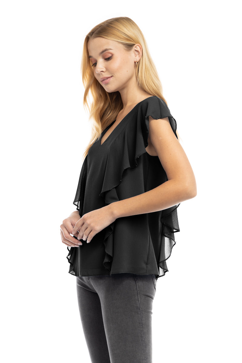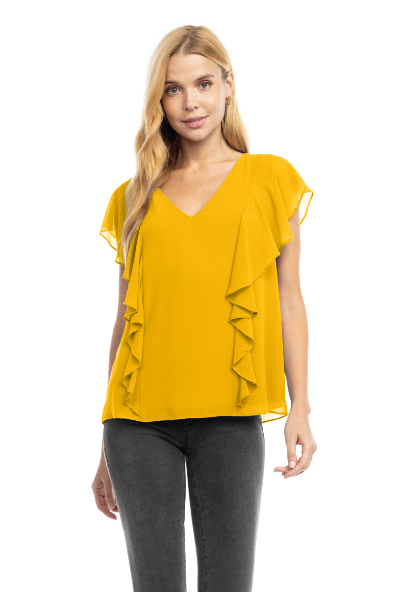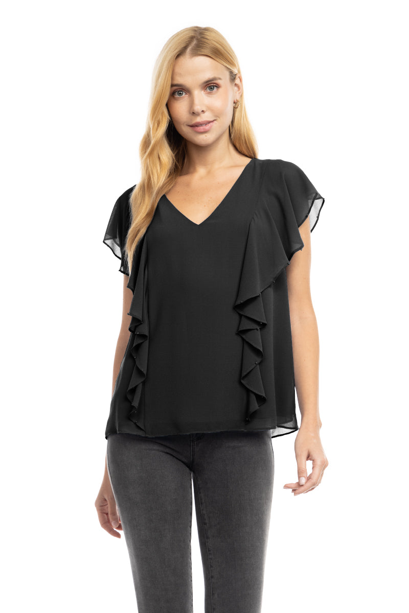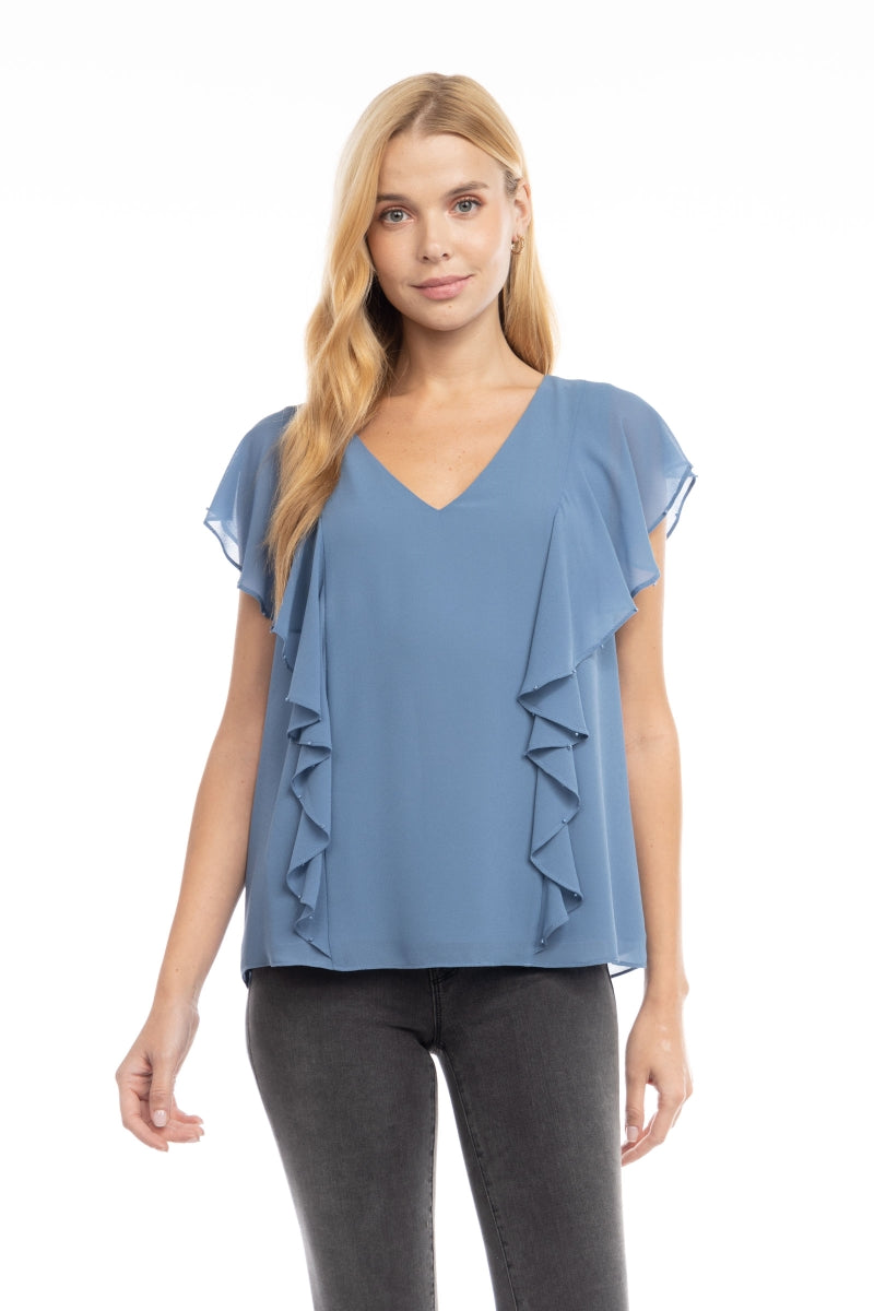 Pearl Beaded Ruffle V Neck Blouse