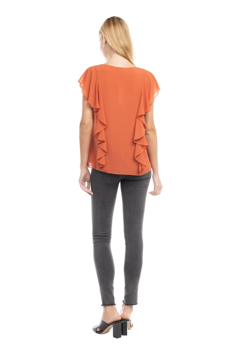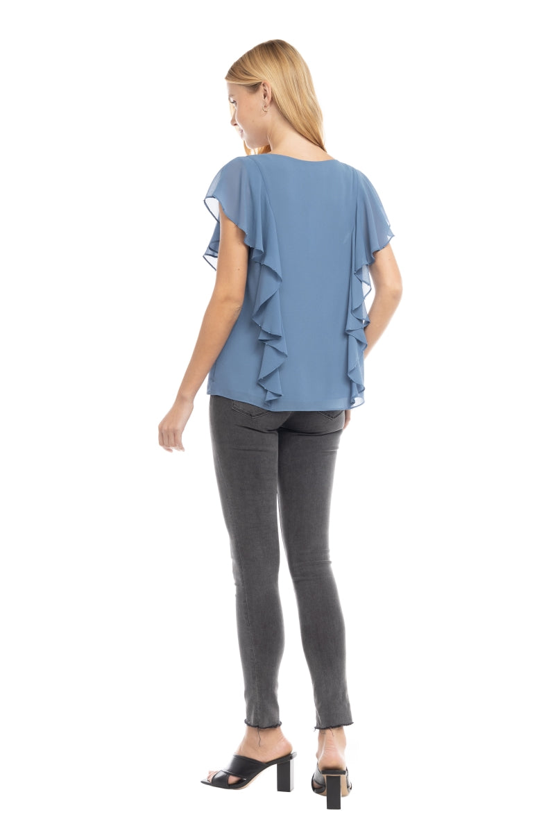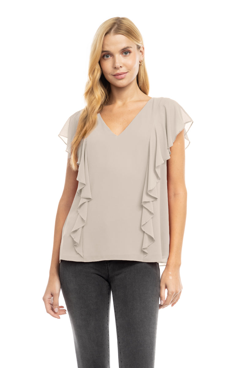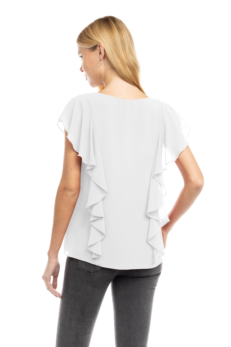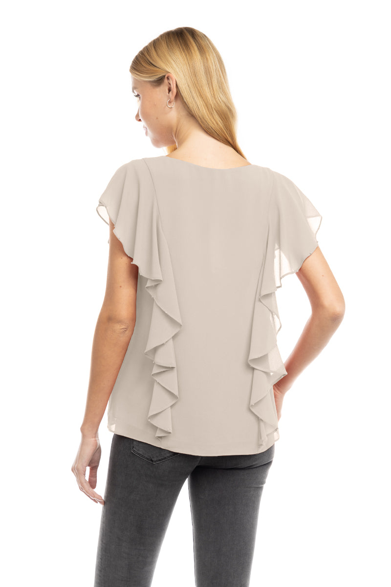╴Ruffled V-neckline adorned with pearl bead accents for a refined, feminine touch.