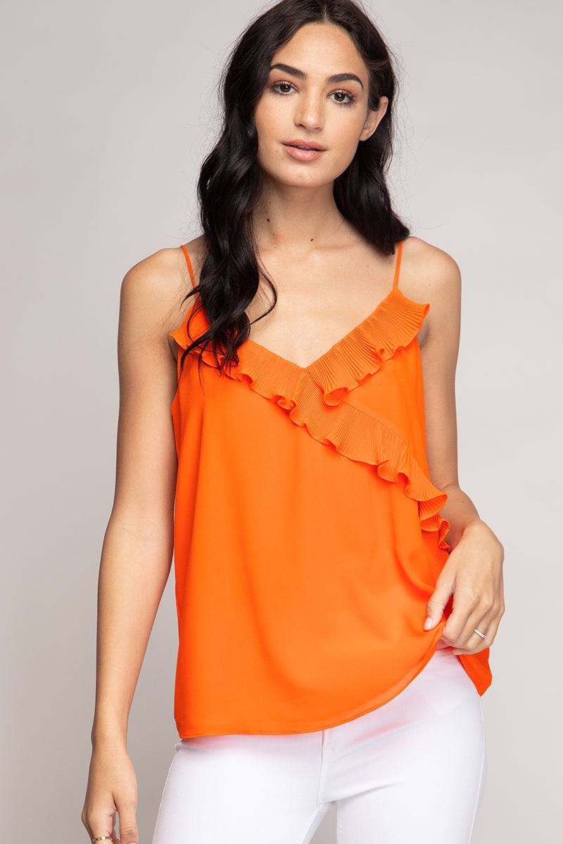 Introducing our Pleated Ruffled Cami, the perfect addition to any wardrobe. This stylish cami boasts delicate pleated ruffles for a feminine touch. Made with high-quality materials, it's both comfortable and chic. Elevate your look with this must-have piece.