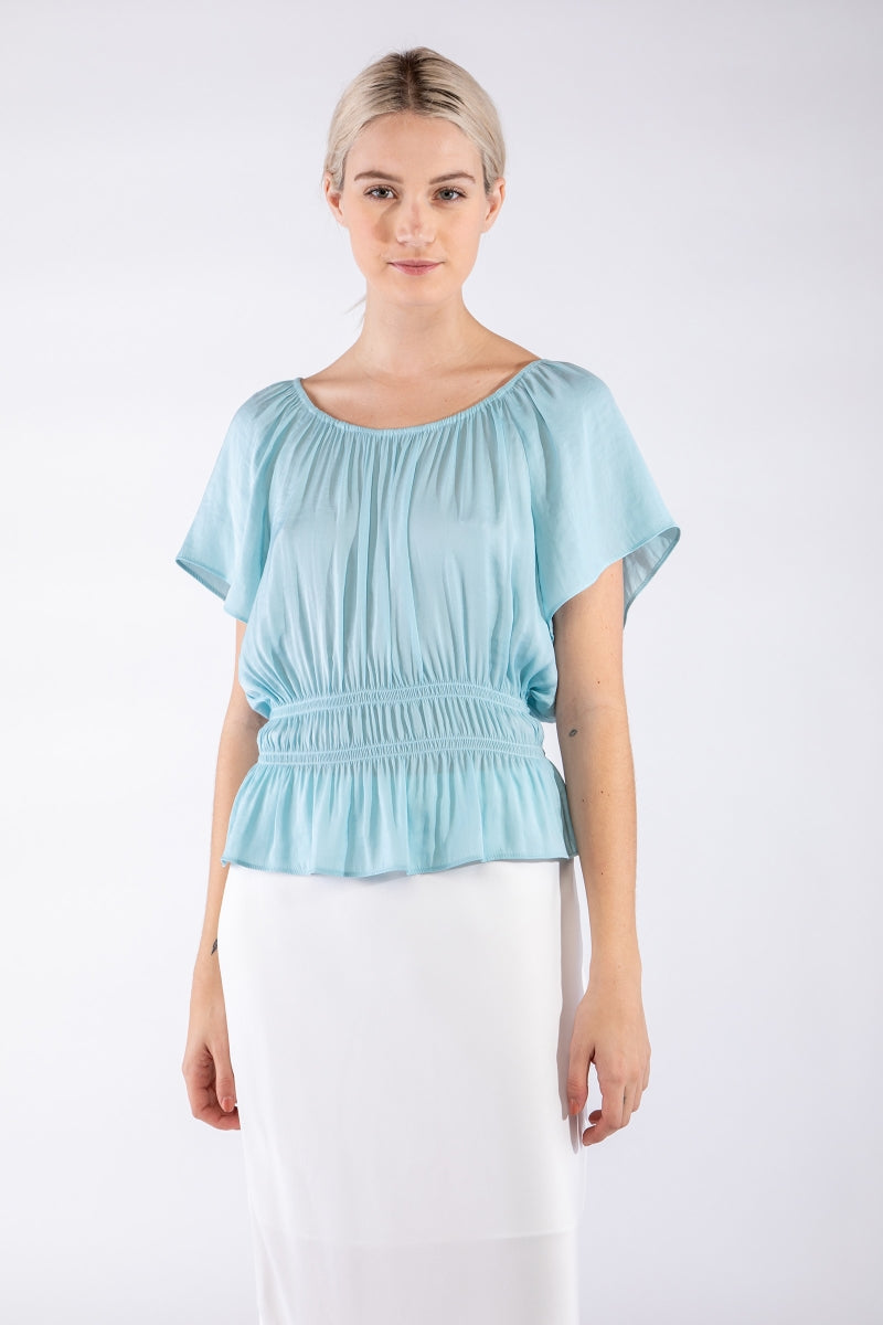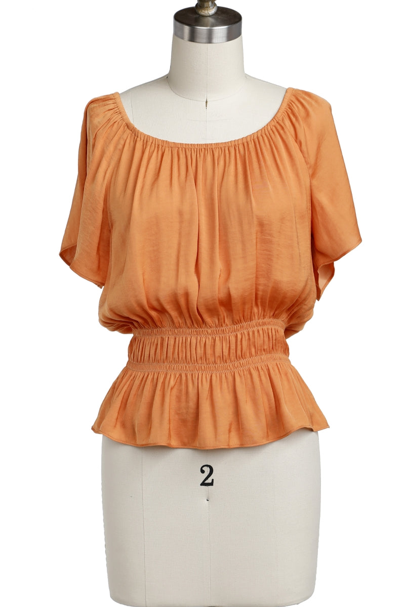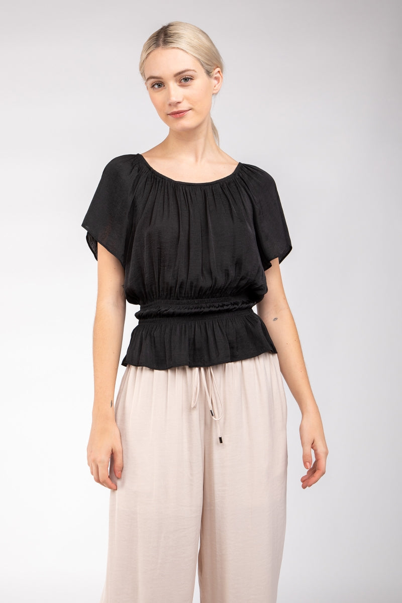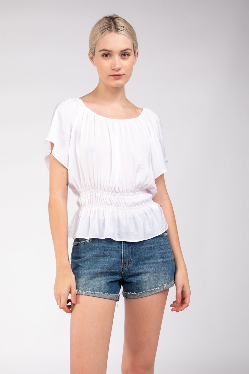 Raglan Short Sleeve Peplum Smocked Blouse