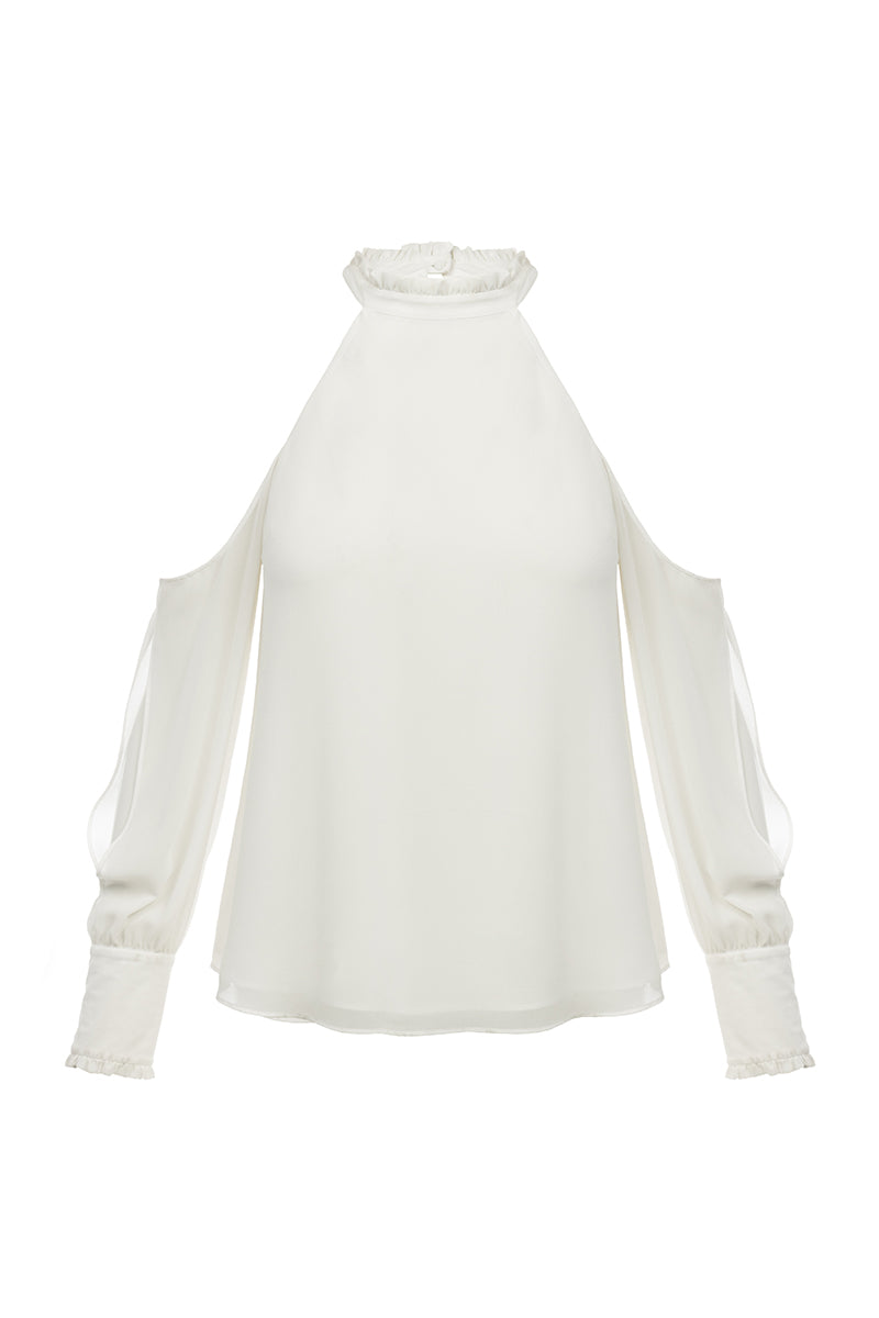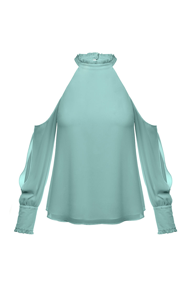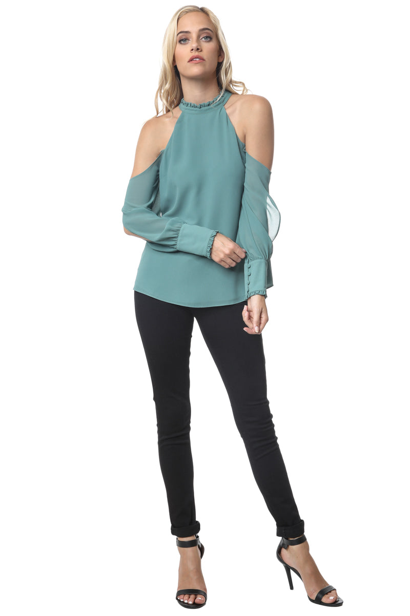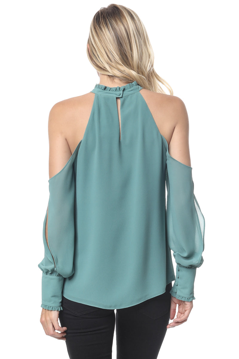Features a mock neckline with ruffle accents and flirty shoulder cutouts