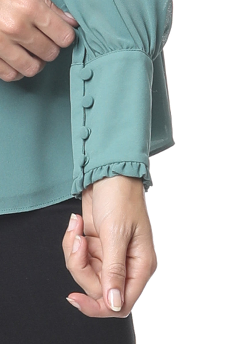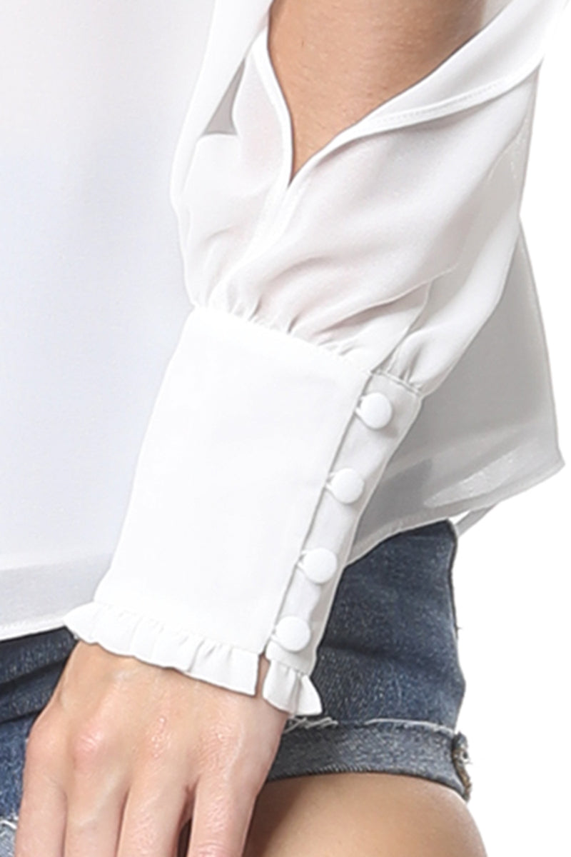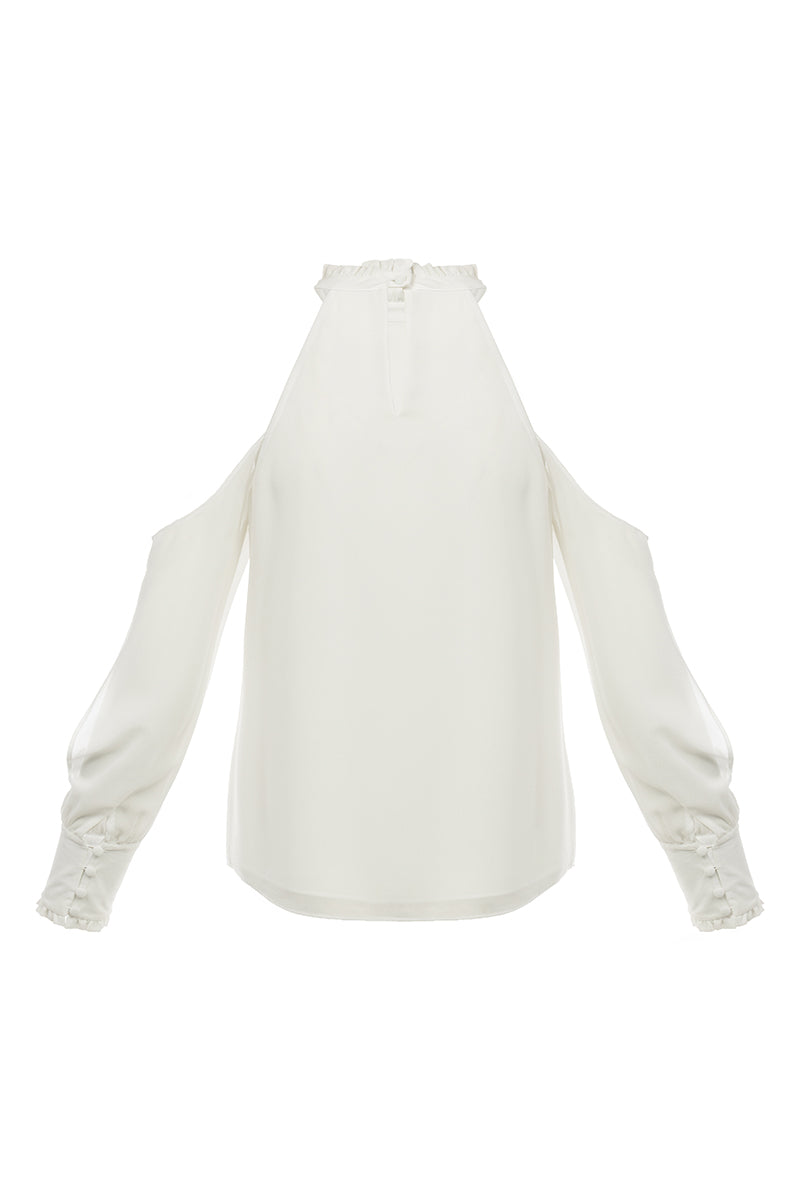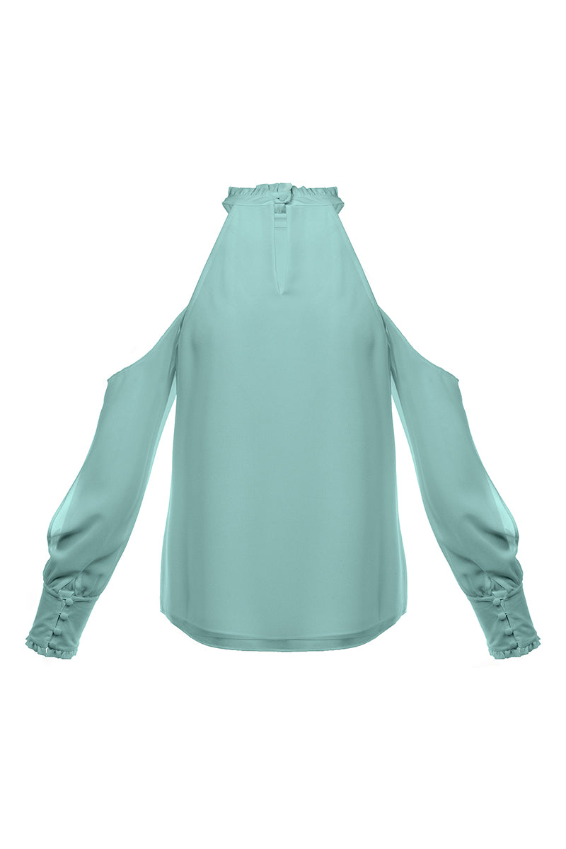 Features a mock neckline with ruffle accents and flirty shoulder cutouts