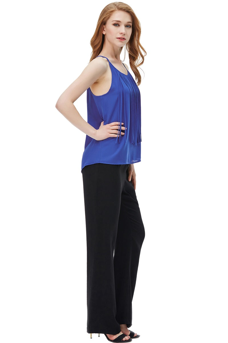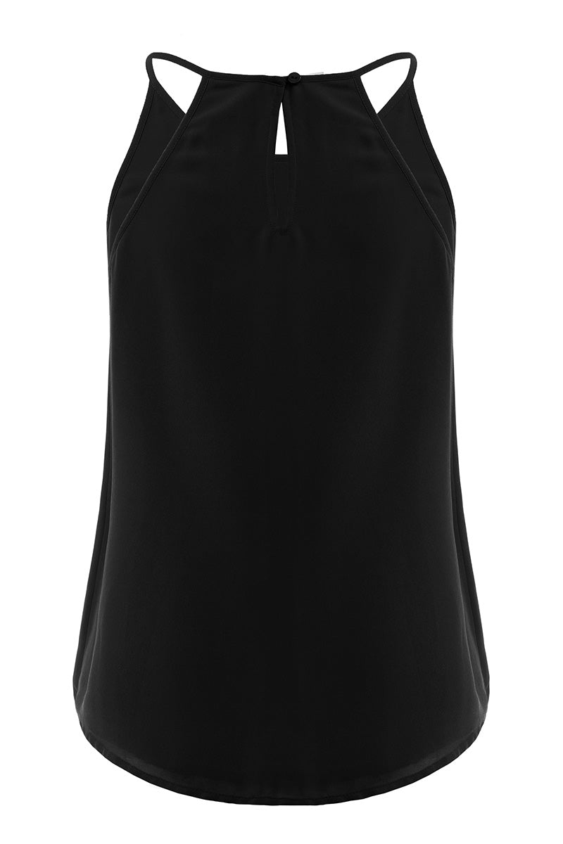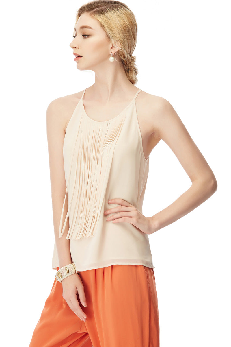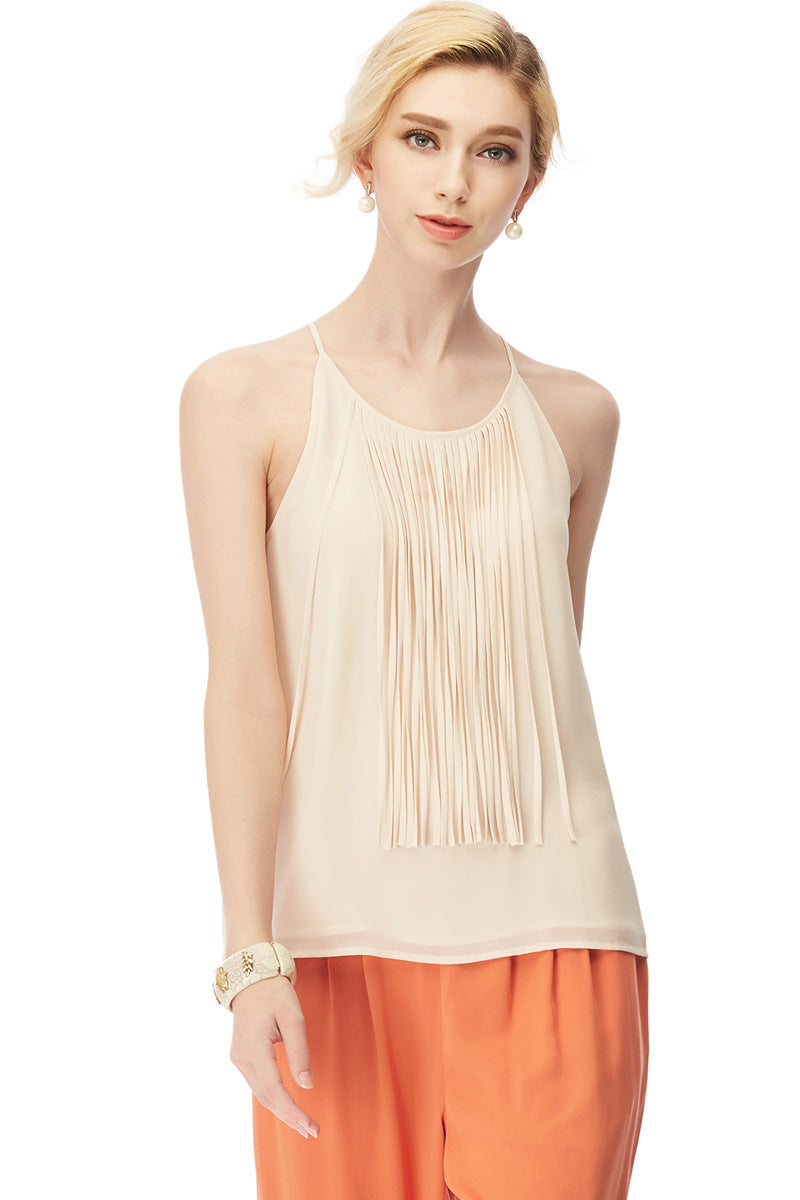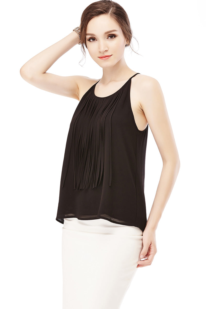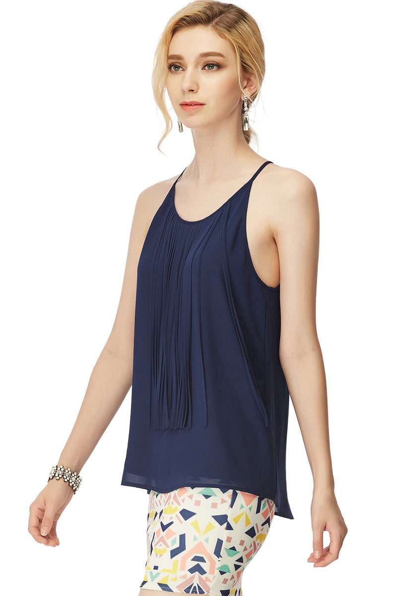 ╴Women's Spaghetti Fringe Top with Back Button Keyhole