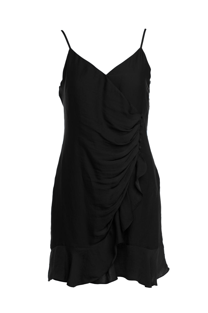╴Faux wrap silhouette with ruffle trim and slender straps for a playful, feminine look.
