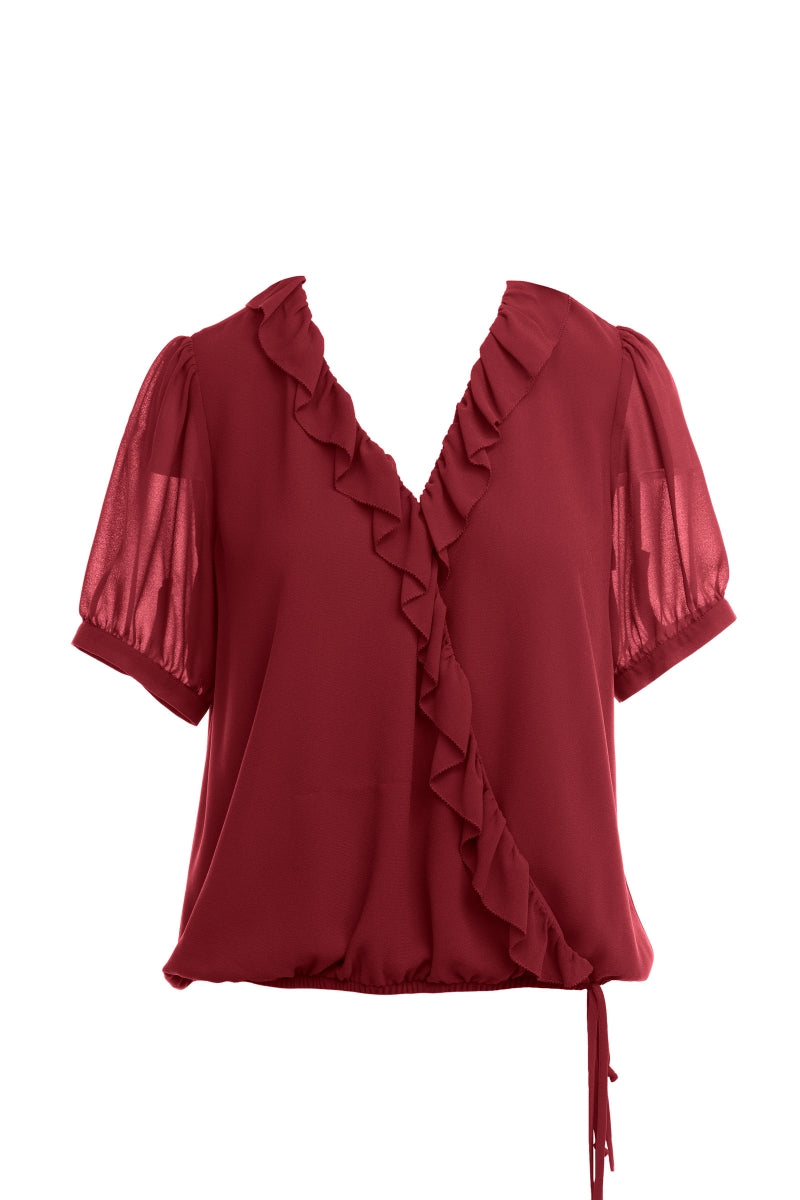 ╴Flattering surplice front with a cinched elasticized waist and breezy short sleeves.