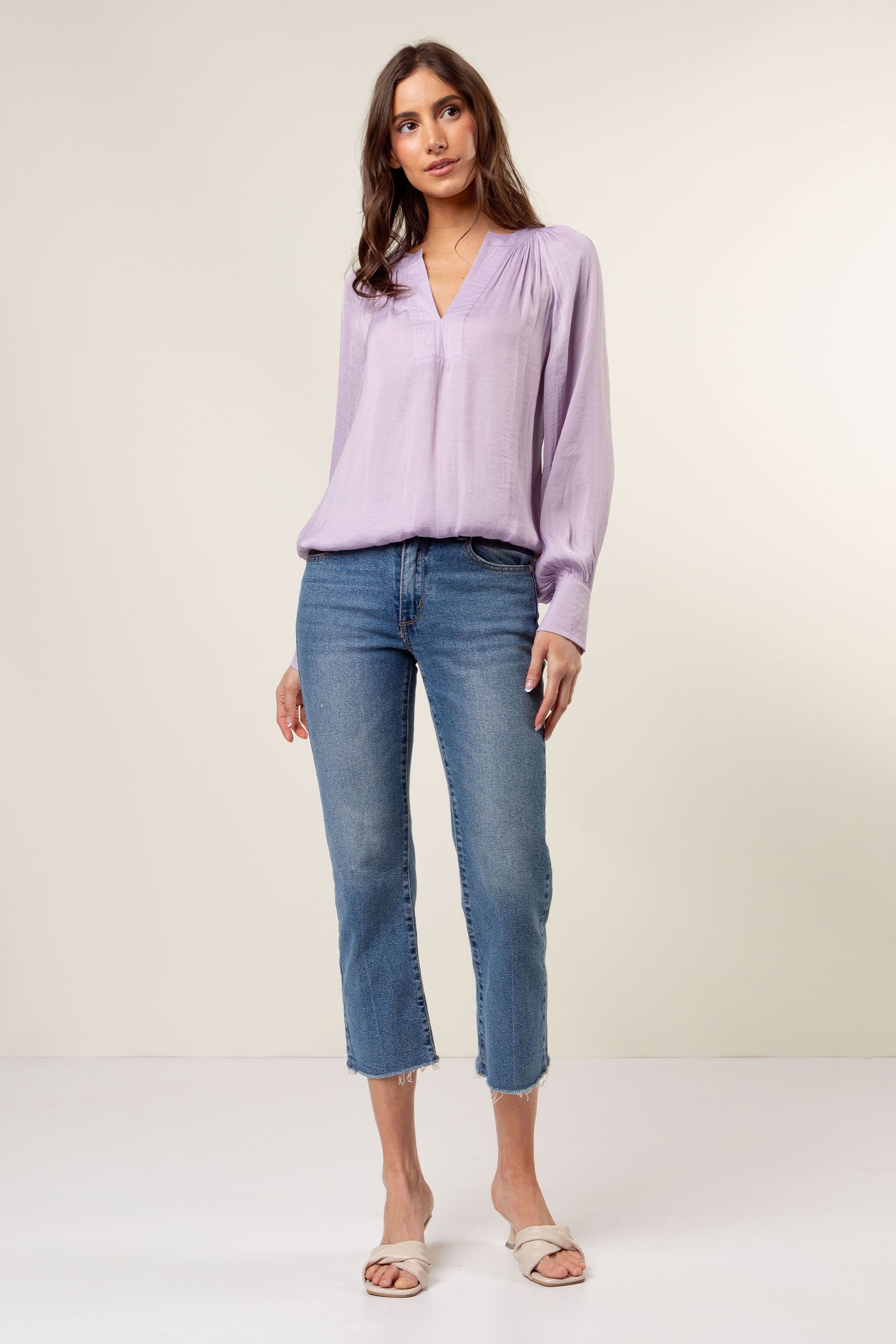 V Neck Front Button Closure Long Sleeve Blouse
