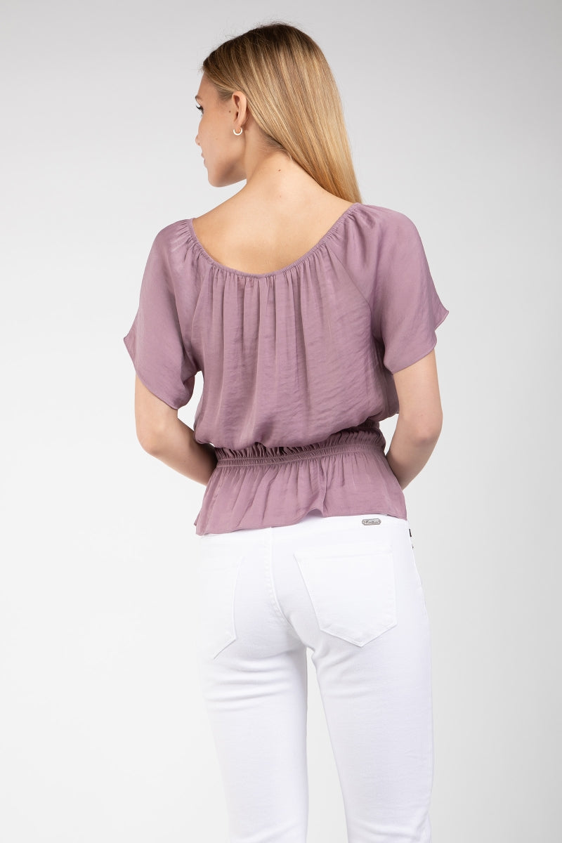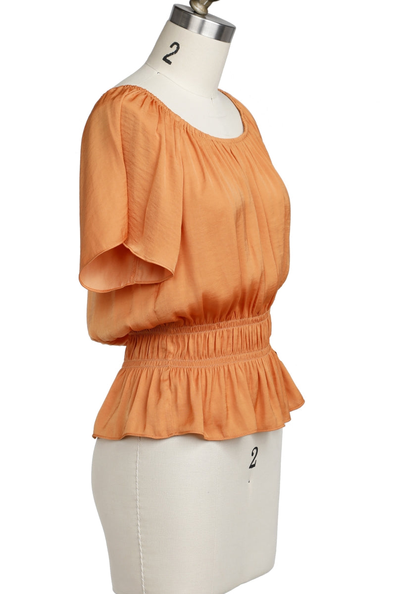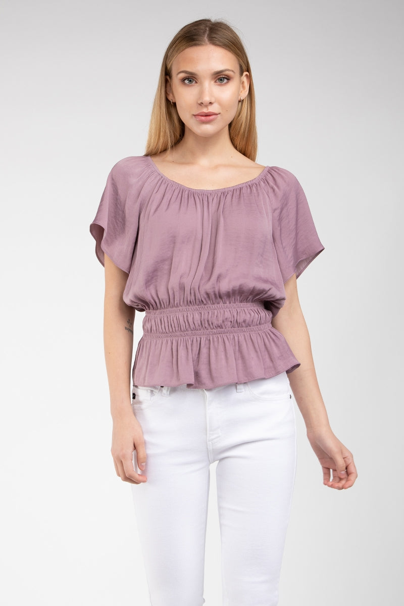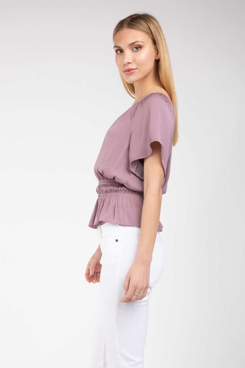 Raglan Short Sleeve Peplum Smocked Blouse