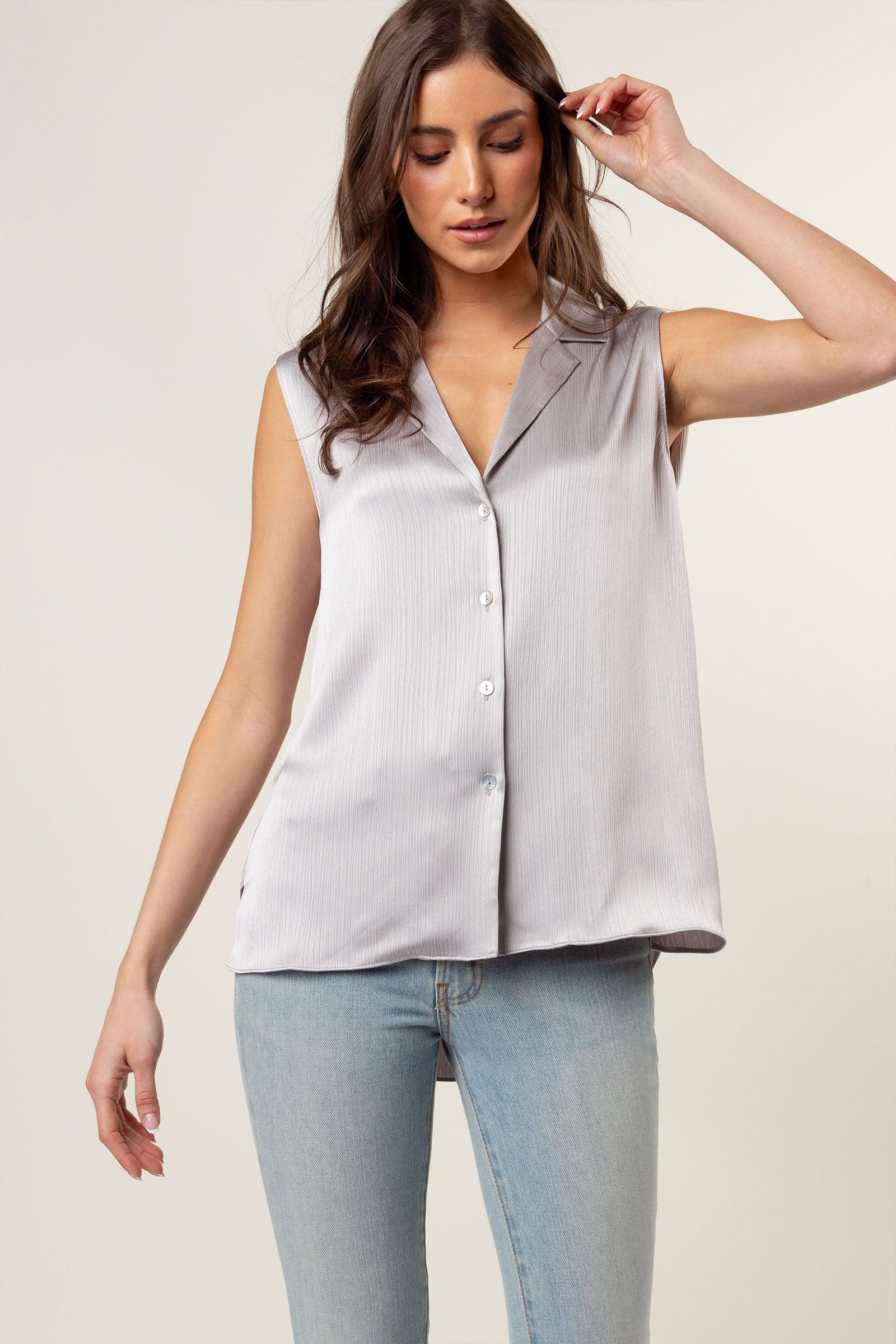 Sleeveless Button Down Shirt In Crinkle Satin