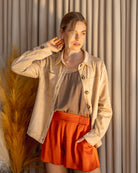 Meet our faux suede button-down jacket, featuring a classic collar and chest pockets. Effortlessly blending timeless style with modern practicality, this jacket is a versatile addition to your wardrobe. Crafted from luxurious faux suede, it adds a touch of sophistication to any outfit. From casual to formal occasions, this jacket ensures you look chic and feel comfortable. Upgrade your style with this functional and fashionable button-down jacket.