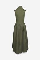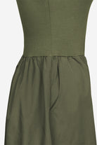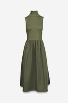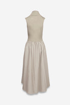╴Soft jersey knit bodice meets an elegant woven skirt for a refined silhouette