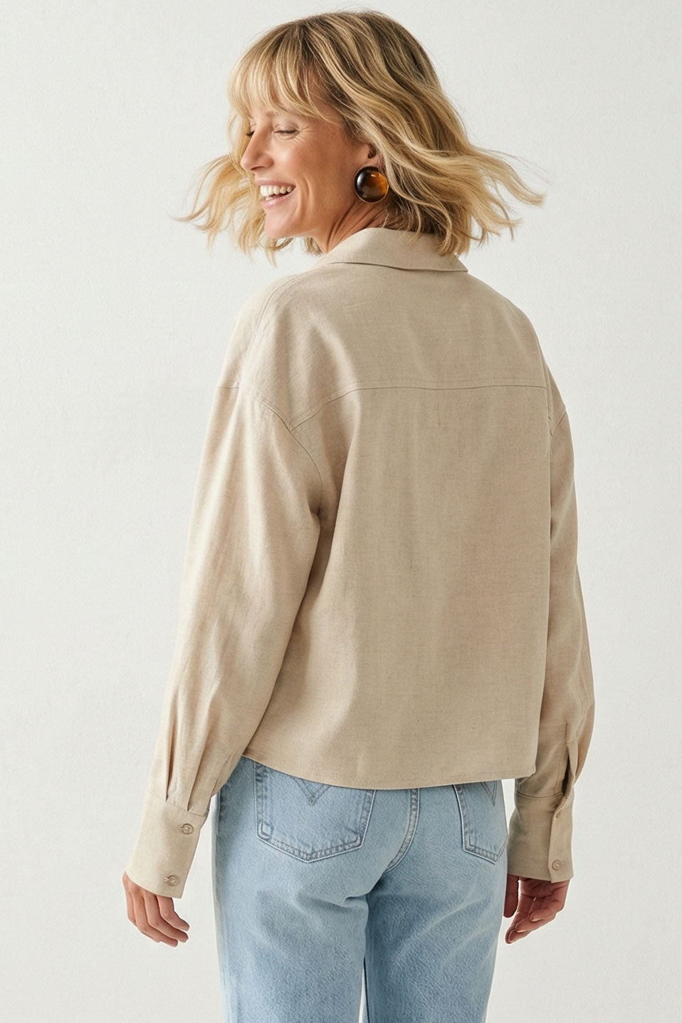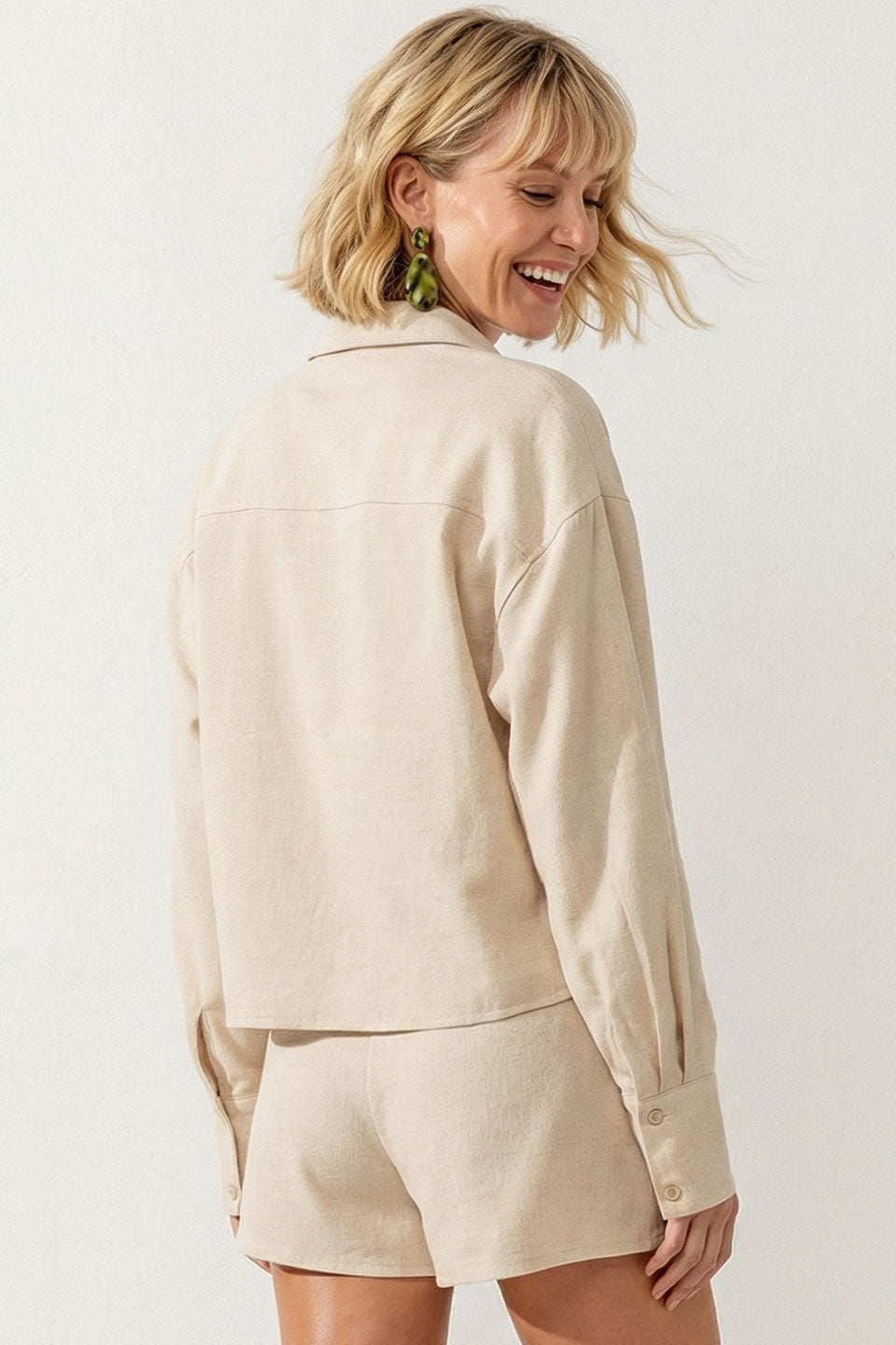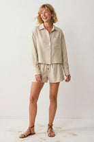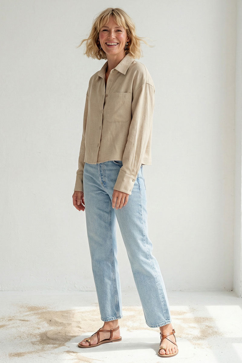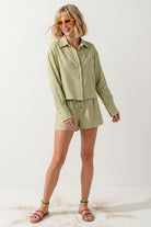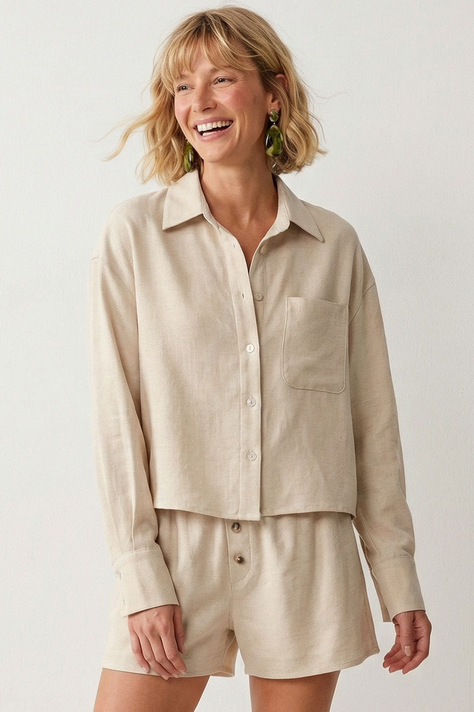 • Women's Effortless Woven Textured Button-front Blouse with a linen-look fabric.
