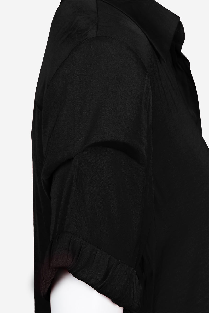 ╴Unique rolled cuff sleeves secured with detail stitching for added volume.