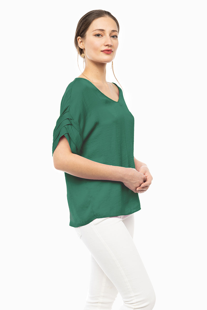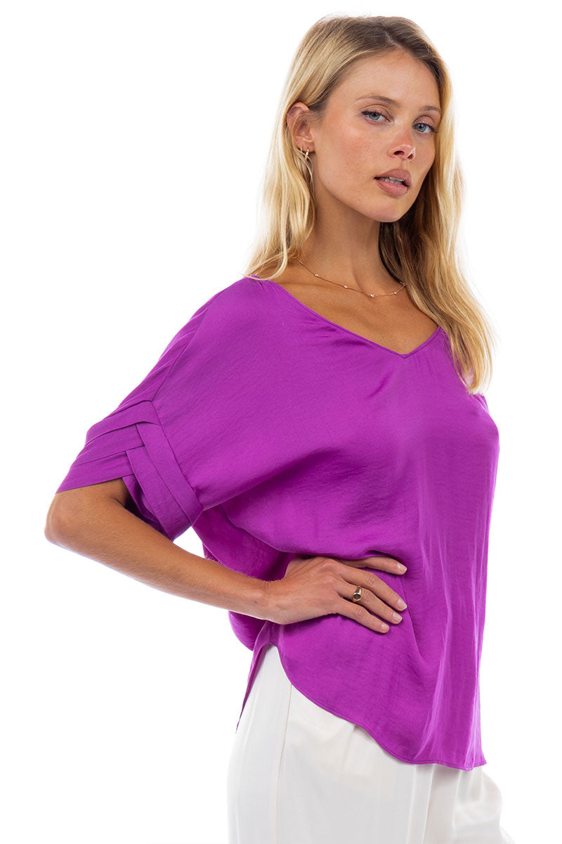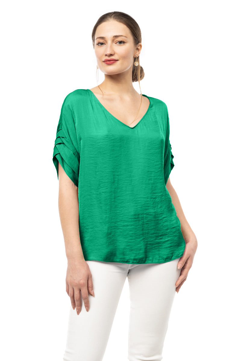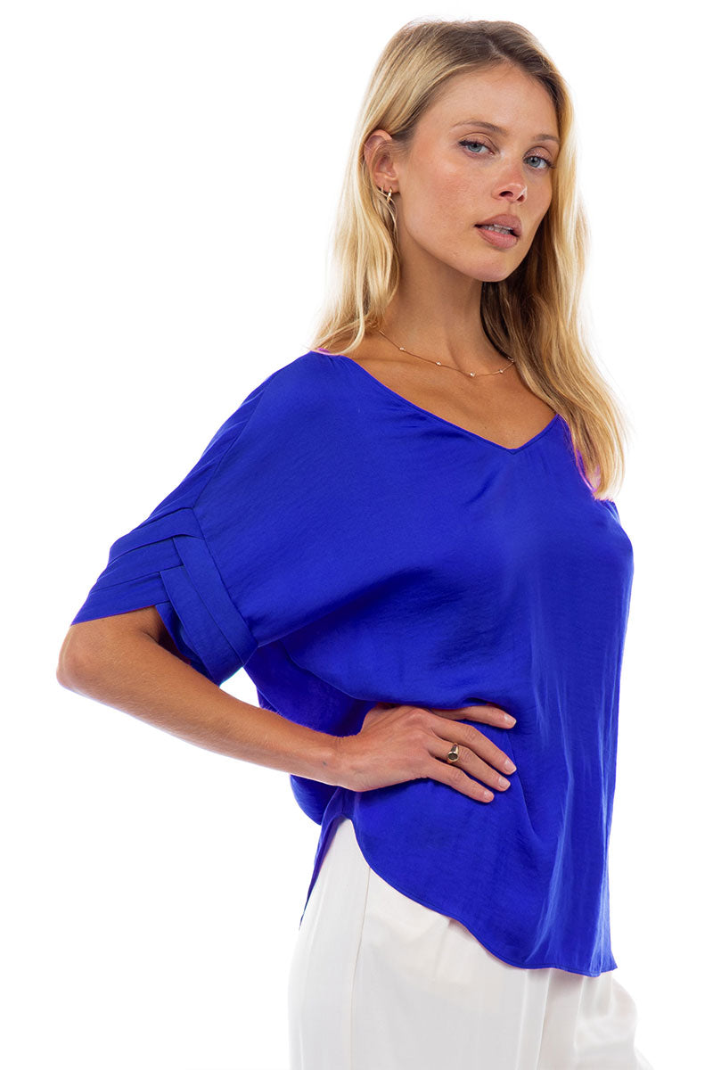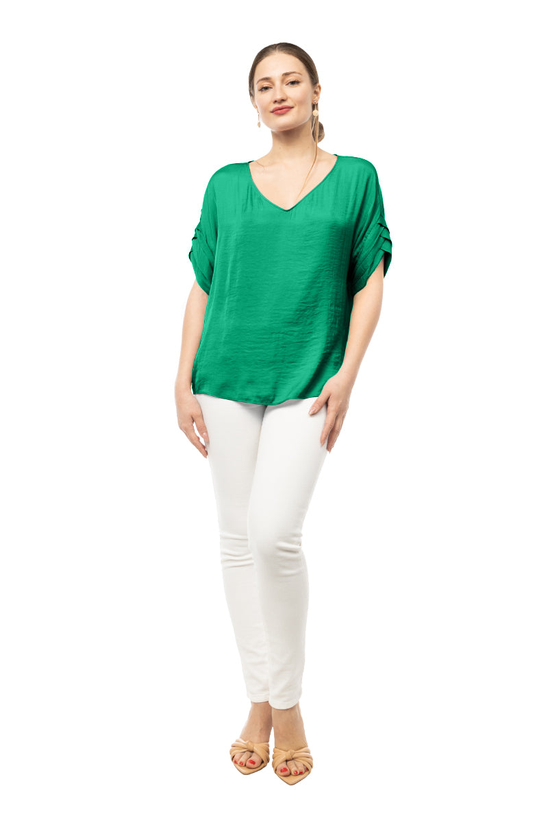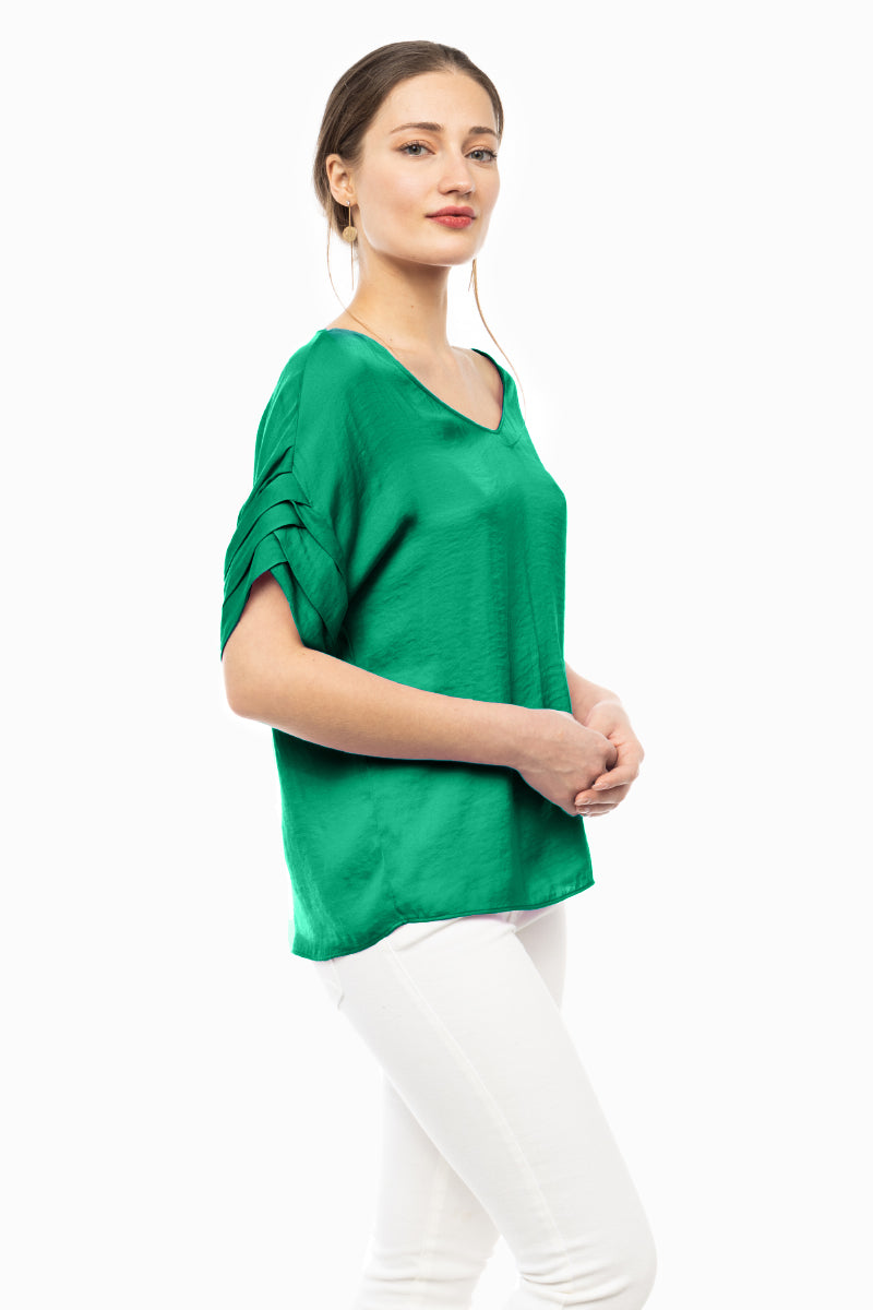 V-Neck Satin Top With Self Bands Sleeve Detail