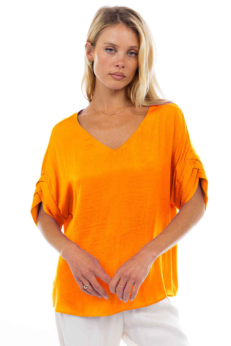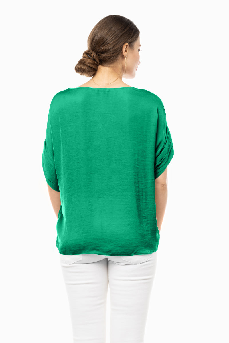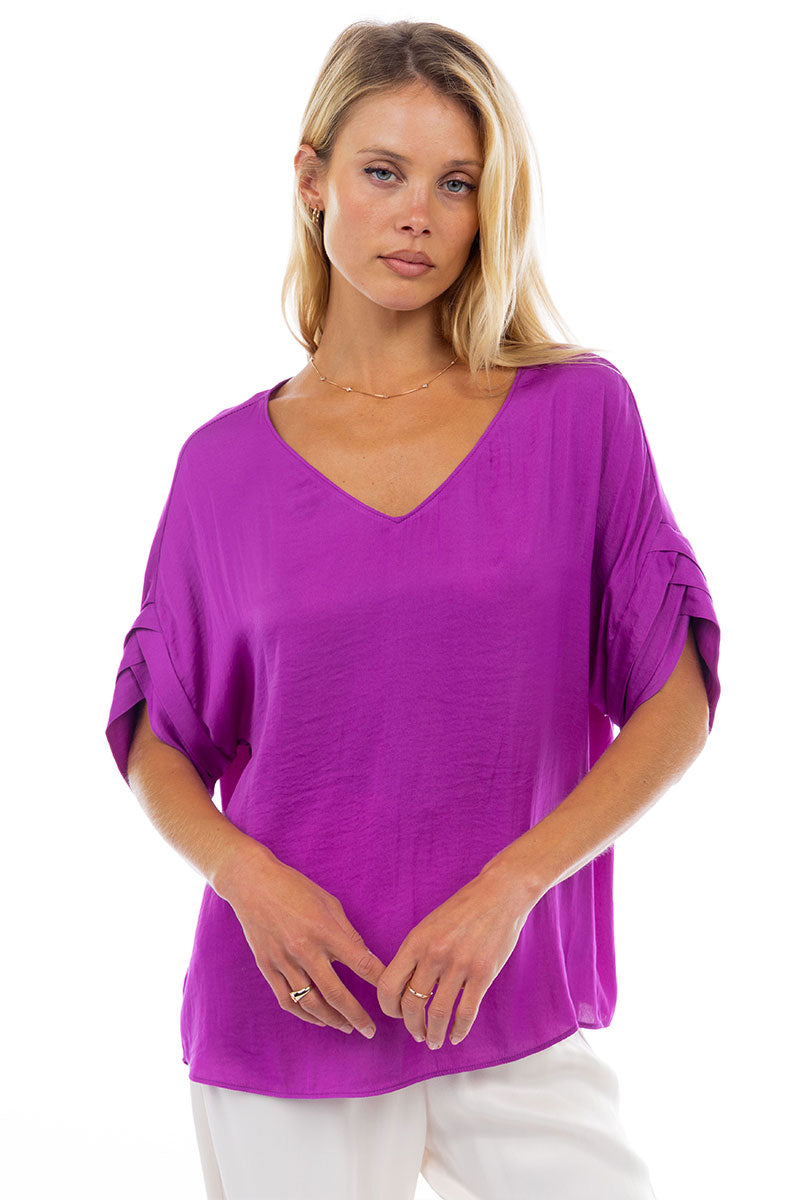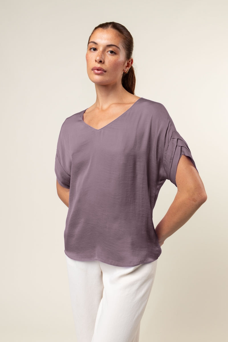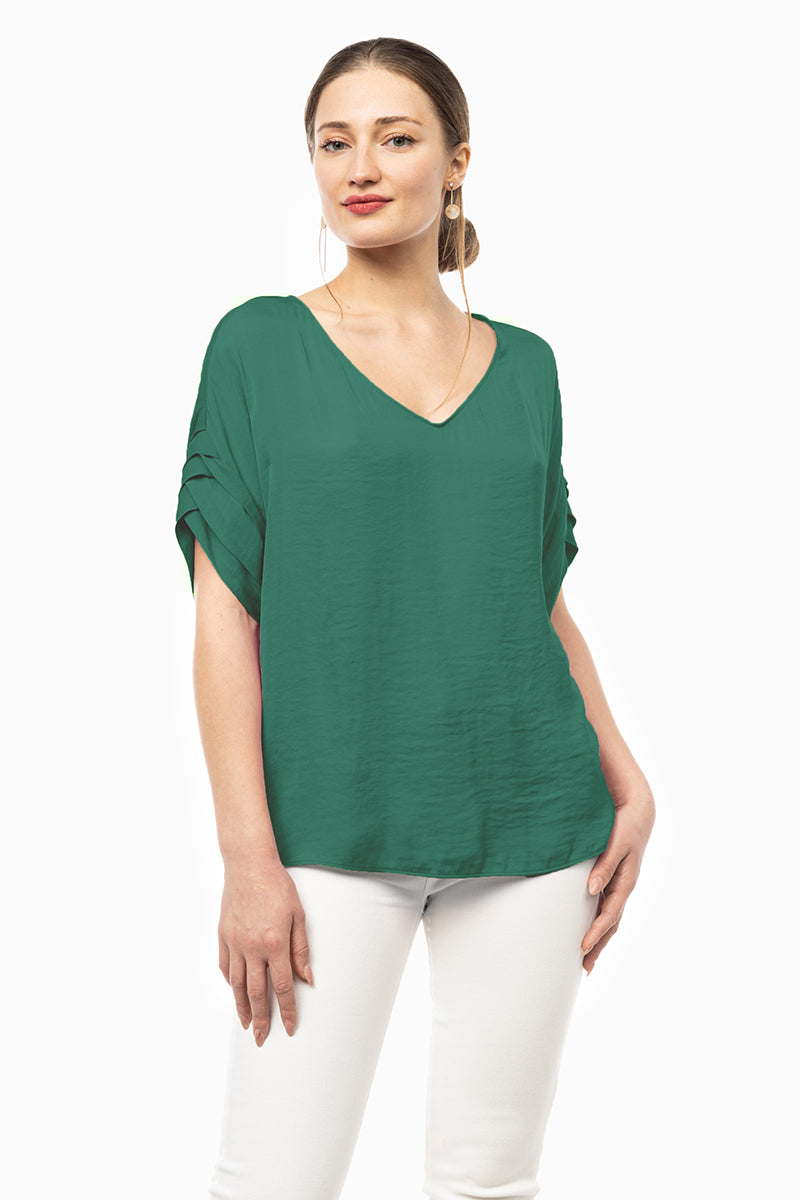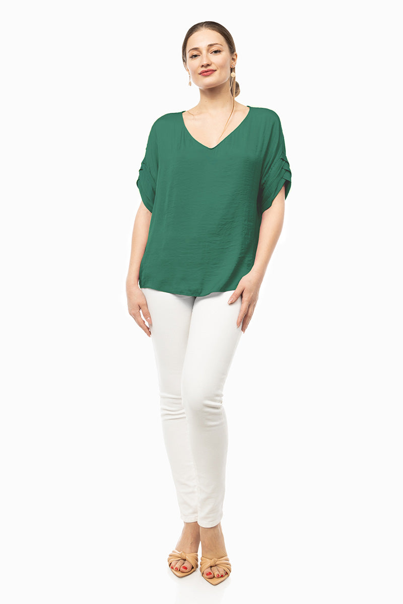 V-Neck Satin Top With Self Bands Sleeve Detail