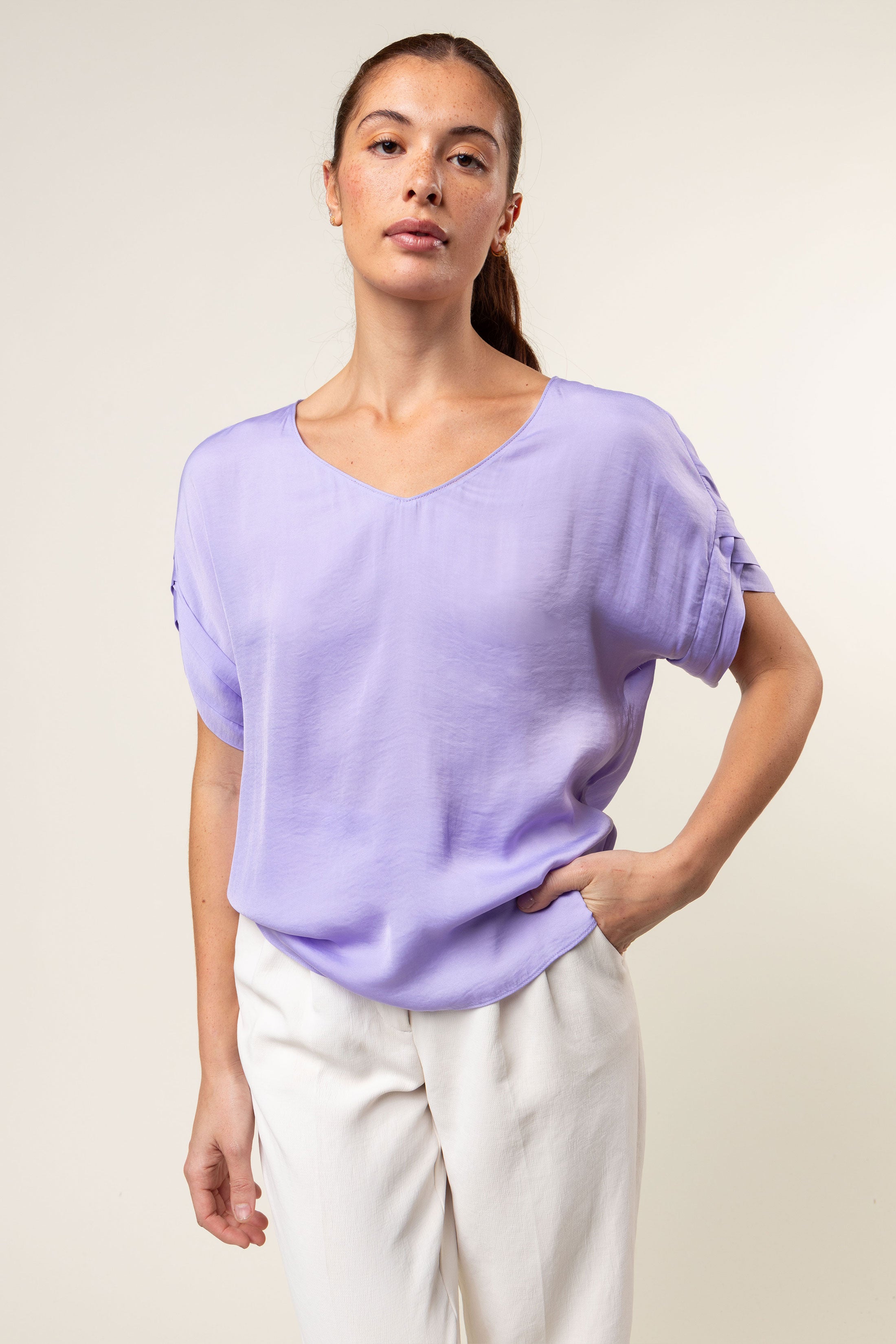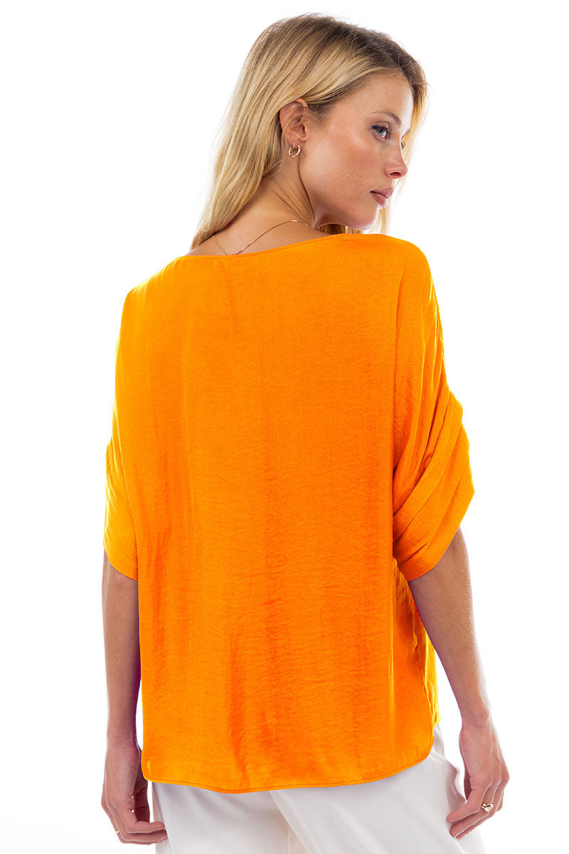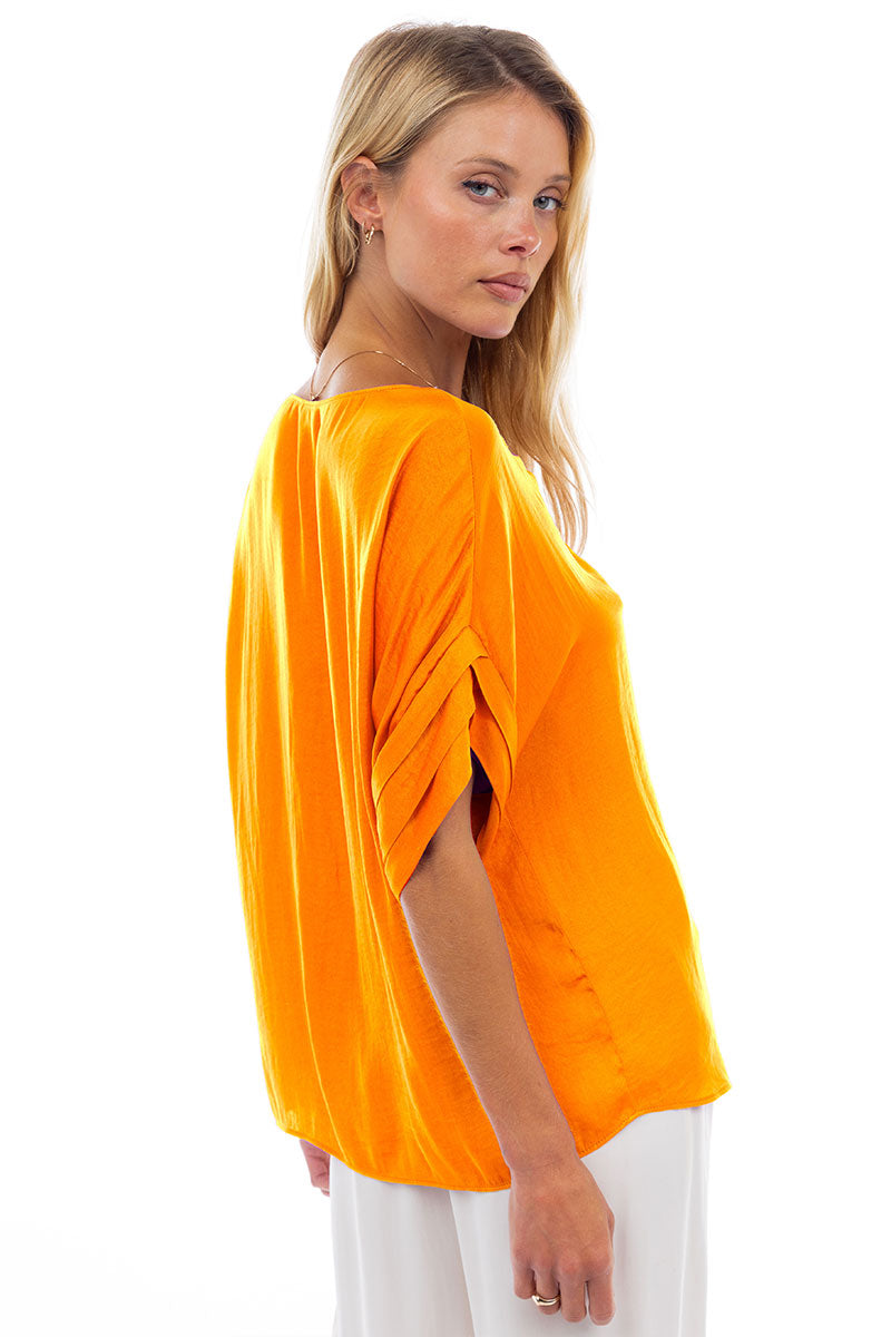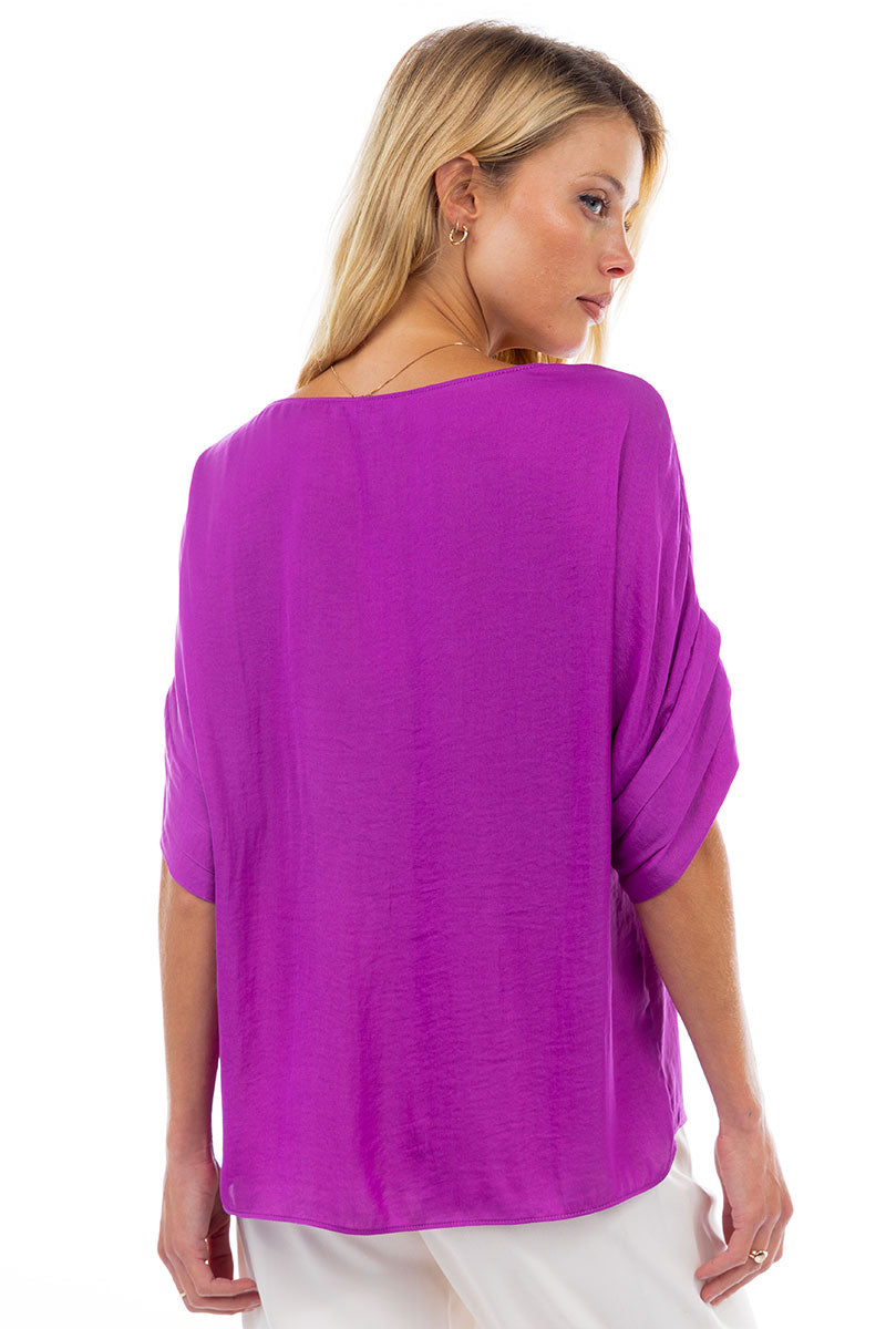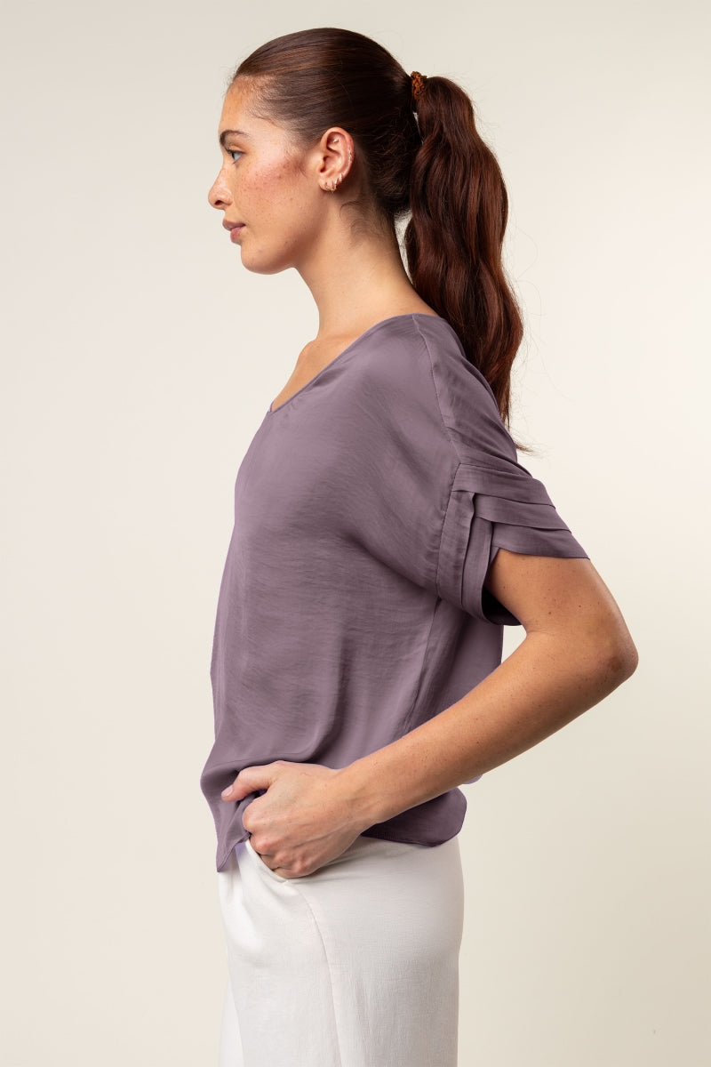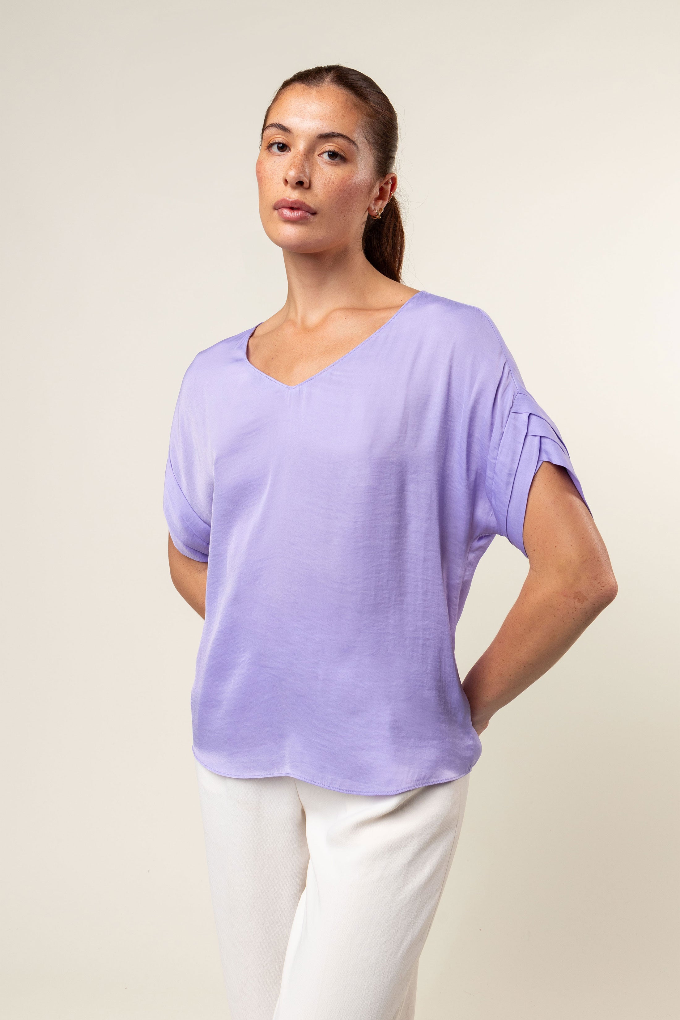 V-Neck Satin Top With Self Bands Sleeve Detail