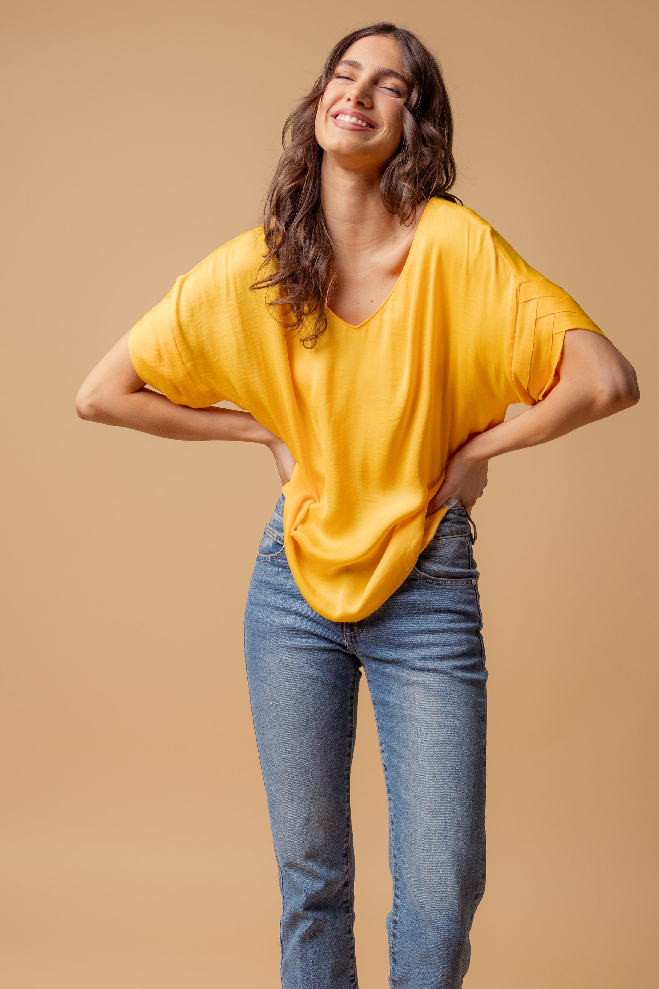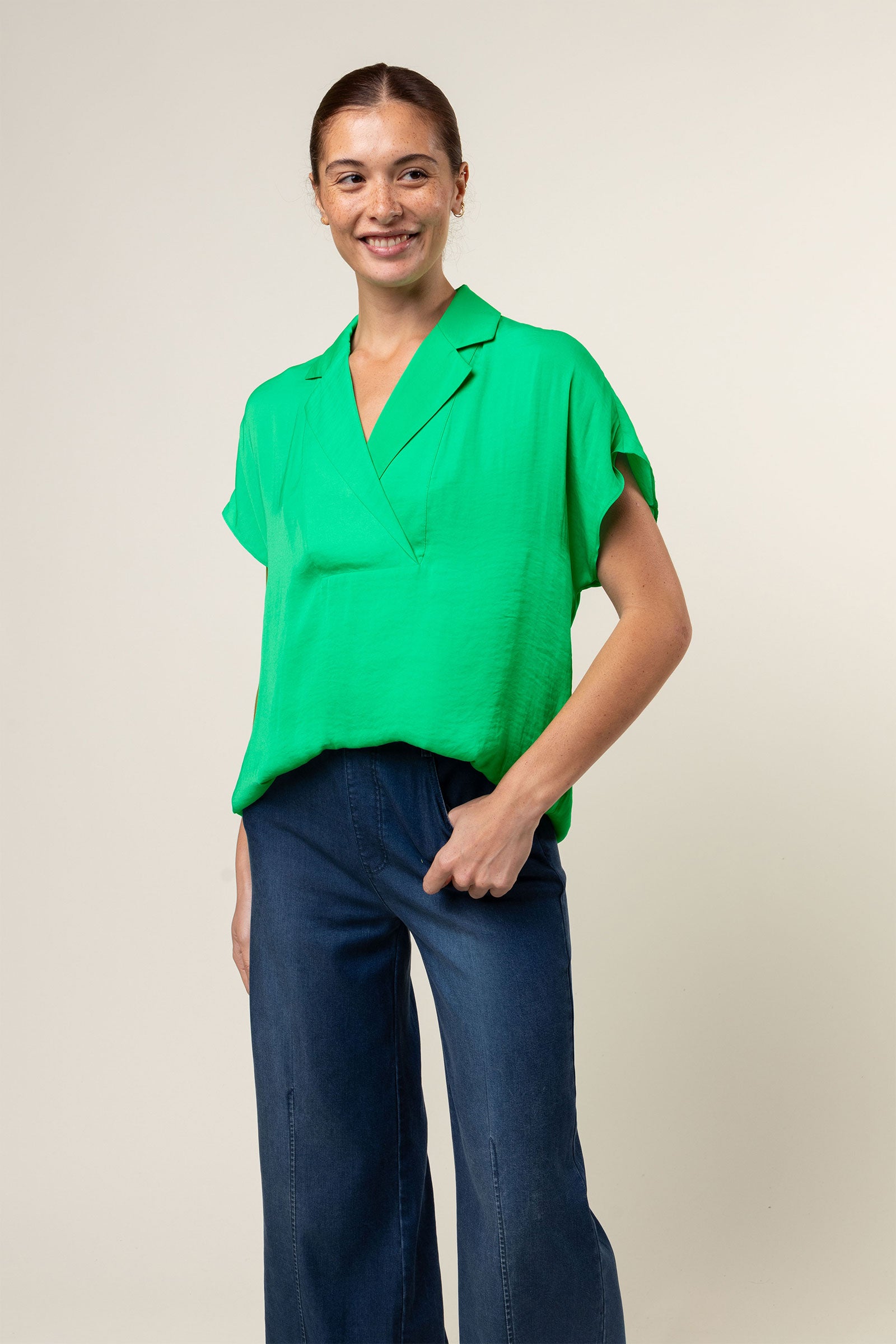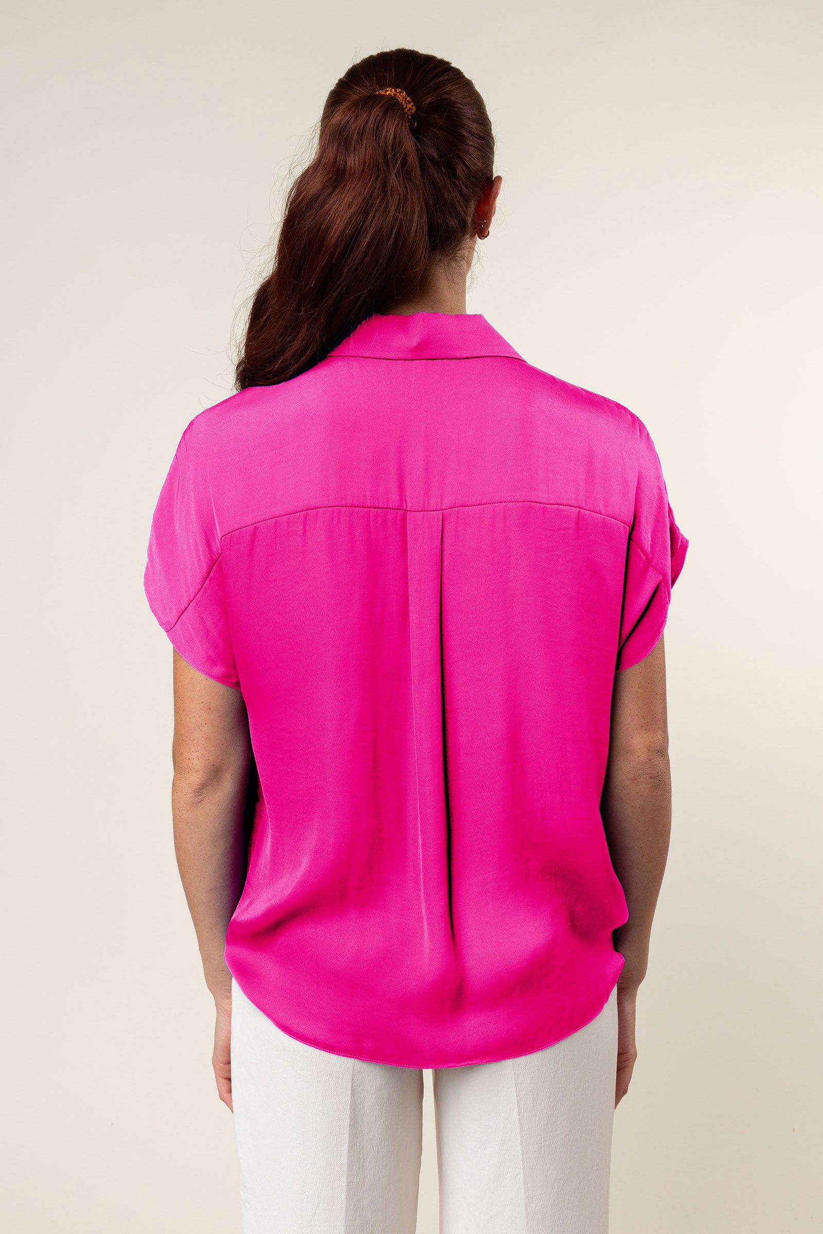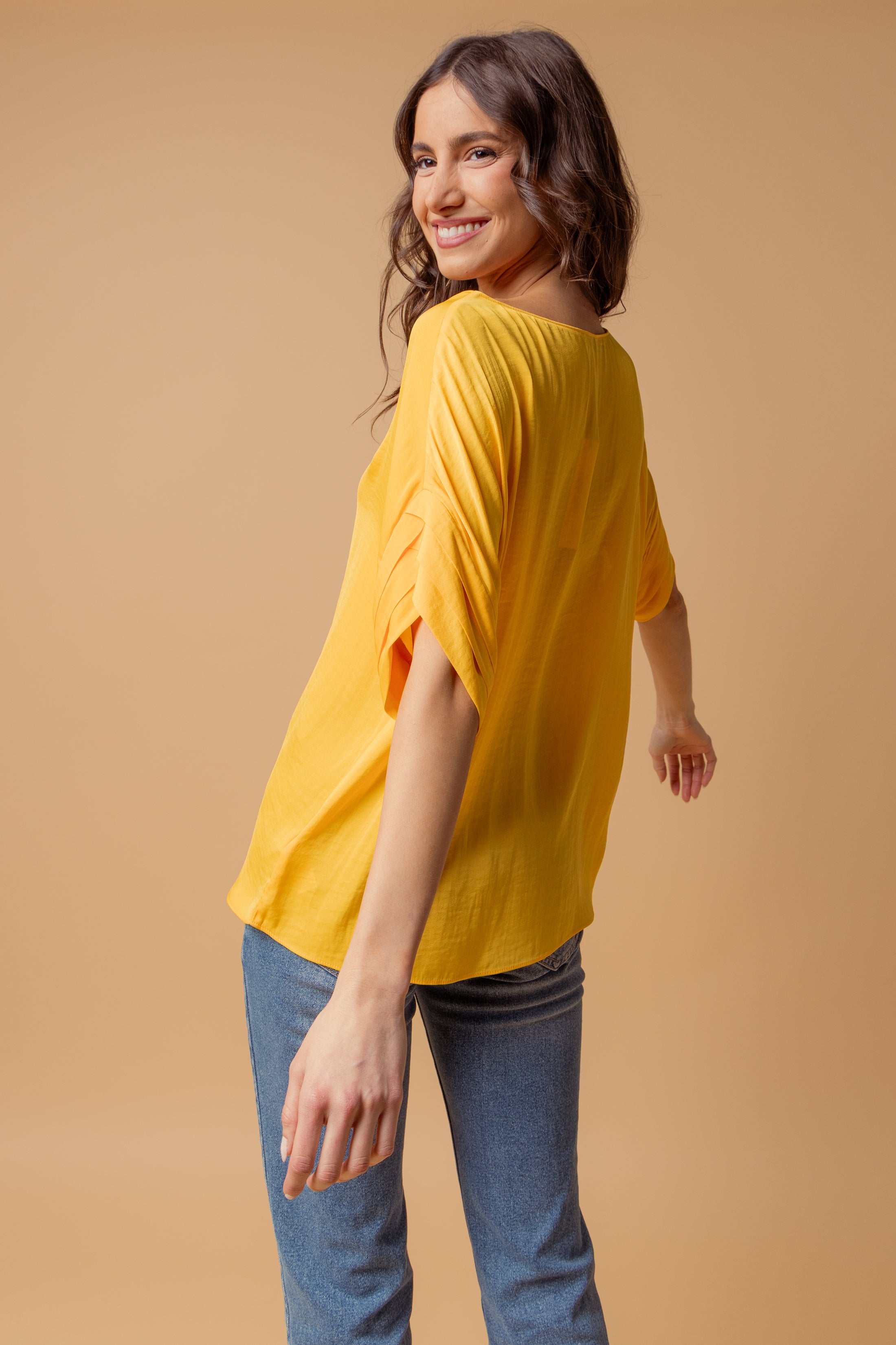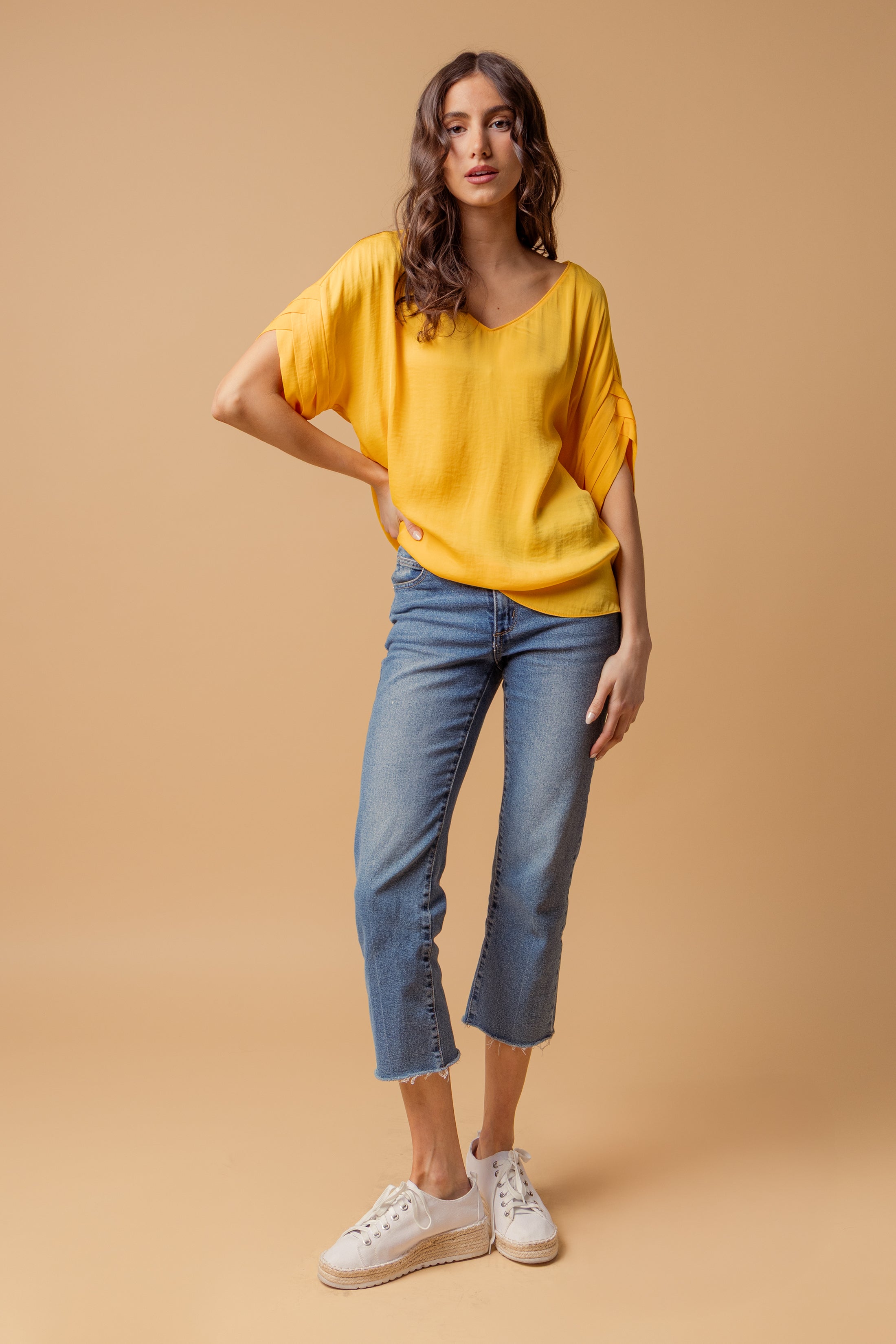 V-Neck Satin Top With Self Bands Sleeve Detail