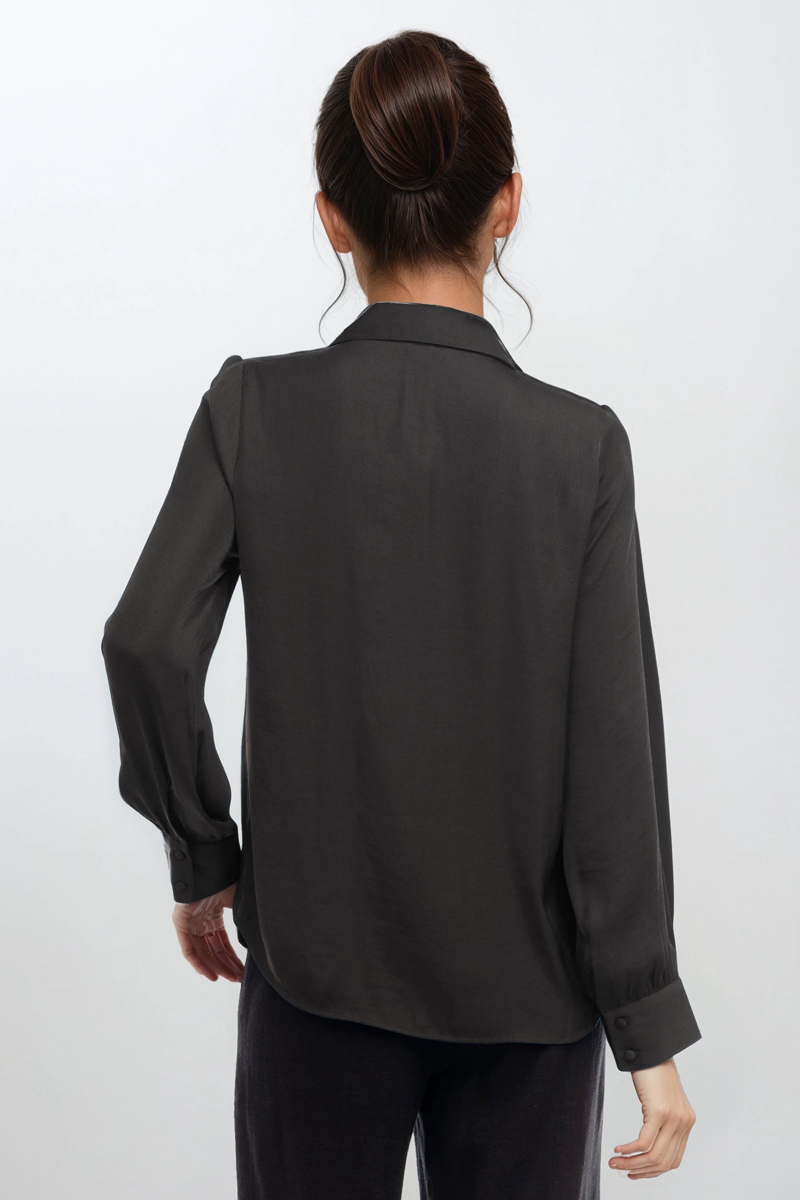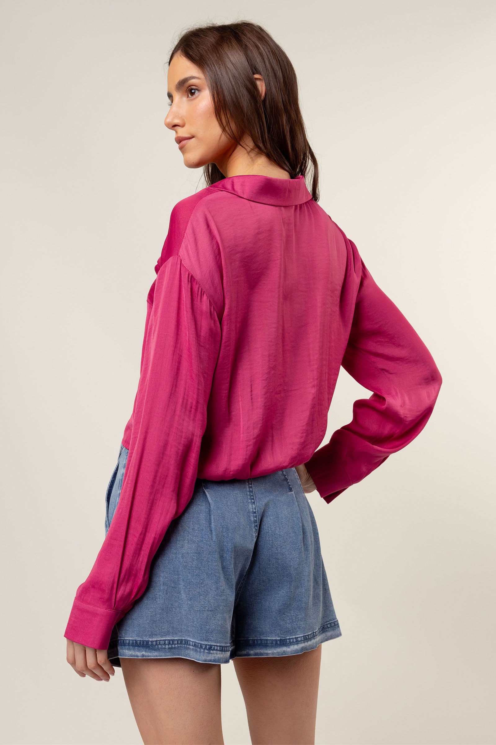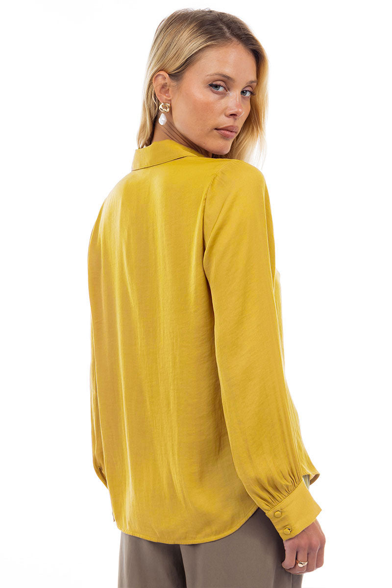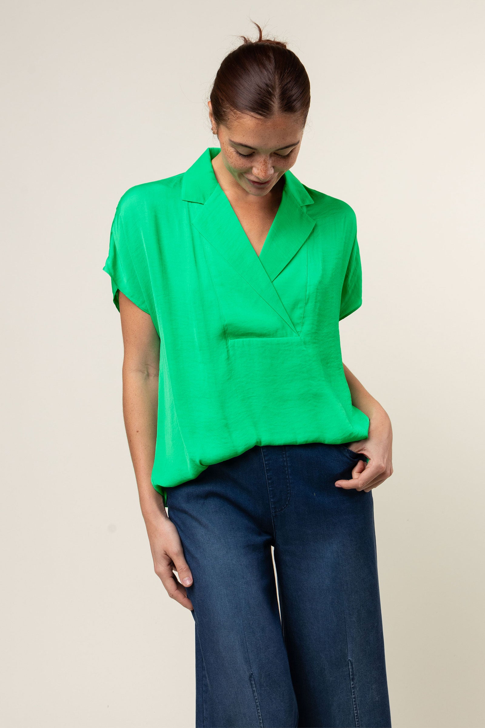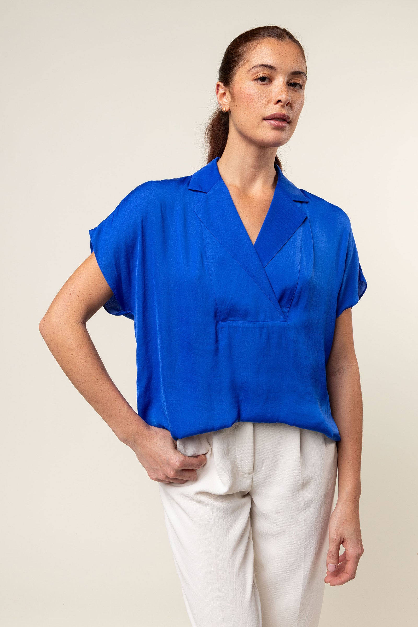 V-Neck Blouse With Bands Sleeve in Crinkle Satin