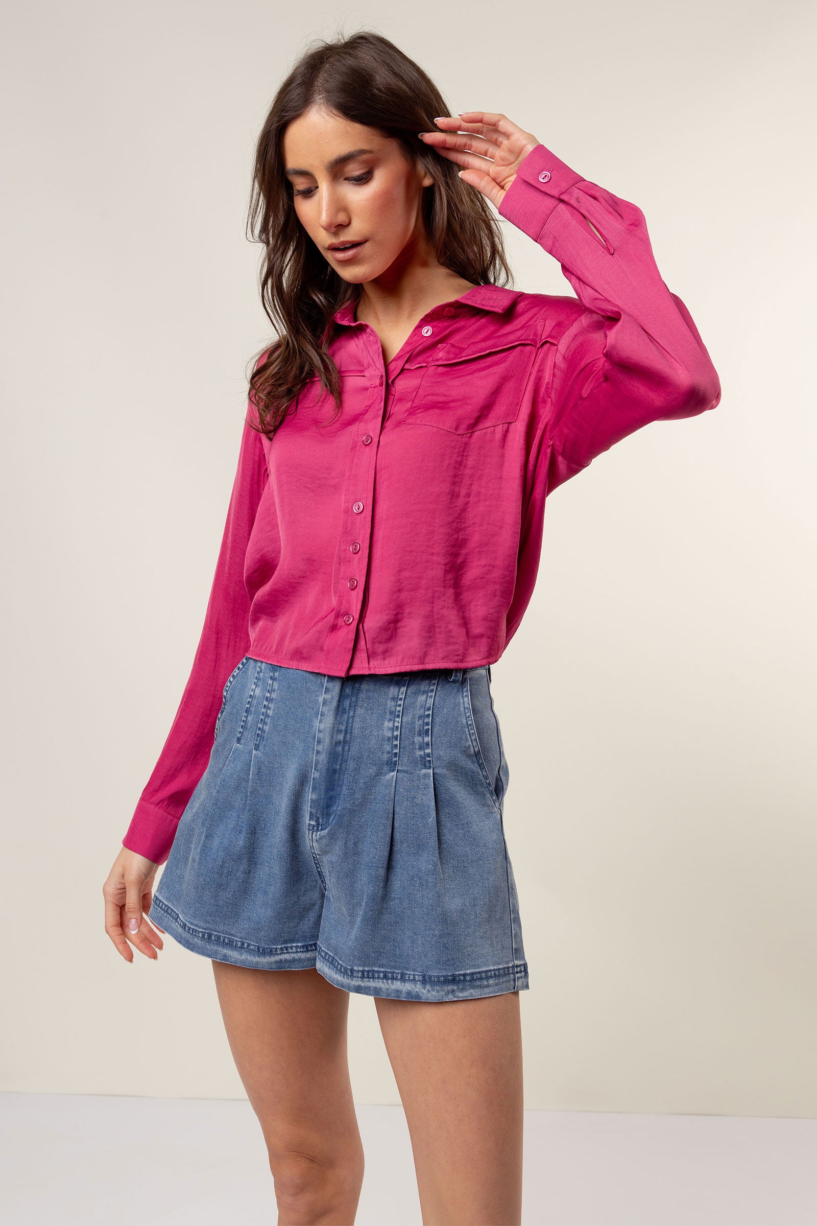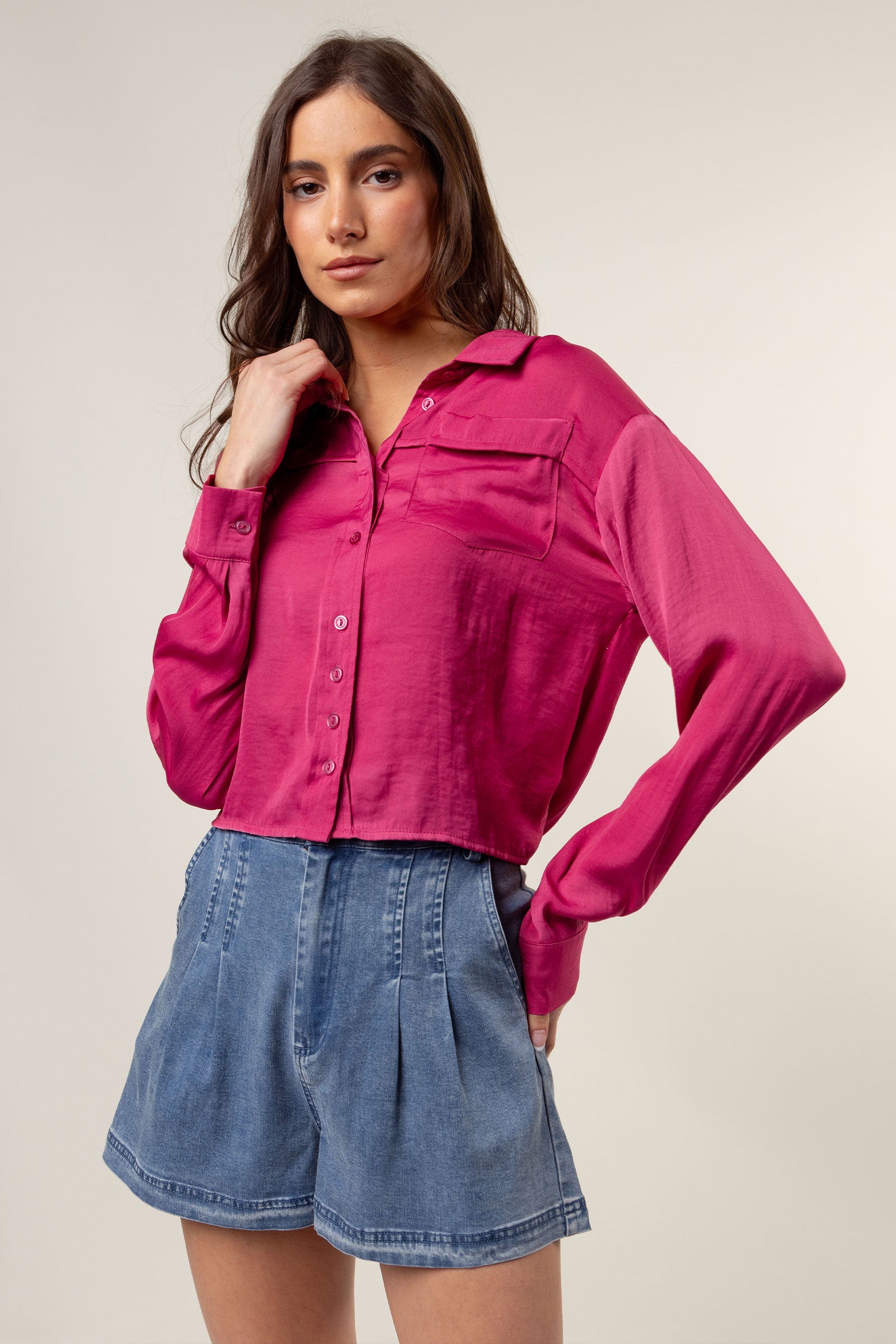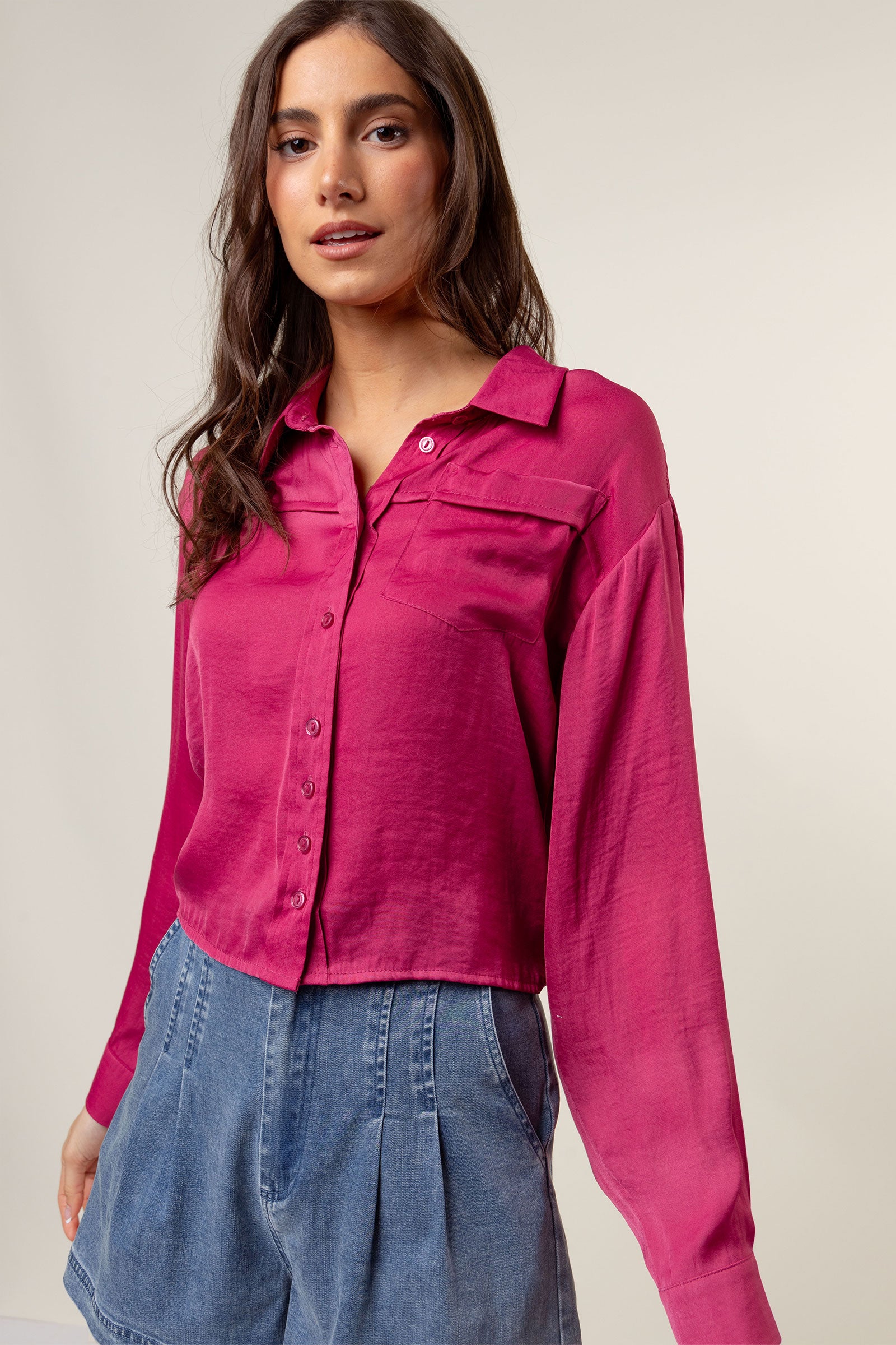 Cropped Button Down Blouse With Front Pocket