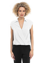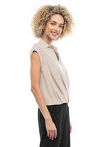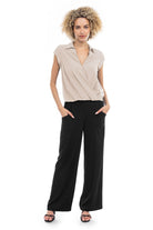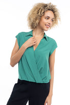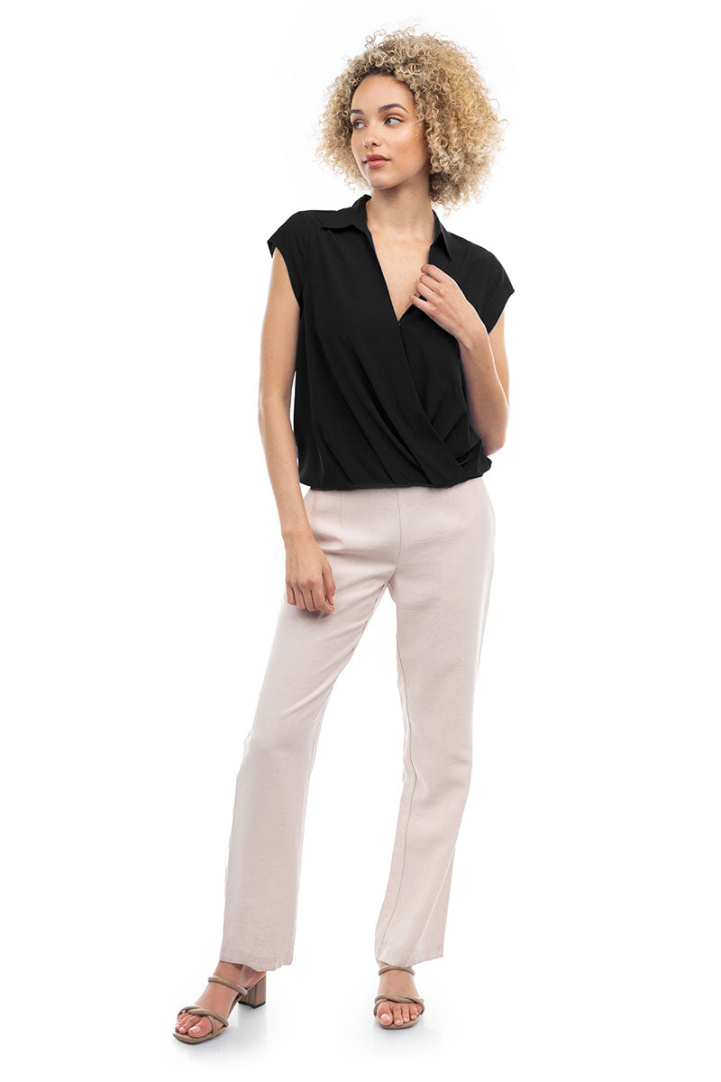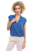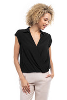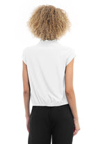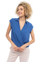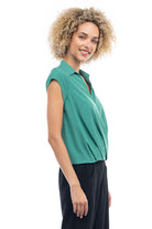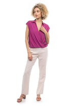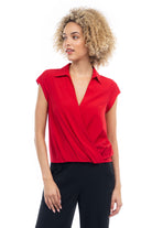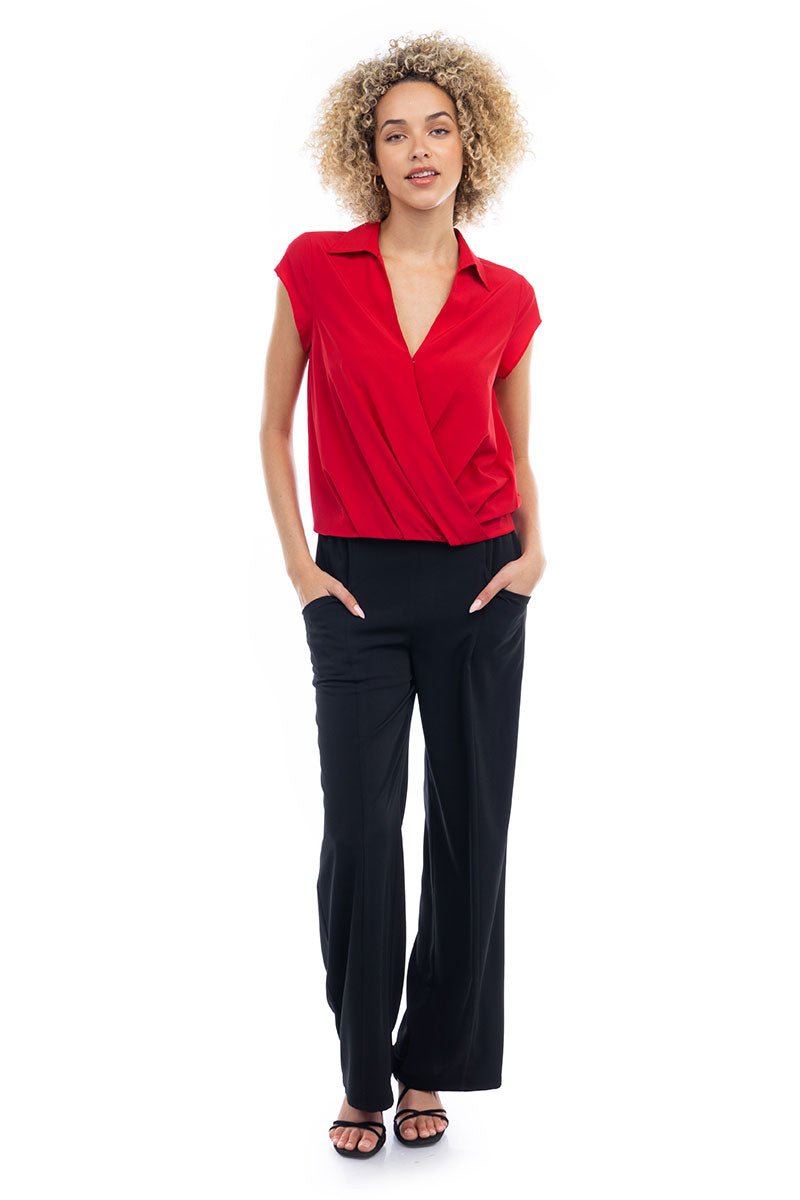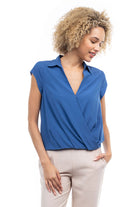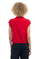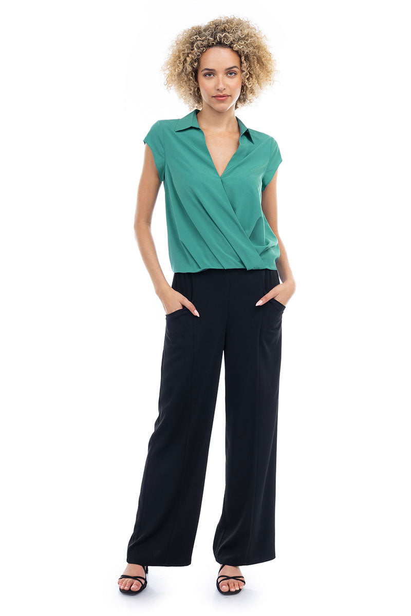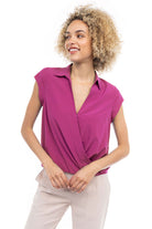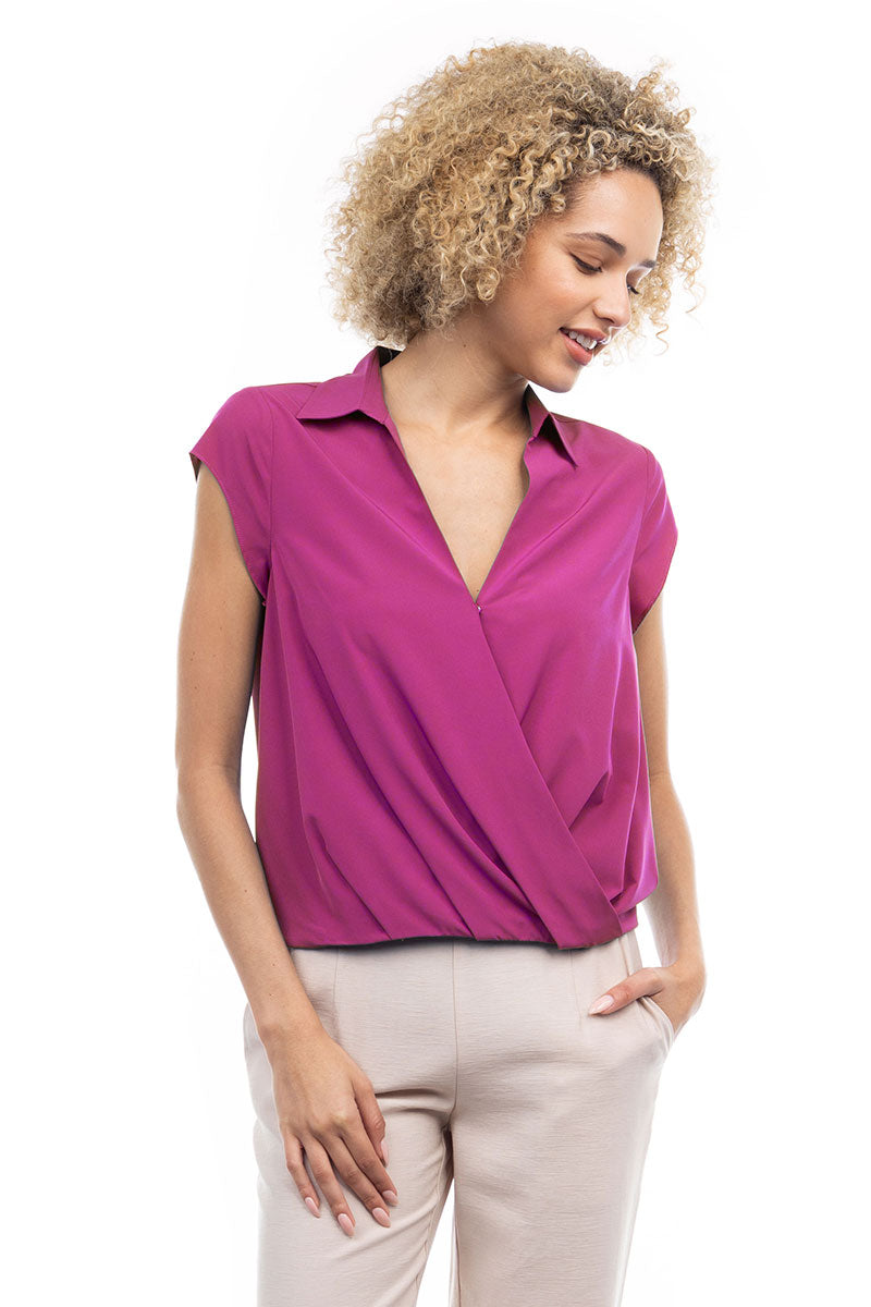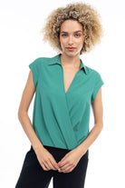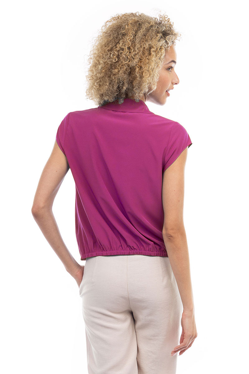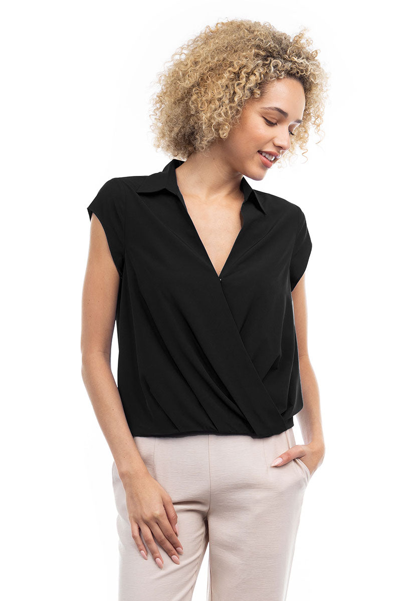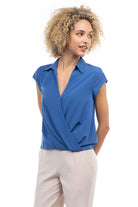 Elevate your ensemble with this cropped collared surplice top, featuring a stylish surplice neckline and a flattering elastic band at the waist. Perfect for adding a touch of sophistication to your look, this top offers both comfort and style with its cropped silhouette and elastic waistband.