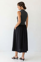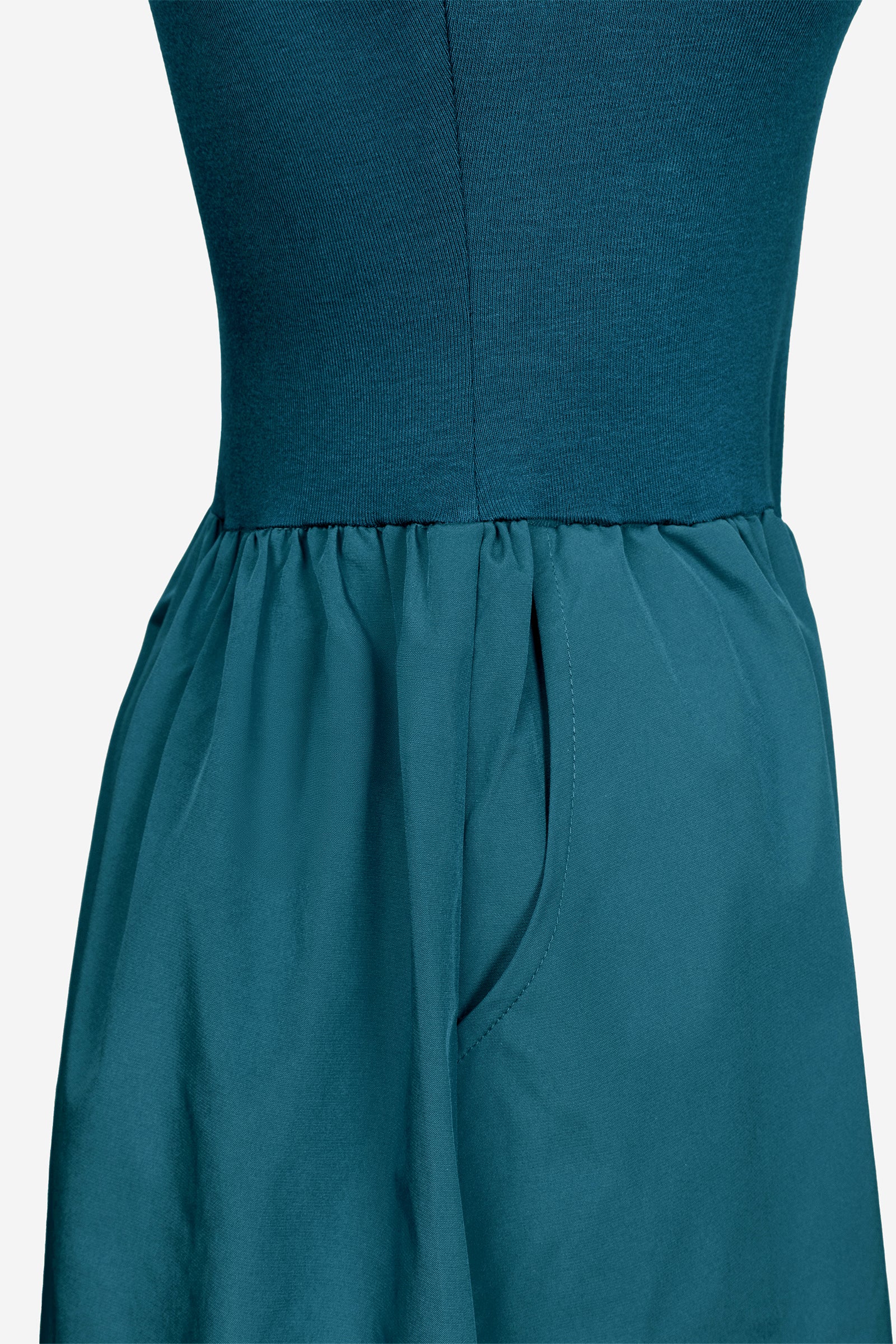╴Soft jersey knit bodice meets an elegant woven skirt for a refined silhouette
