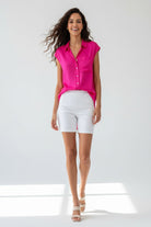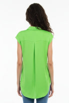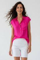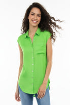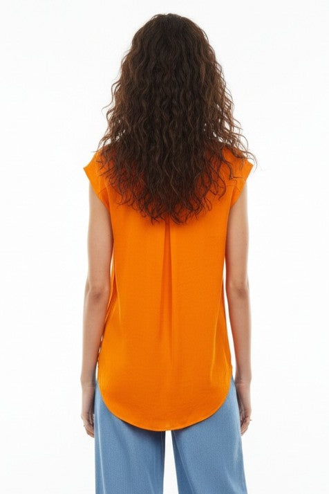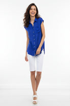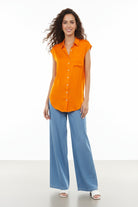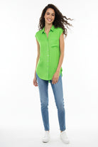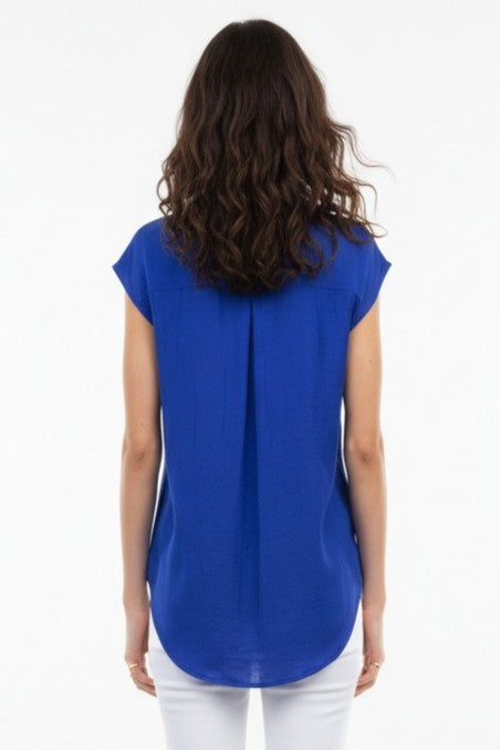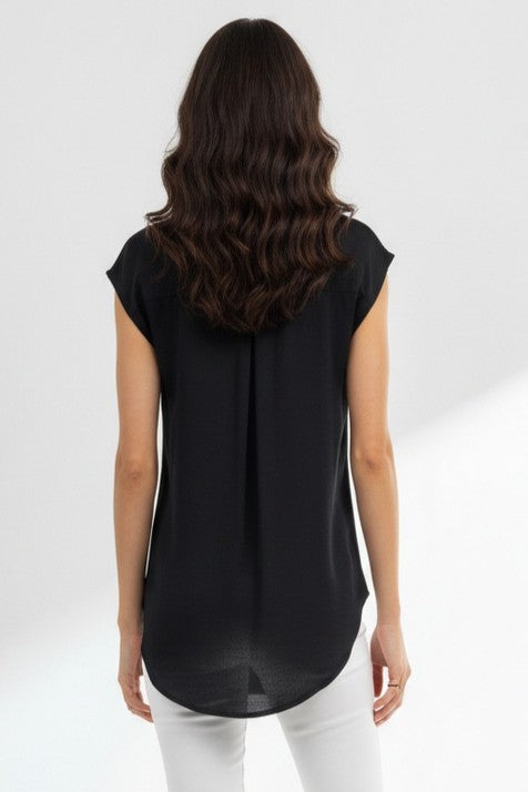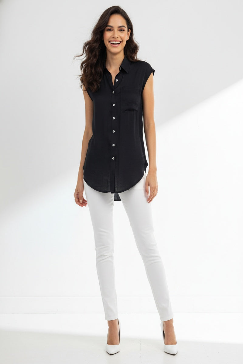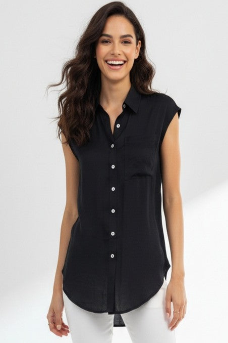 This sleeveless button-down tunic features a classic collar and front pocket, adding functional yet stylish elements to its design. Perfect for layering or wearing alone, it effortlessly combines comfort with versatility for a timeless look.
